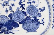 The centre painted in underglaze blue with a jardinière issuing chrysanthemum, peony and lotus blossoms, the flowers rendered in fine tonal washes with confident brushwork. The cavetto bordered by a continuous floral scroll, the octagonal rim further enriched with alternating reserves of flowering sprays and geometric diaper panels. The reverse plain, with a neatly finished footrim. Hand-painted throughout in cobalt blue of good clarity.