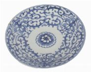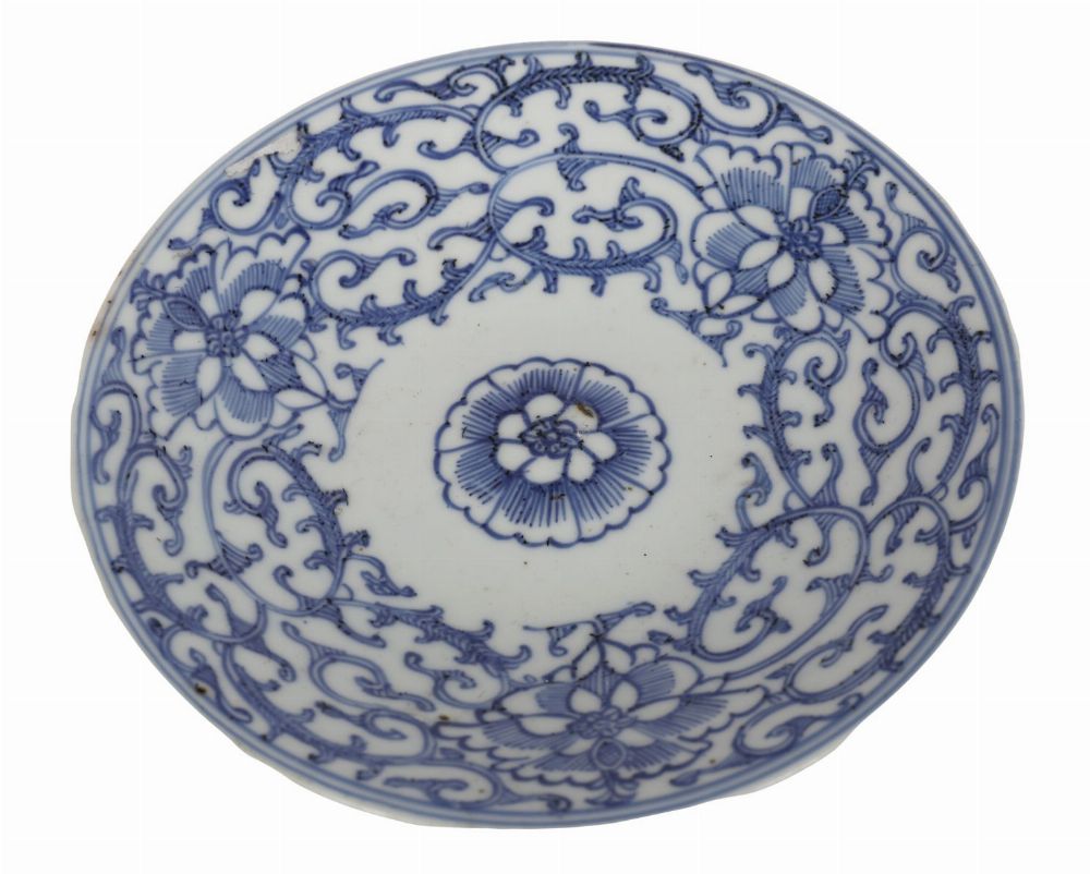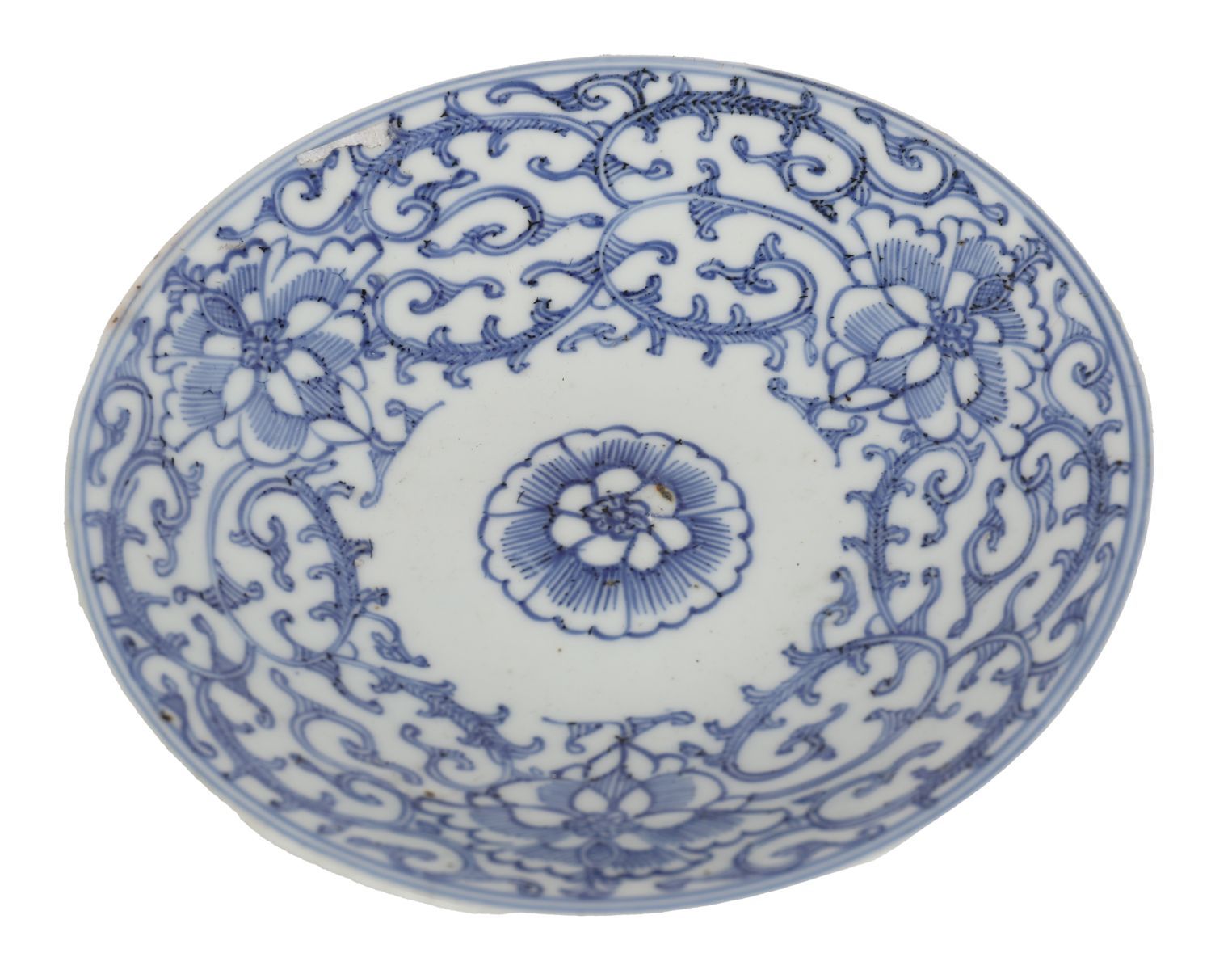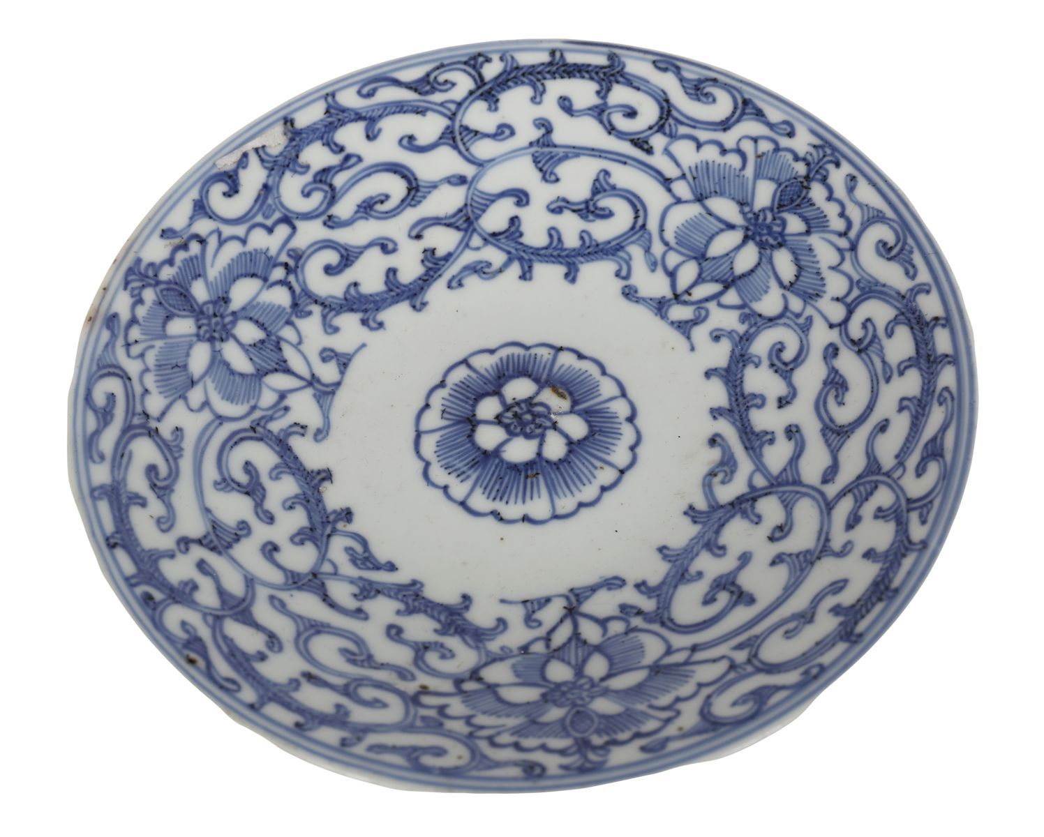 A Chinese blue and white porcelain plate, decorated with scrolling foliage and floral medallions.