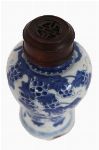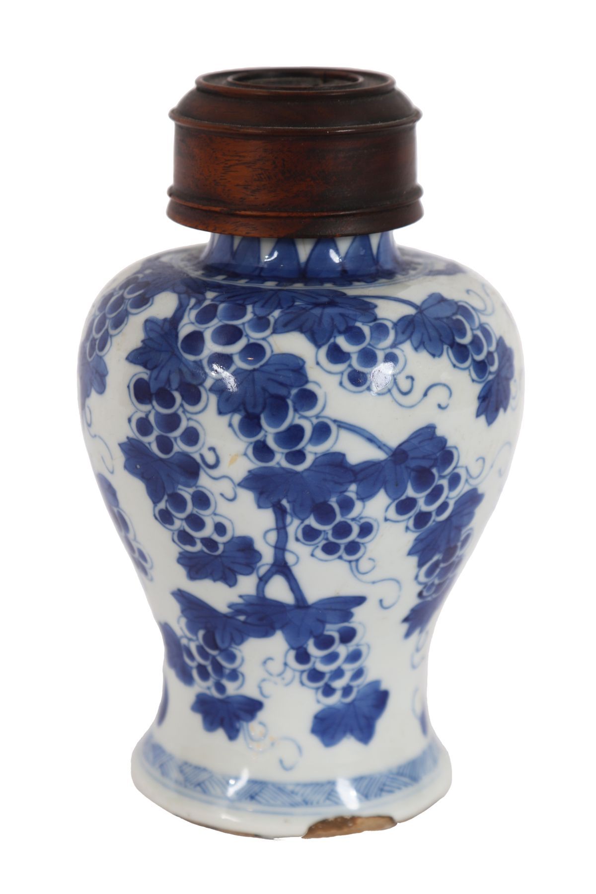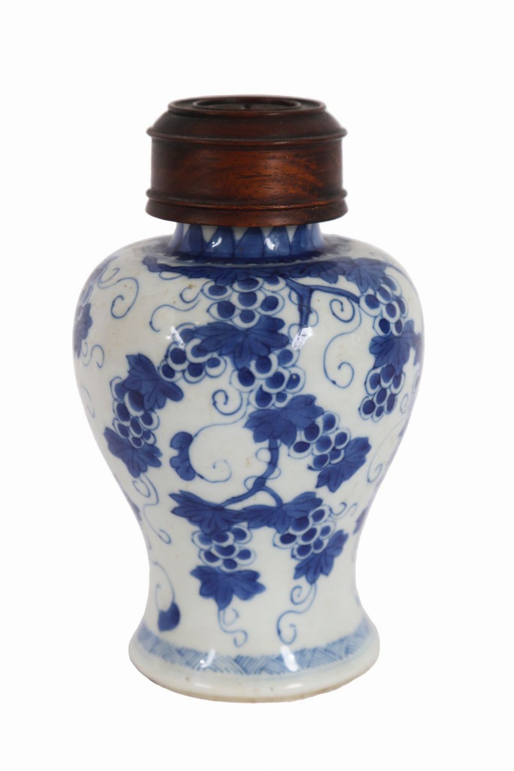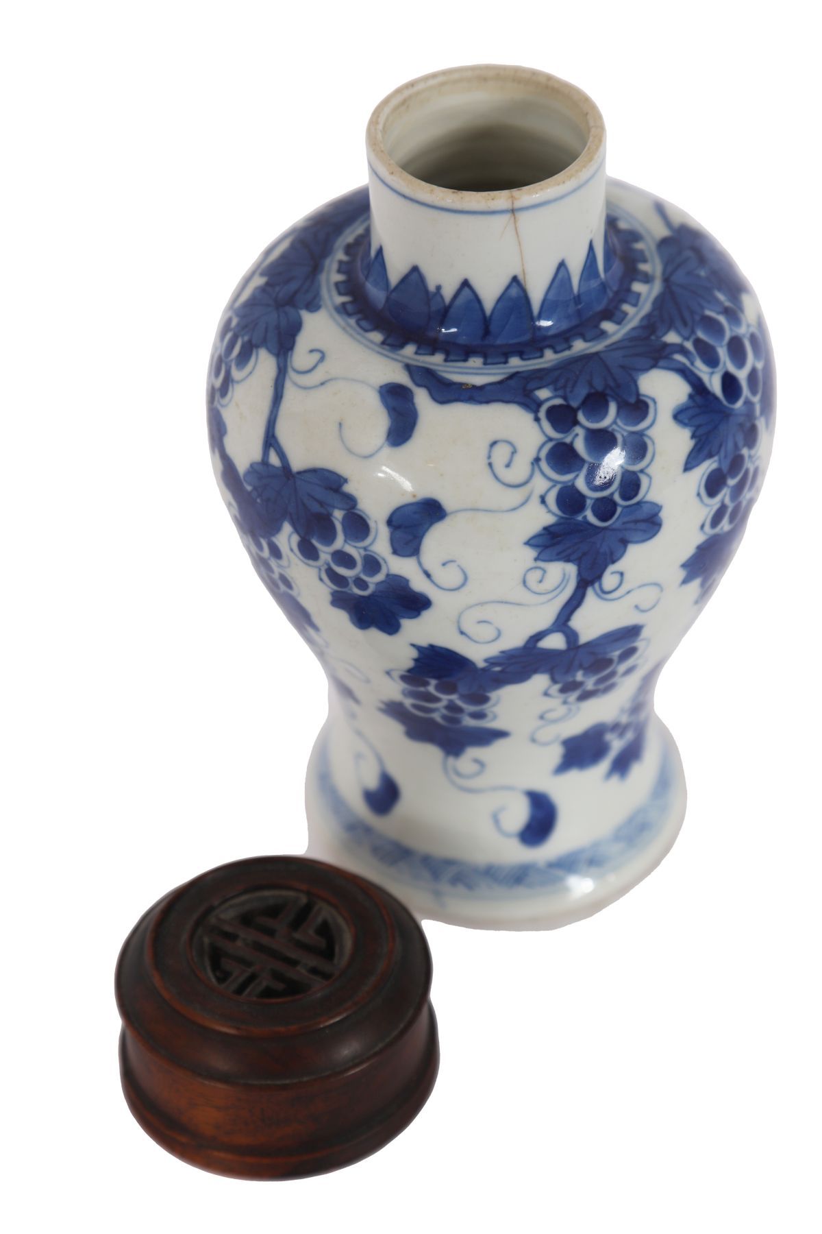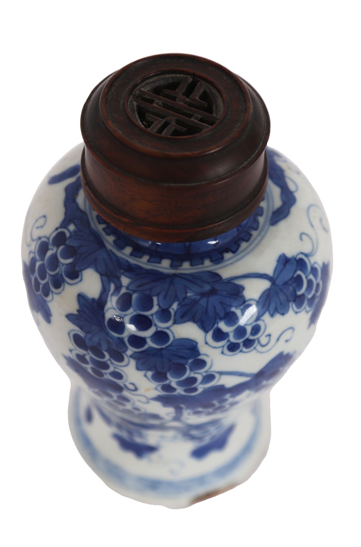 Painted in underglaze blue with continuous scrolling grapevine and fruiting clusters, the gently swelling baluster body rising to a cylindrical neck with lappet border, raised on a spreading foot with geometric band, the interior with concentric blue rings, complete with a carved hardwood cover.