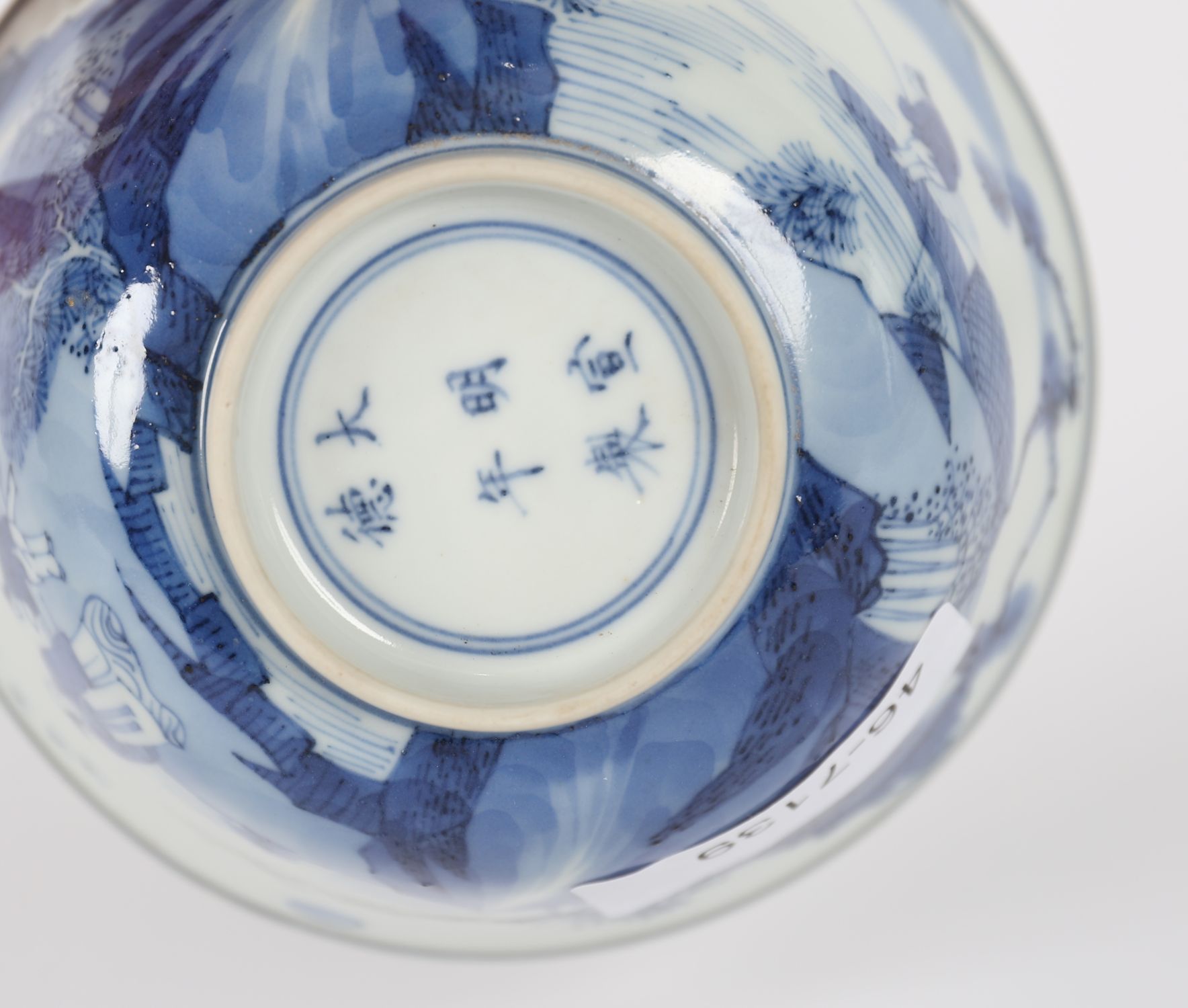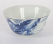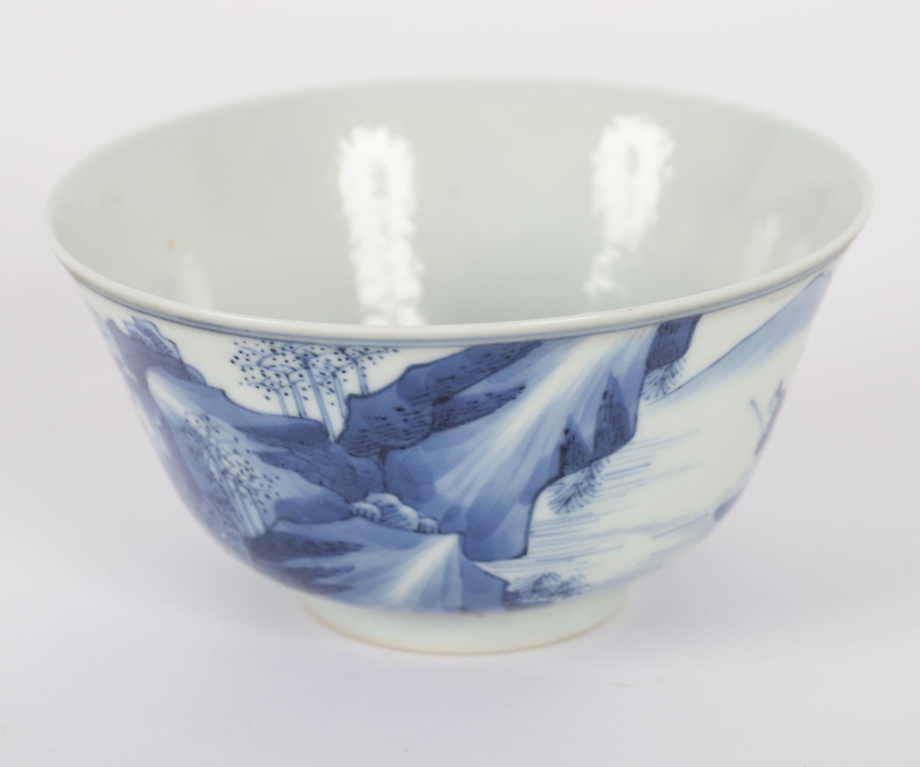 A finely painted Chinese blue and white porcelain bowl, decorated with an extensive continuous figural landscape scene featuring scholars in conversation within a garden pavilion setting. The interior base with a mountain landscape medallion. The base bears a six-character Da Ming Chenghua mark within a double ring.