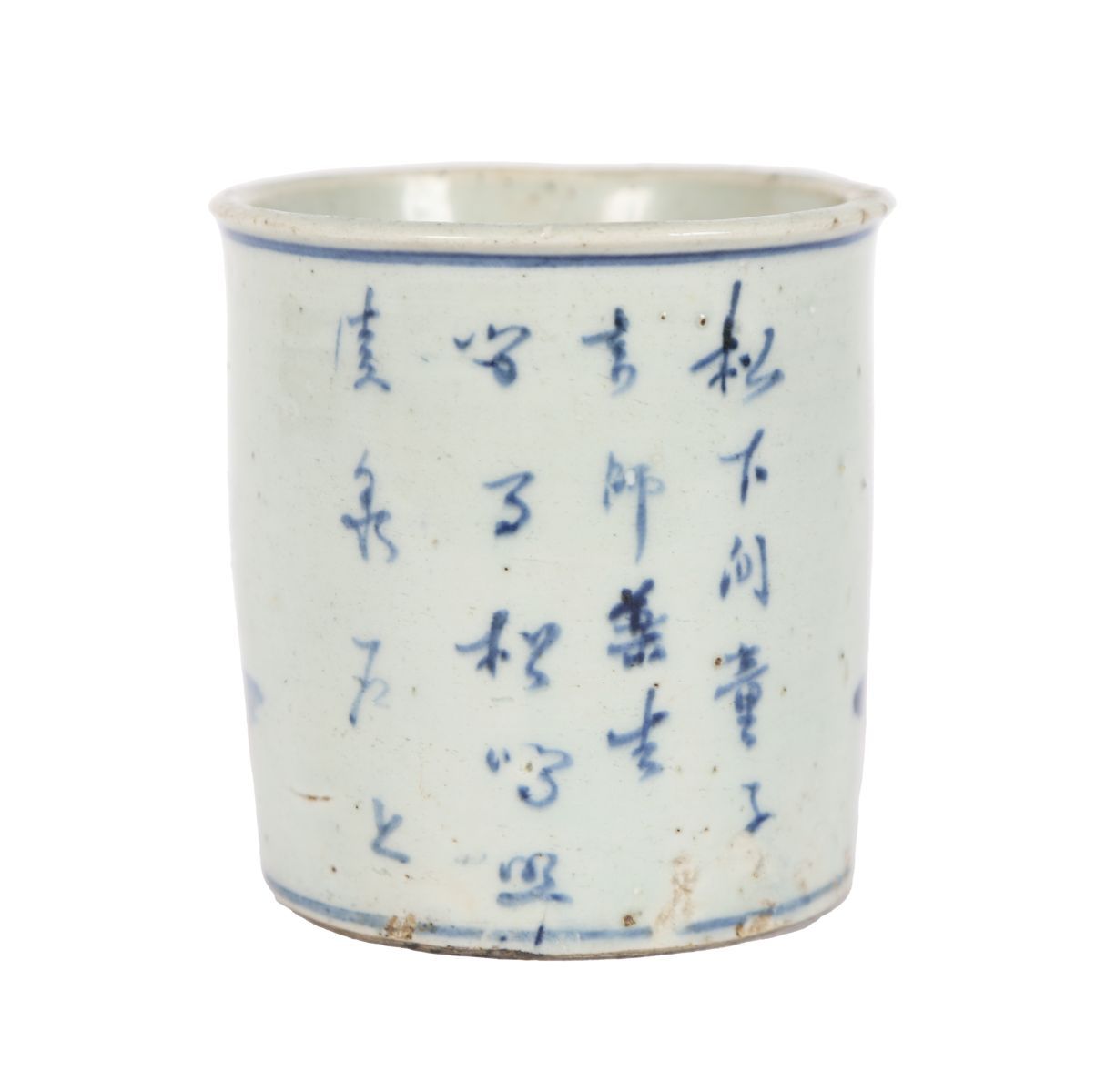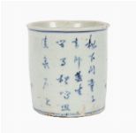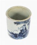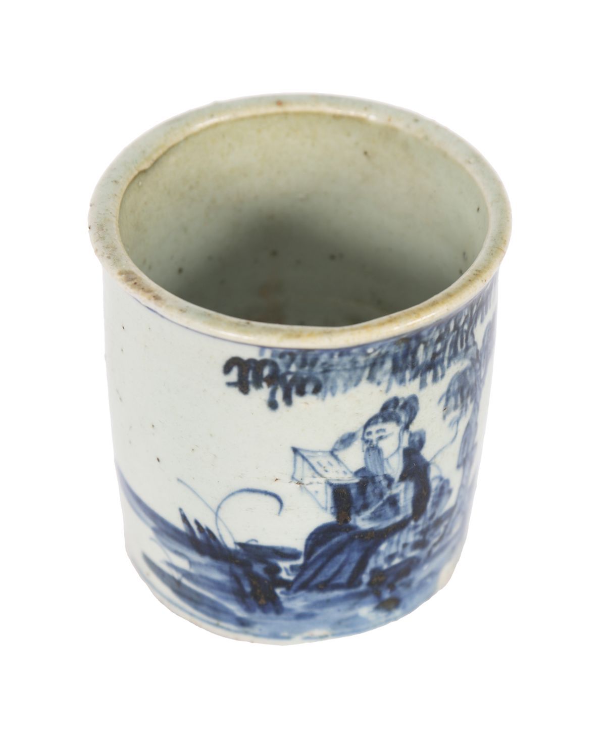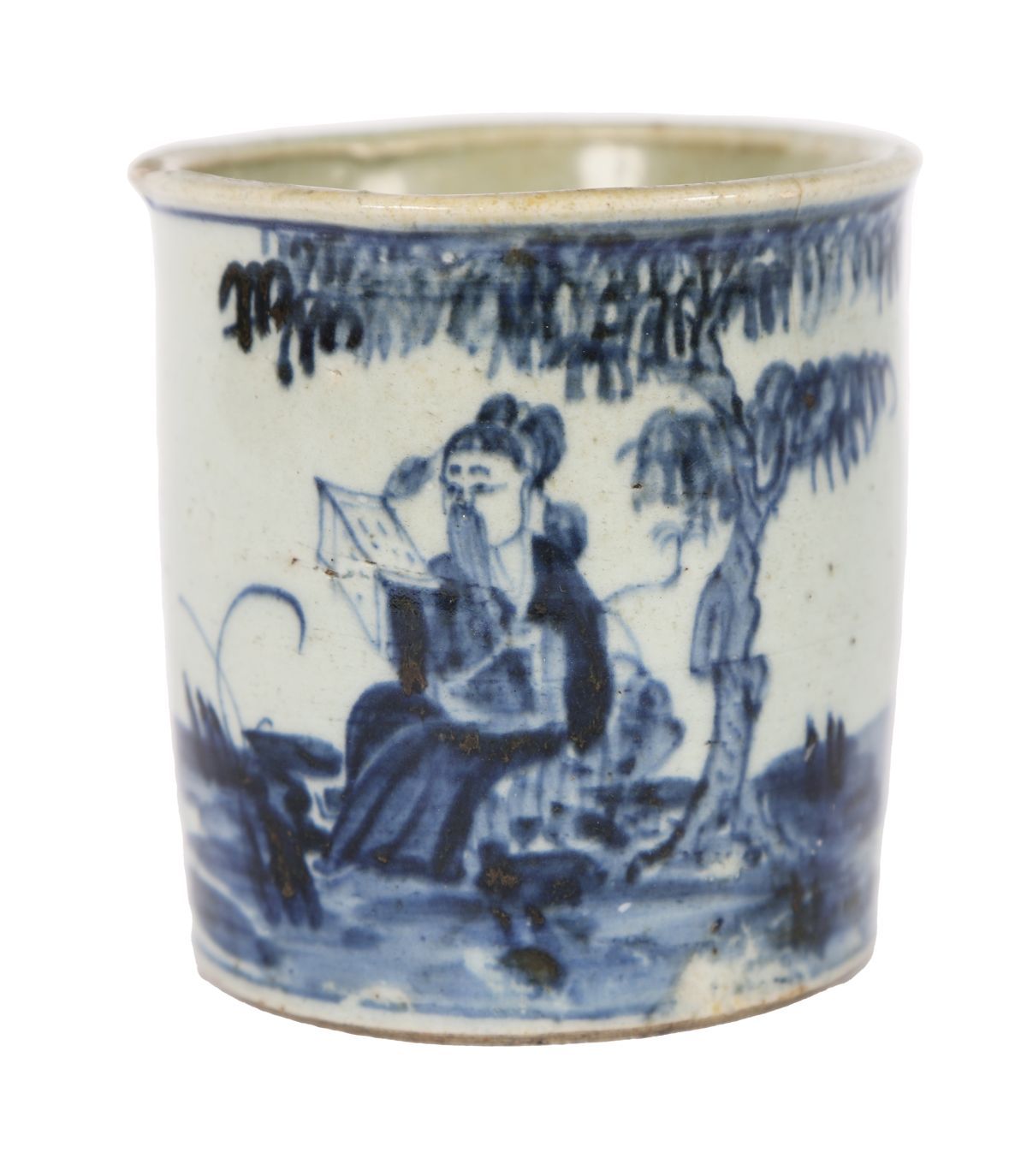 Of cylindrical form, painted in underglaze cobalt blue with a continuous figural landscape. One side depicts a scholar seated in a rocky garden setting, reading from a book beneath overhanging foliage, with attendants nearby; the reverse painted with a vertical calligraphic inscription in Chinese characters. The decoration is executed in fluid, expressive brushwork with varied cobalt tones, typical of mid-17th-century wares. The interior is plain and glazed; the base with a recessed foot rim, glazed centre and kiln grit adhering.