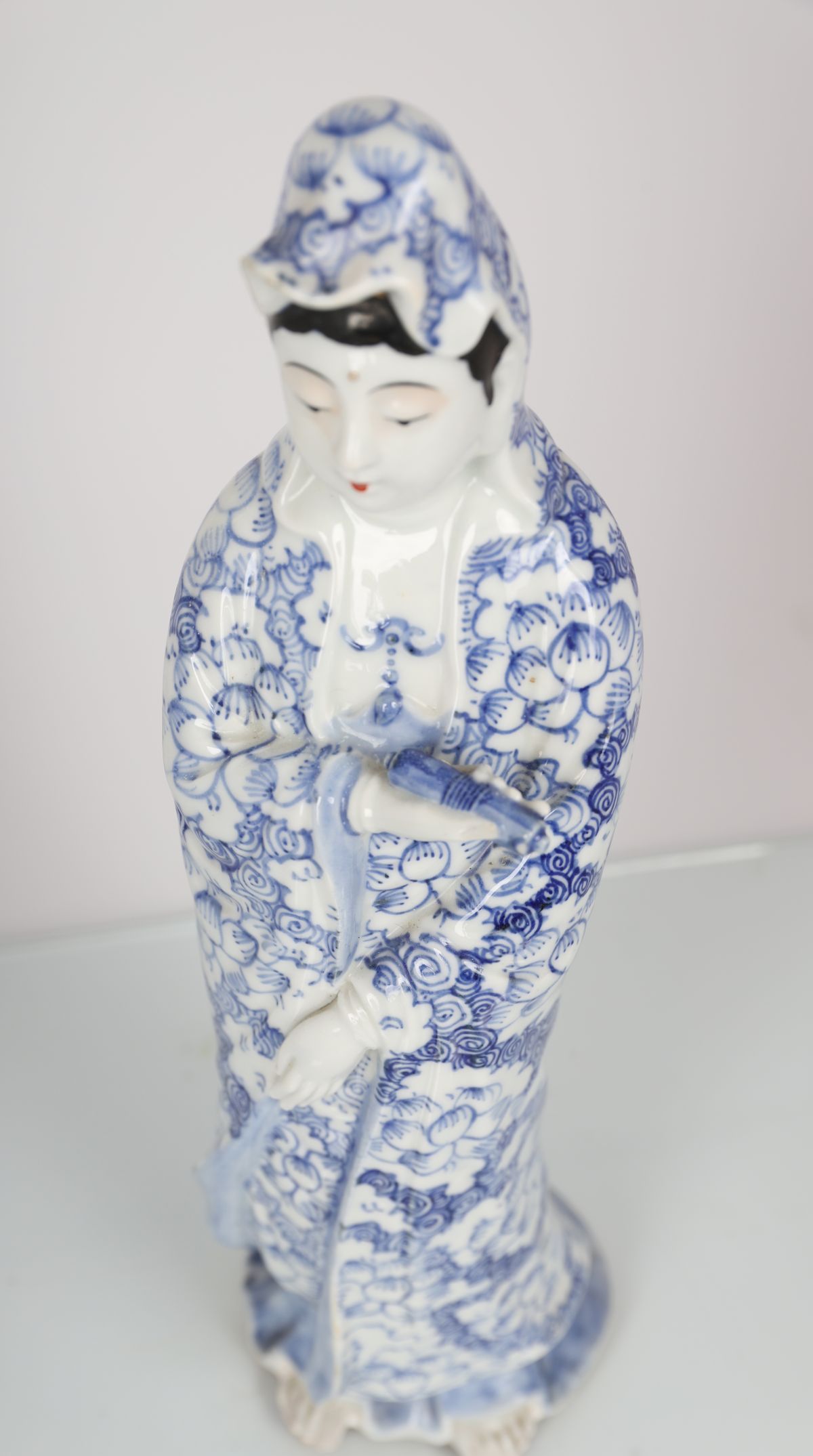 a finely modelled porcelain figure of Guanyin, the Goddess of Mercy, depicted standing barefoot and robed in flowing garments decorated with underglaze blue floral scrollwork. The serene face is delicately painted with black and red enamels.