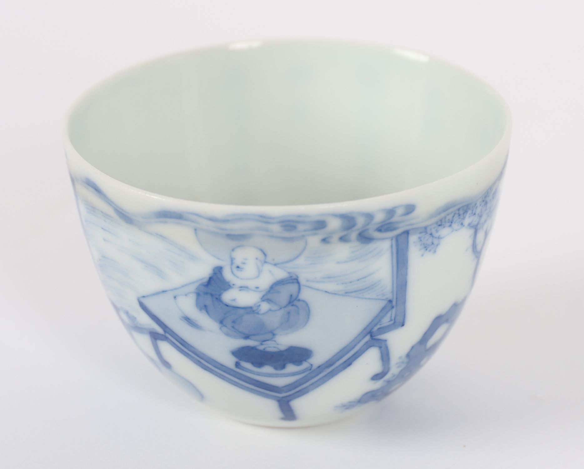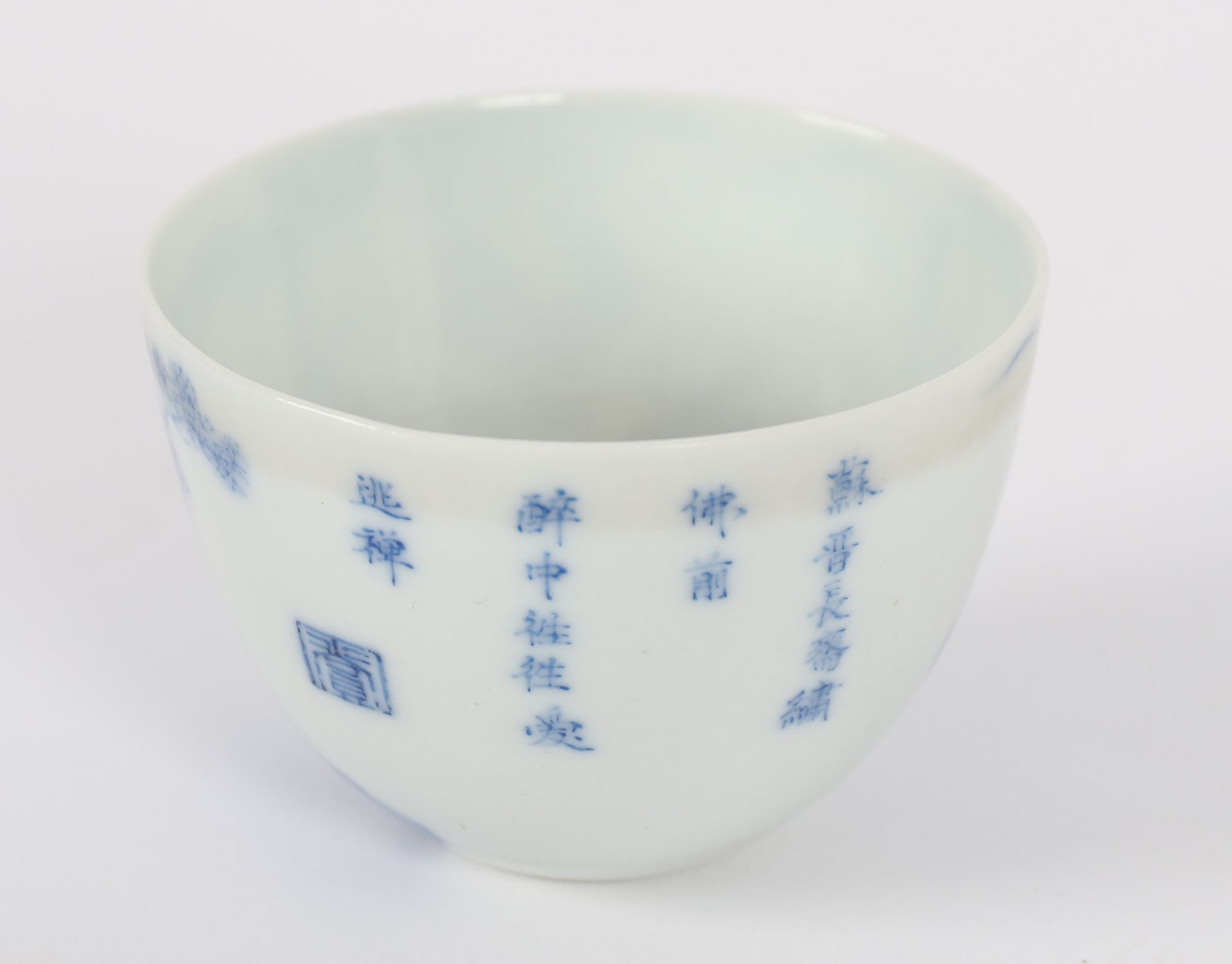 A finely potted Chinese porcelain tea bowl, decorated in underglaze blue with a continuous interior scene depicting a scholar seated at a table. The reverse bears a poetic inscription in calligraphy, and the base is marked with a four-character Tianqi Nian Zhi reign mark. Qing dynasty, in late Ming revival style.