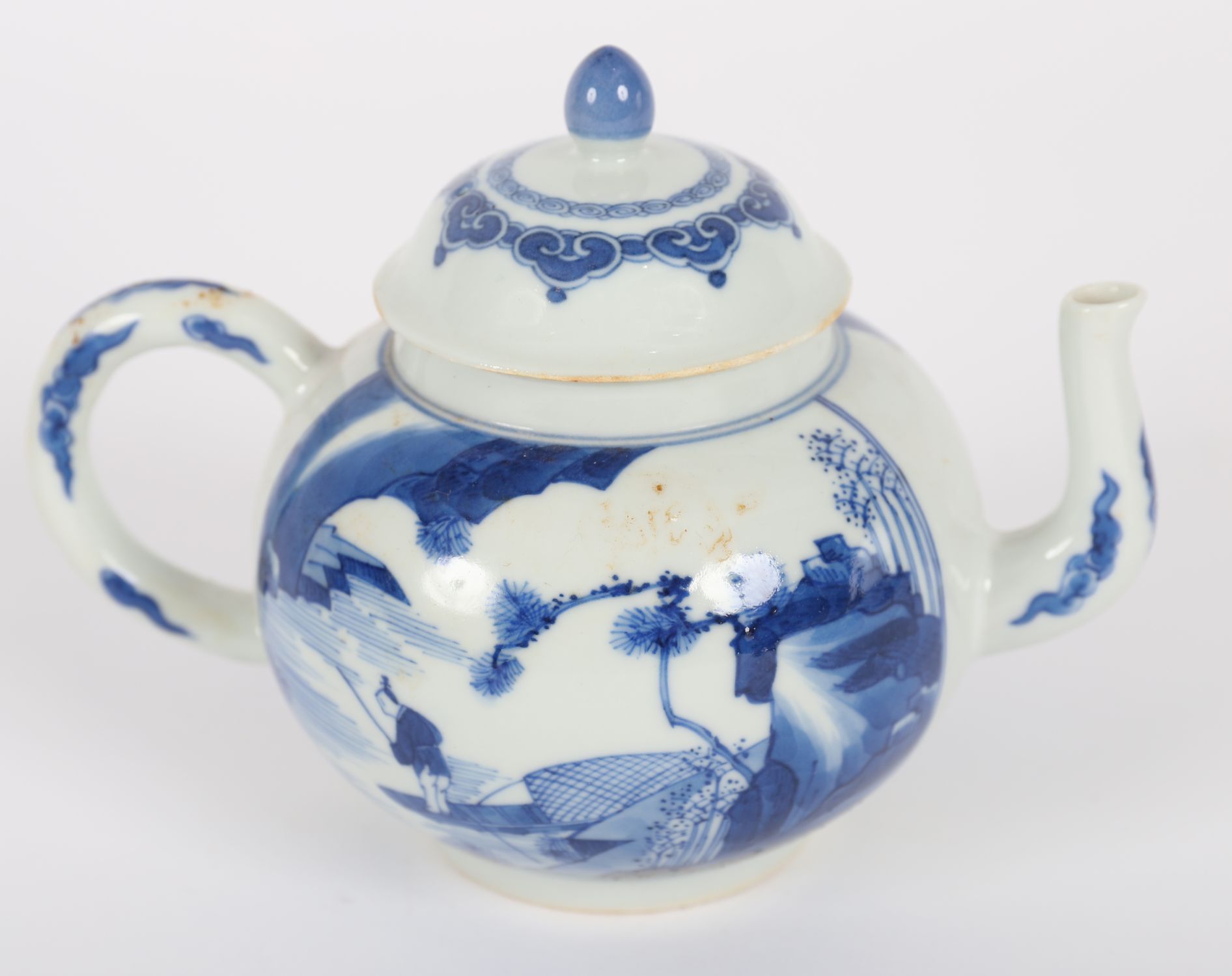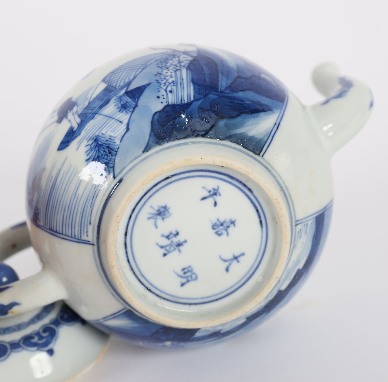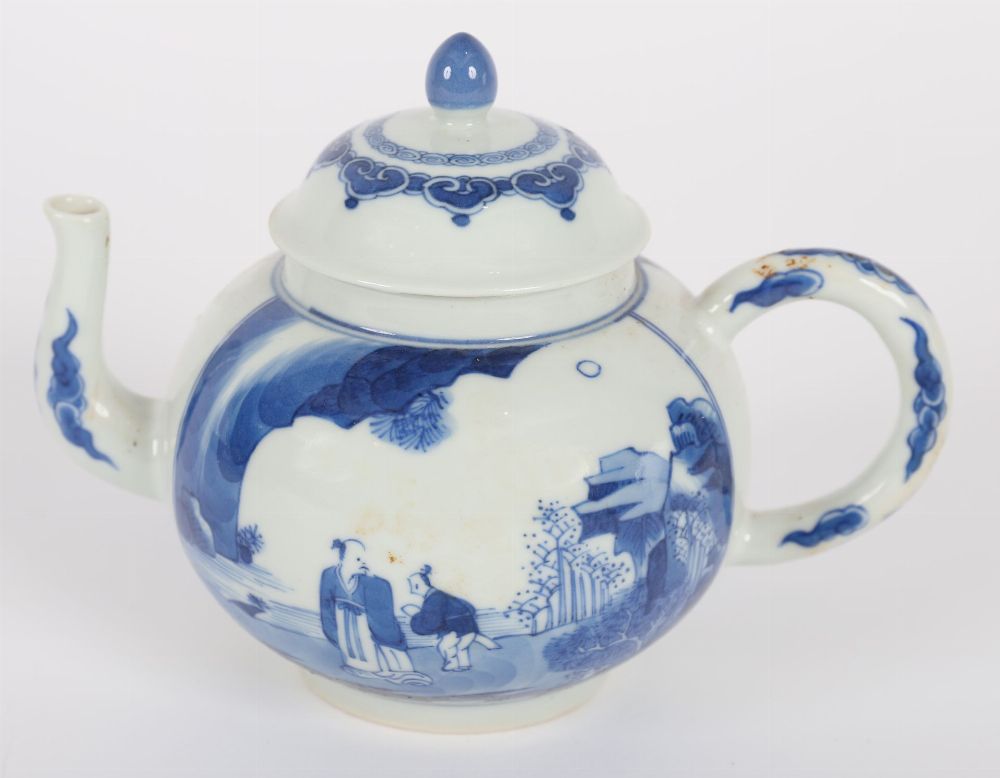 A Chinese blue and white porcelain teapot of globular form, decorated with a continuous figural landscape scene depicting scholars and attendants in a garden setting. The domed lid with pointed finial and ruyi-head border. Base with apocryphal six-character mark reading Da Ming Chenghua Nian Zhi