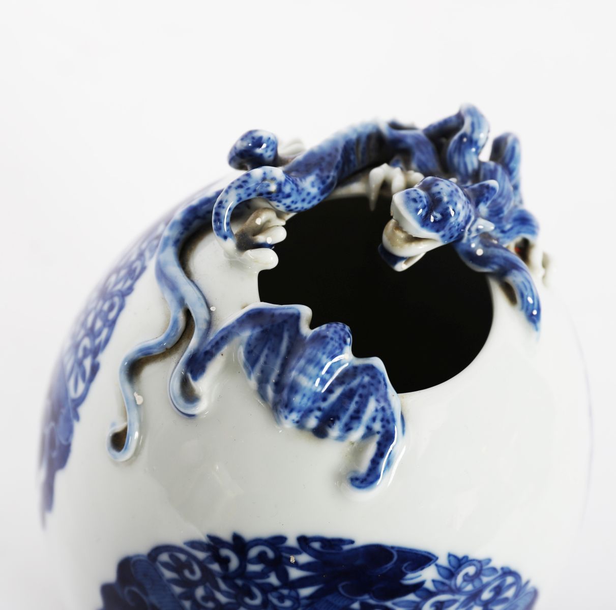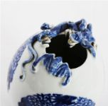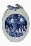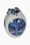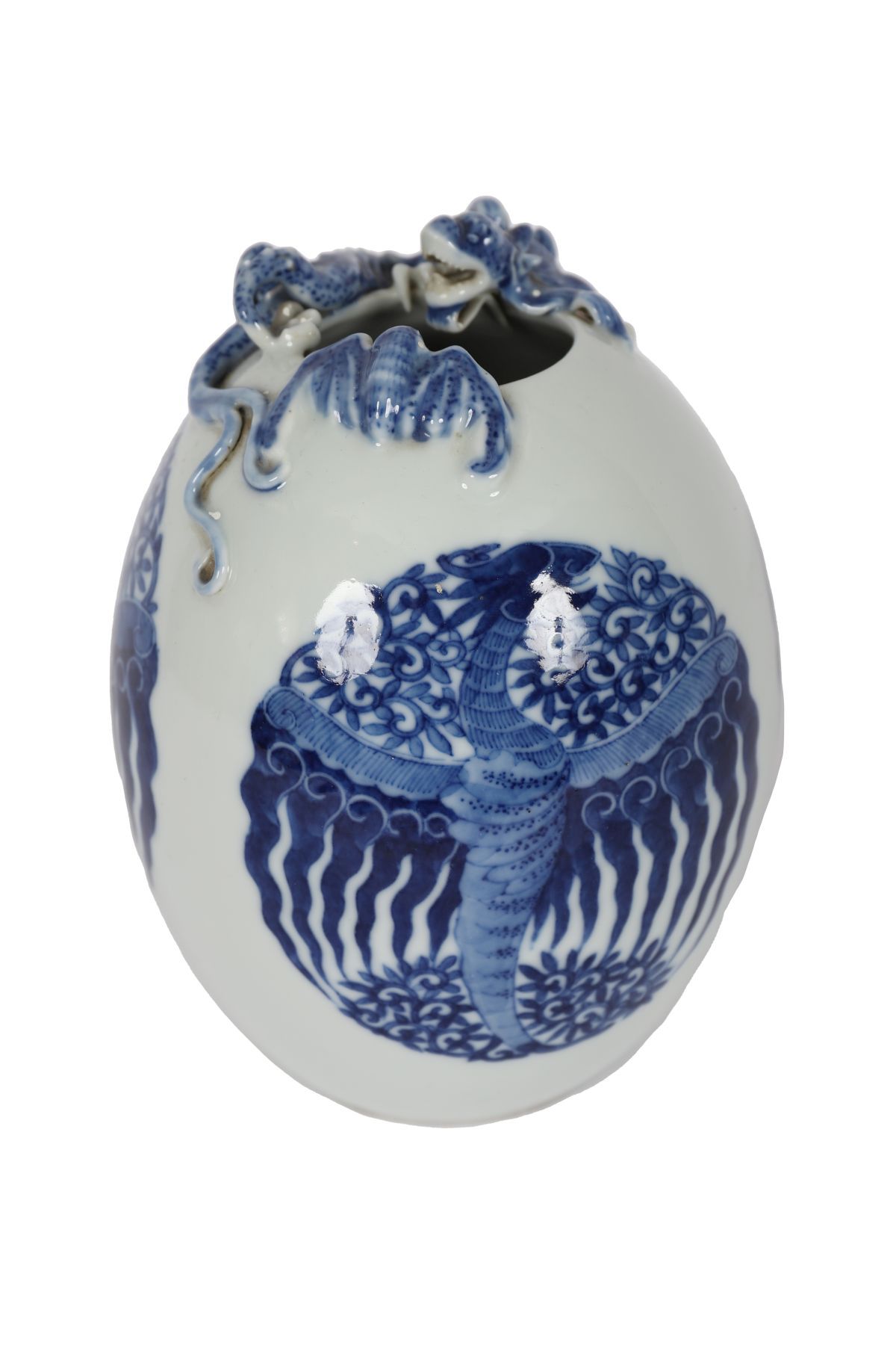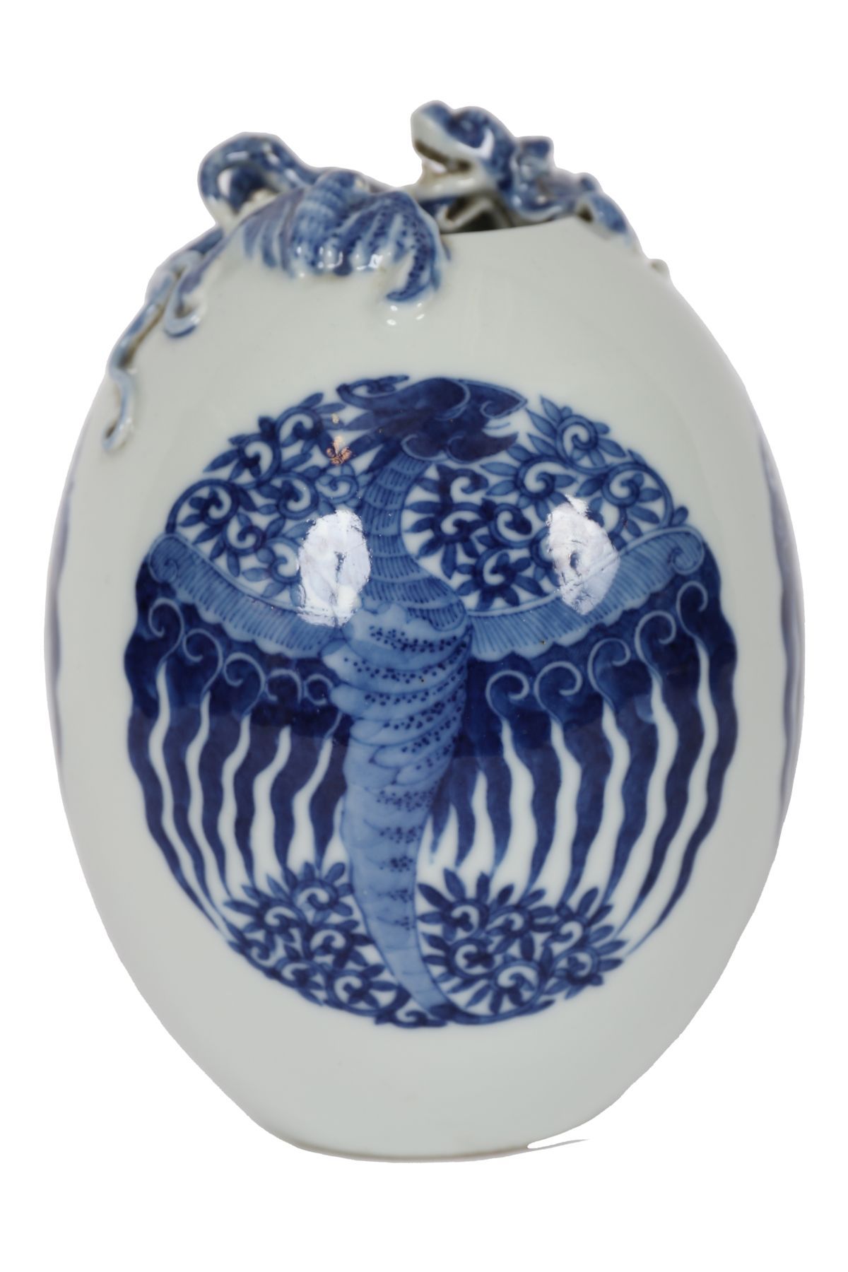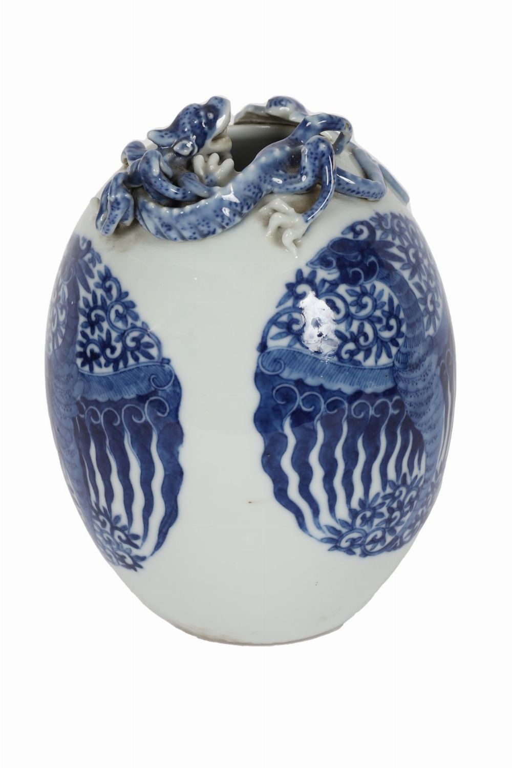 A Chinese porcelain egg-shaped vase, painted in underglaze blue with stylised wave and cloud motifs, the body centred with an oval cartouche enclosing a phoenix, the shoulder applied with a dragon and auspicious bat in high relief. The base bearing a blue six-character underglaze Qianlong reign mark