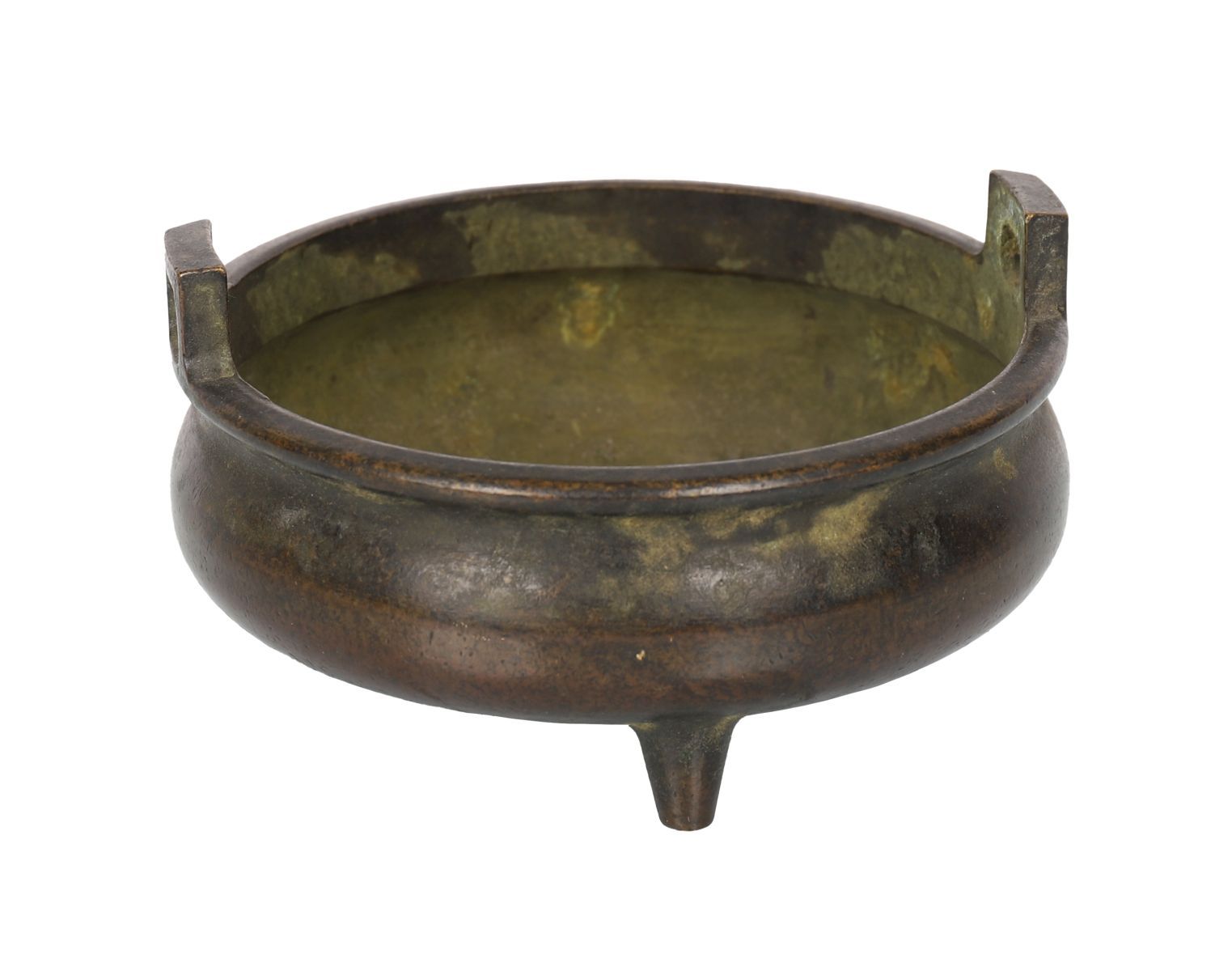 A circular bronze censer raised on three short feet with twin upright handles, the base bearing a six-character Xuande mark within a recessed panel. Retains traces of patination consistent with age.