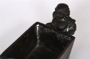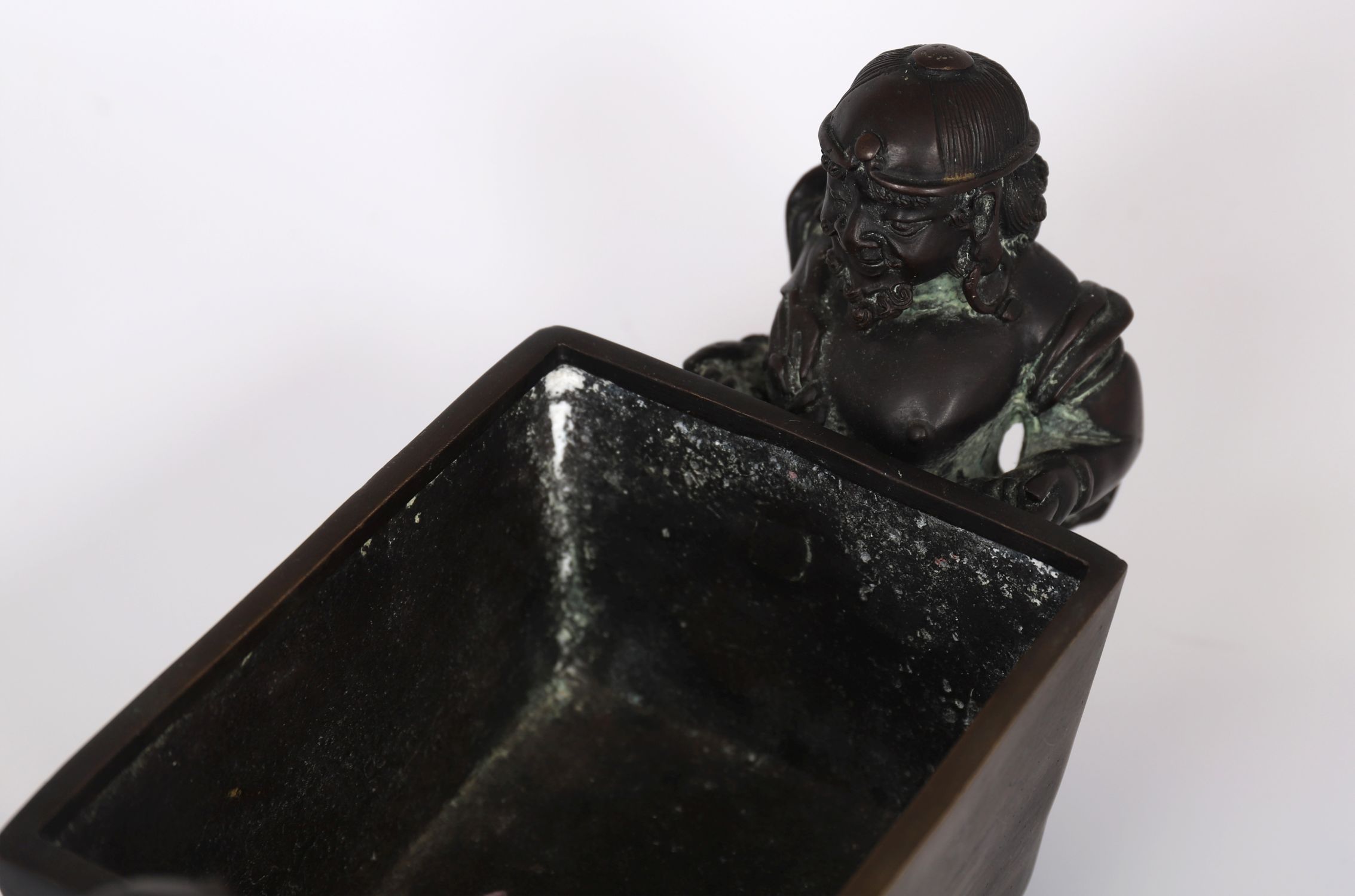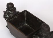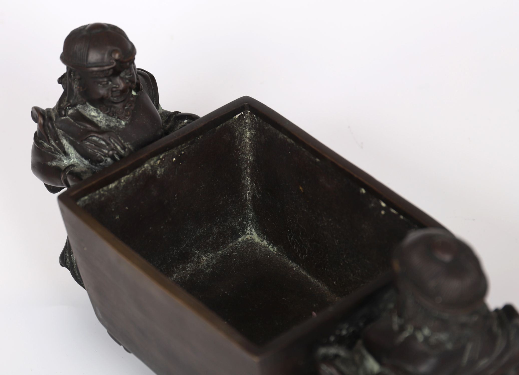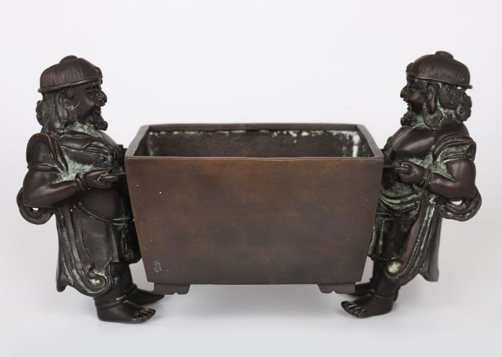 A rectangular bronze vessel supported at either end by cast standing figures in traditional attire, each grasping the vessel. Patinated surface with traces of verdigris.