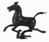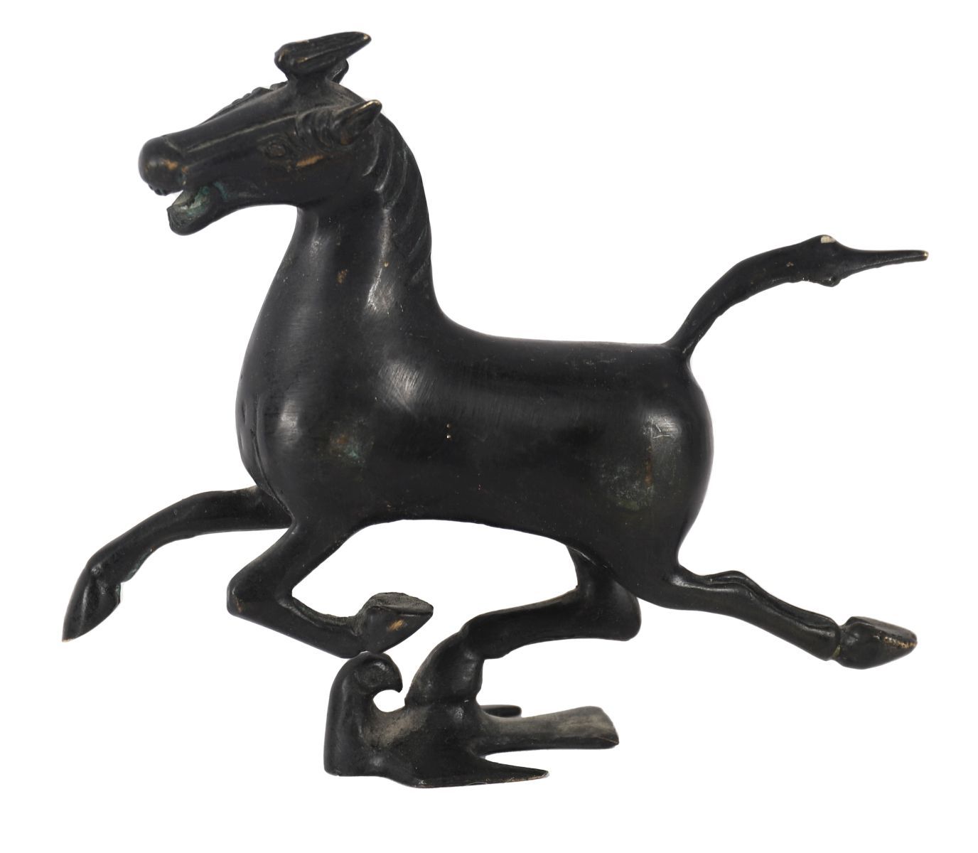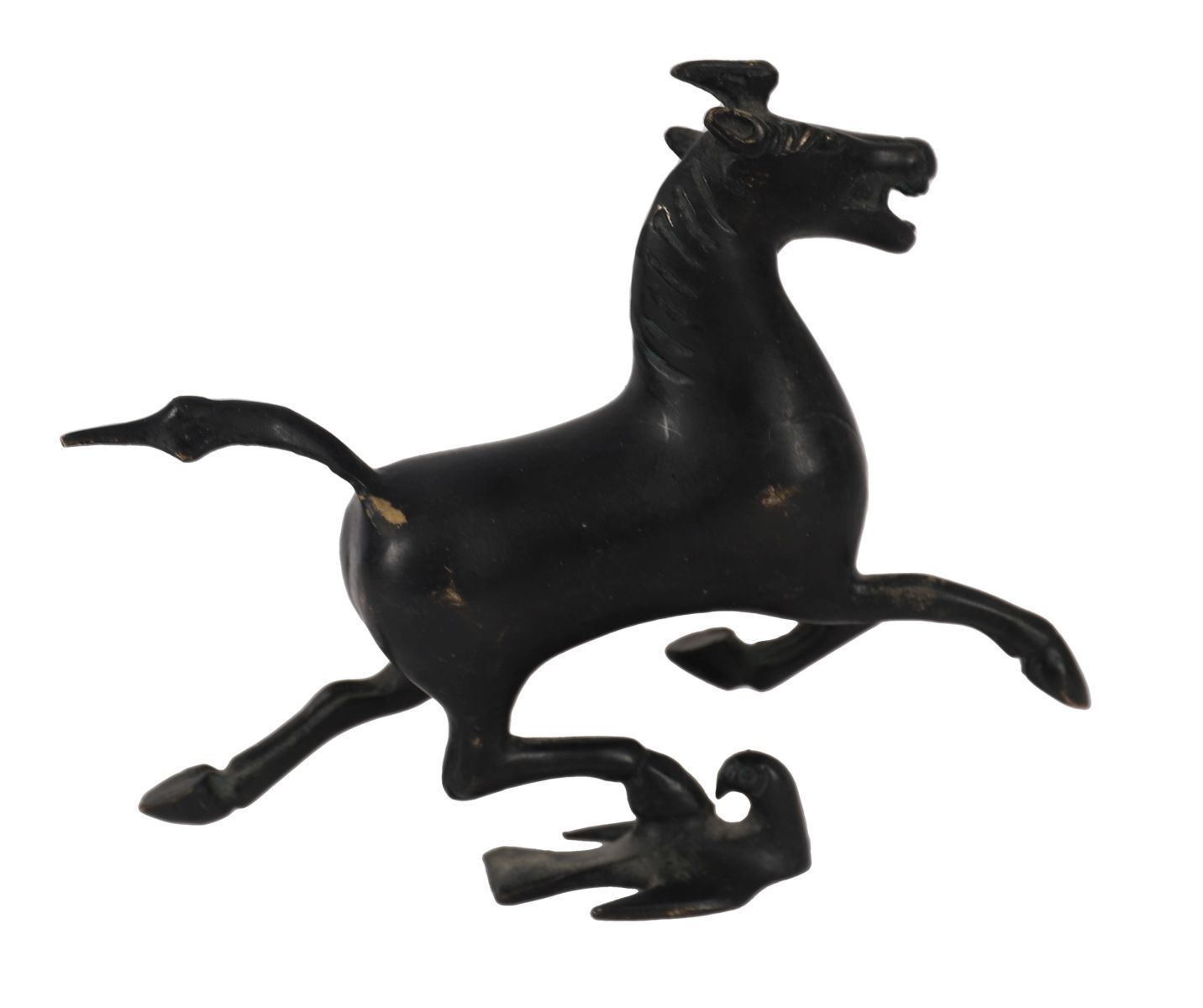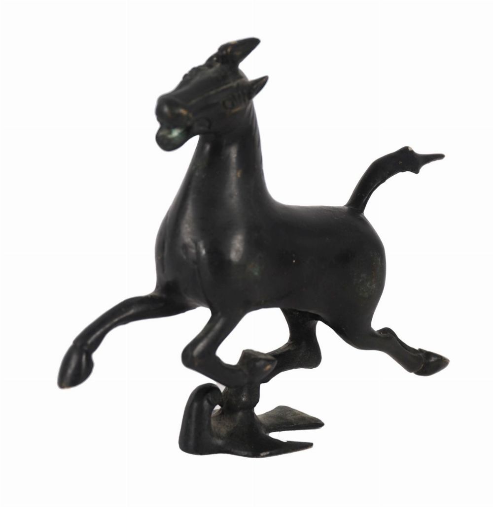 Cast bronze figure of a horse in dynamic stance.