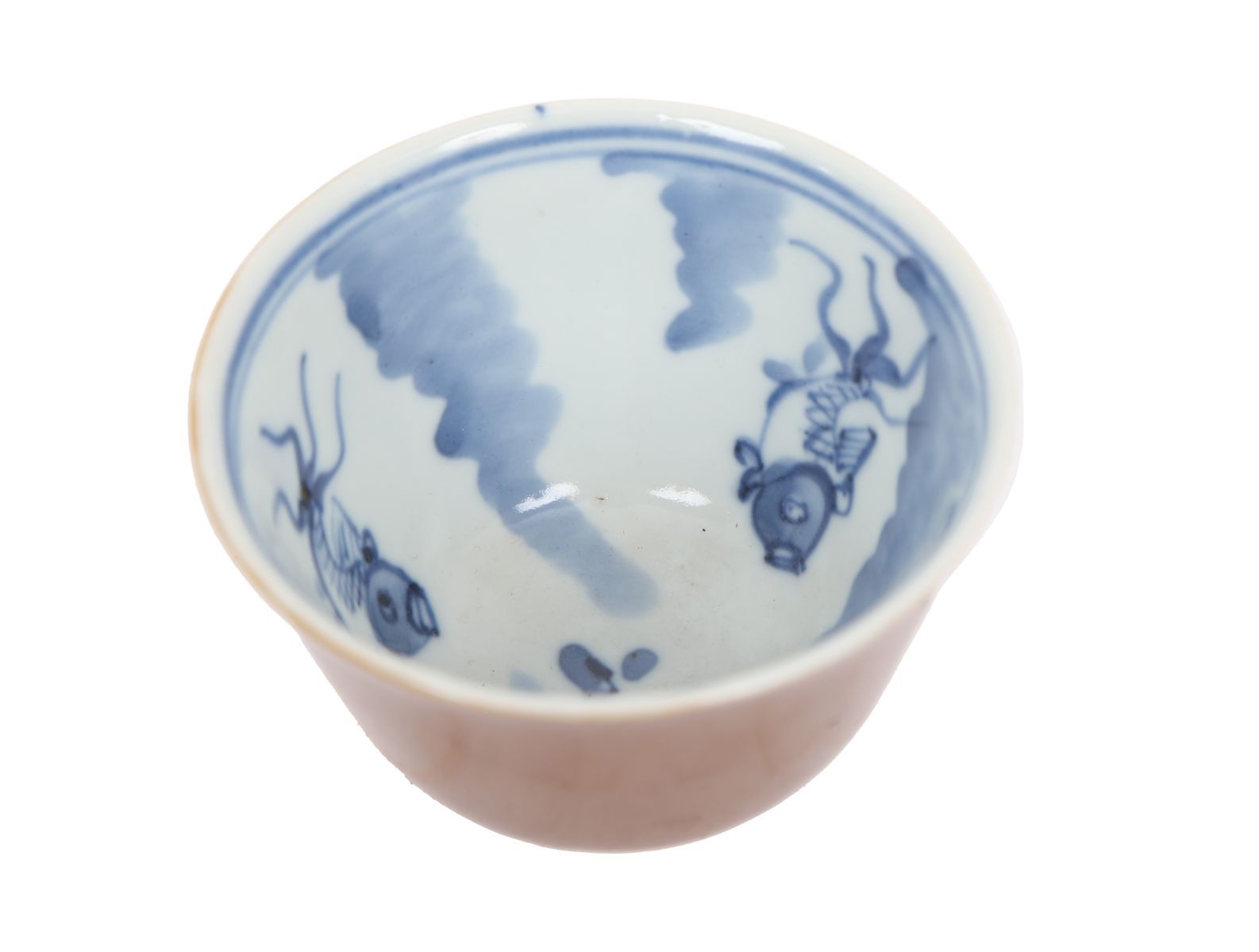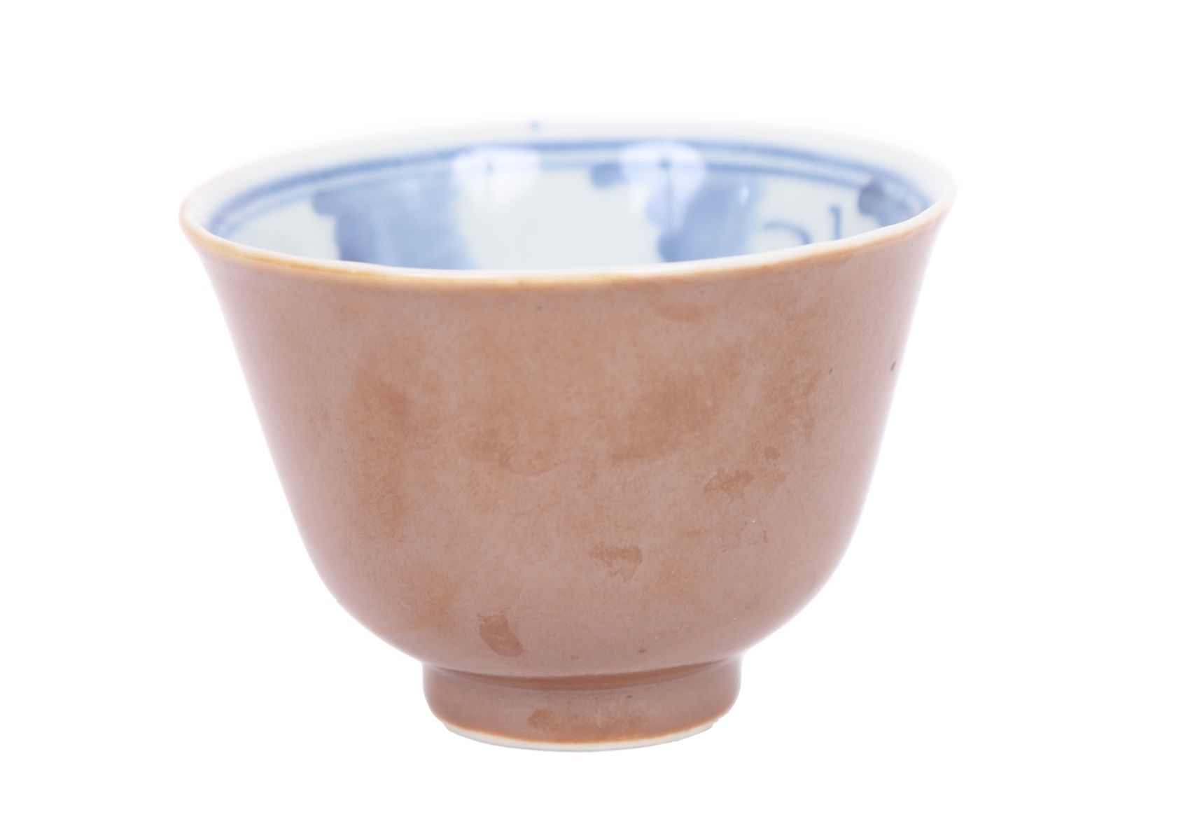 Small tea bowl with café-au-lait glazed exterior and underglaze blue interior decoration of scrolling motifs, raised on a short circular foot.