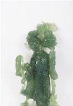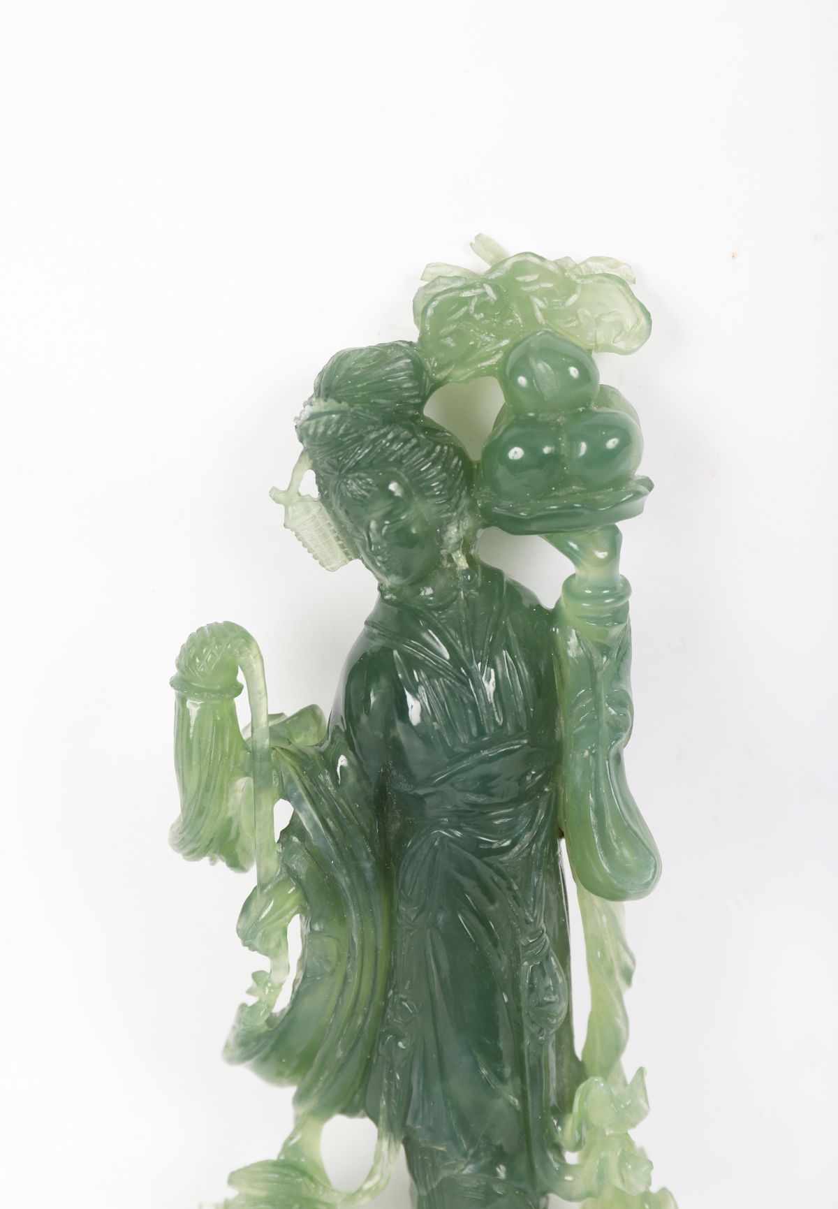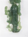 20th century. Green-toned jade, the standing figure holding a lotus stem, pierced and finely detailed.
