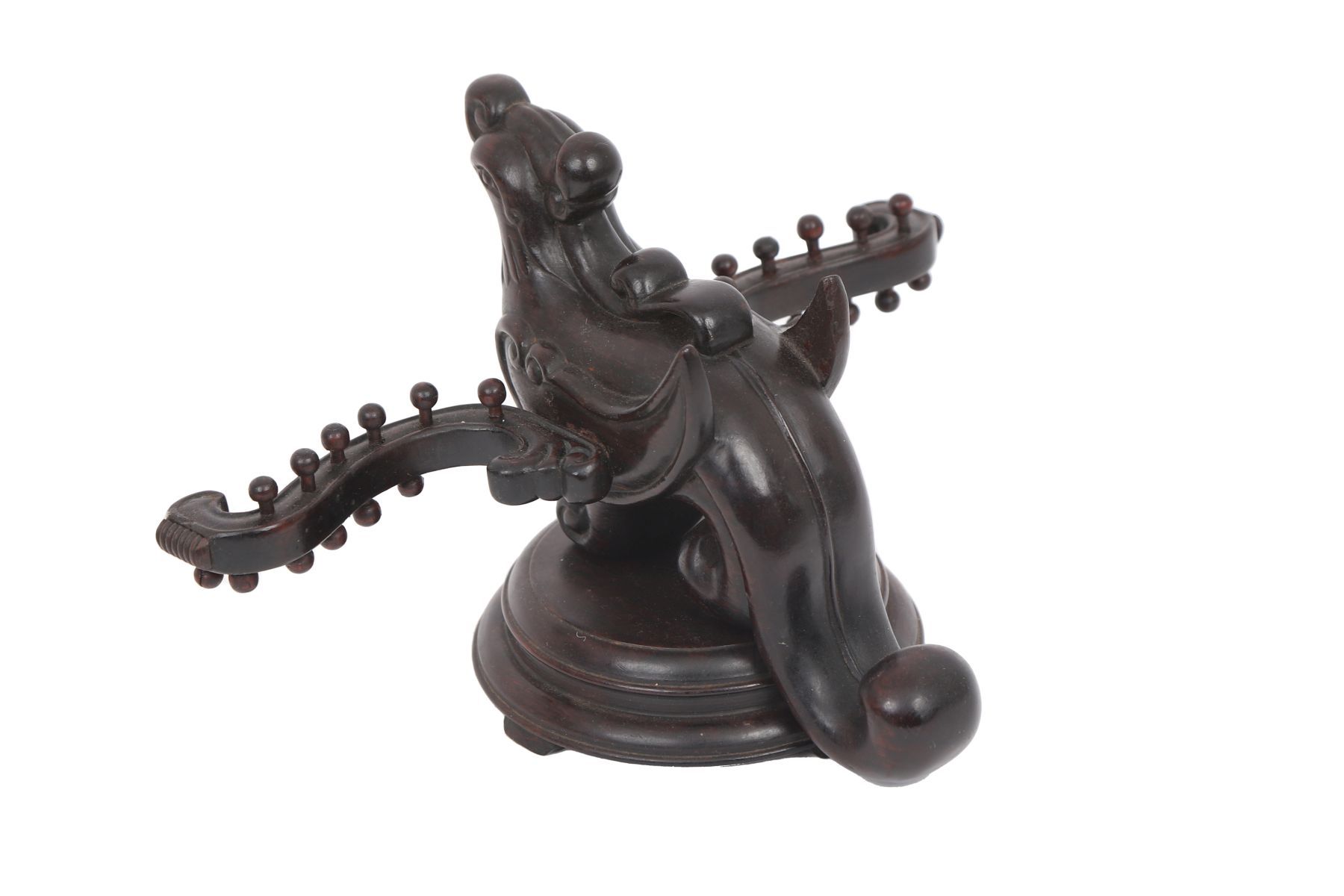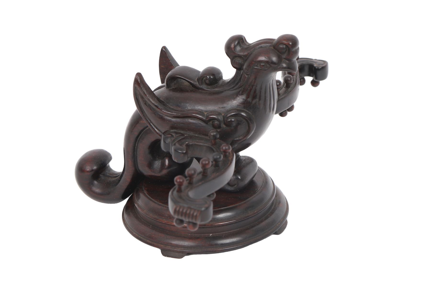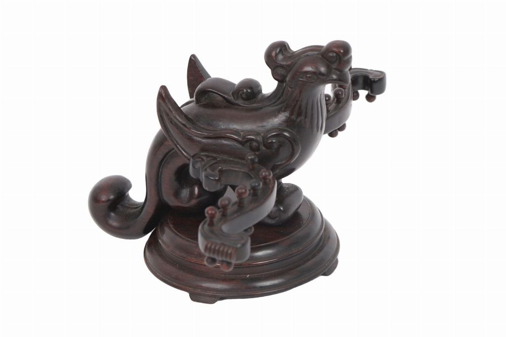 A Chinese hardwood needlework or sewing companion, carved in the form of a phoenix with scrolling tail and pierced details, raised on an integral stand, Qing dynasty or later.