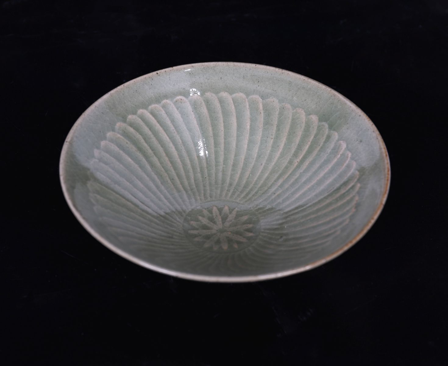 A delicately potted bowl with impressed chrysanthemum petal design to the interior, covered overall in a translucent grey-green celadon glaze, pooling lightly in the recesses. The foot unglazed.