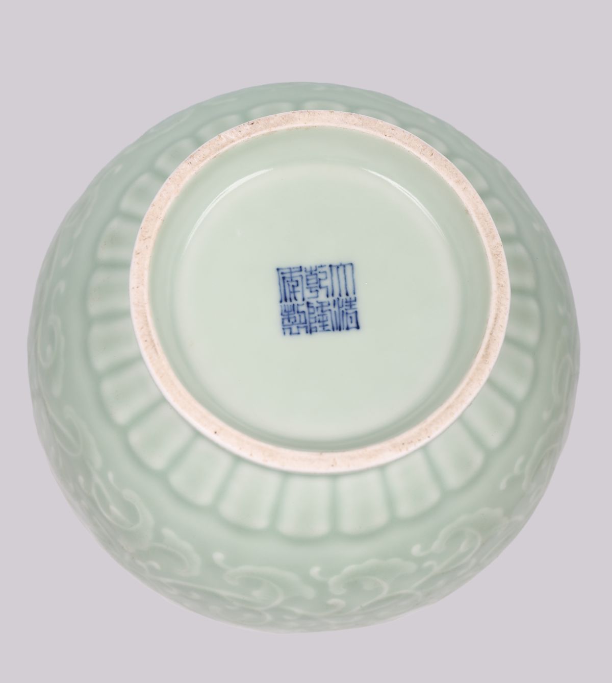 with raised moulded decoration and scroll handles, seal mark of Qianlong. Provenance: The Carlow Collection.