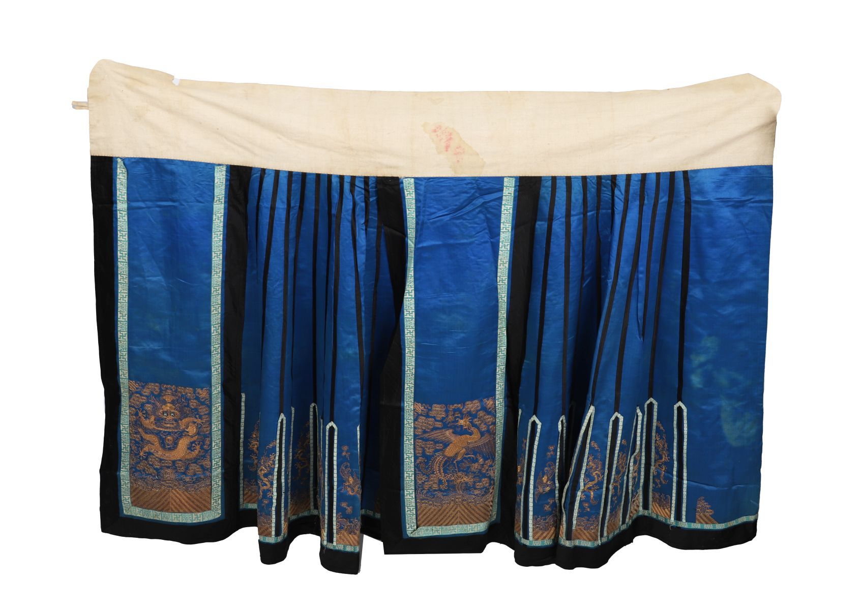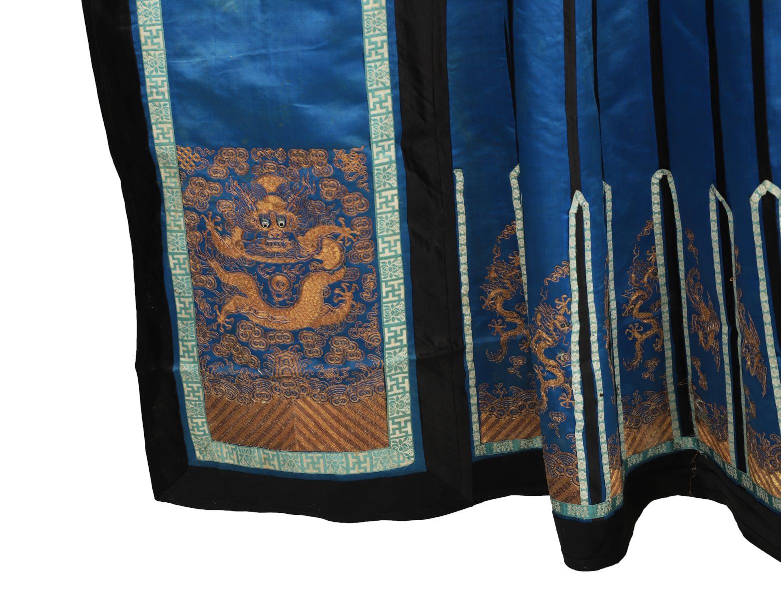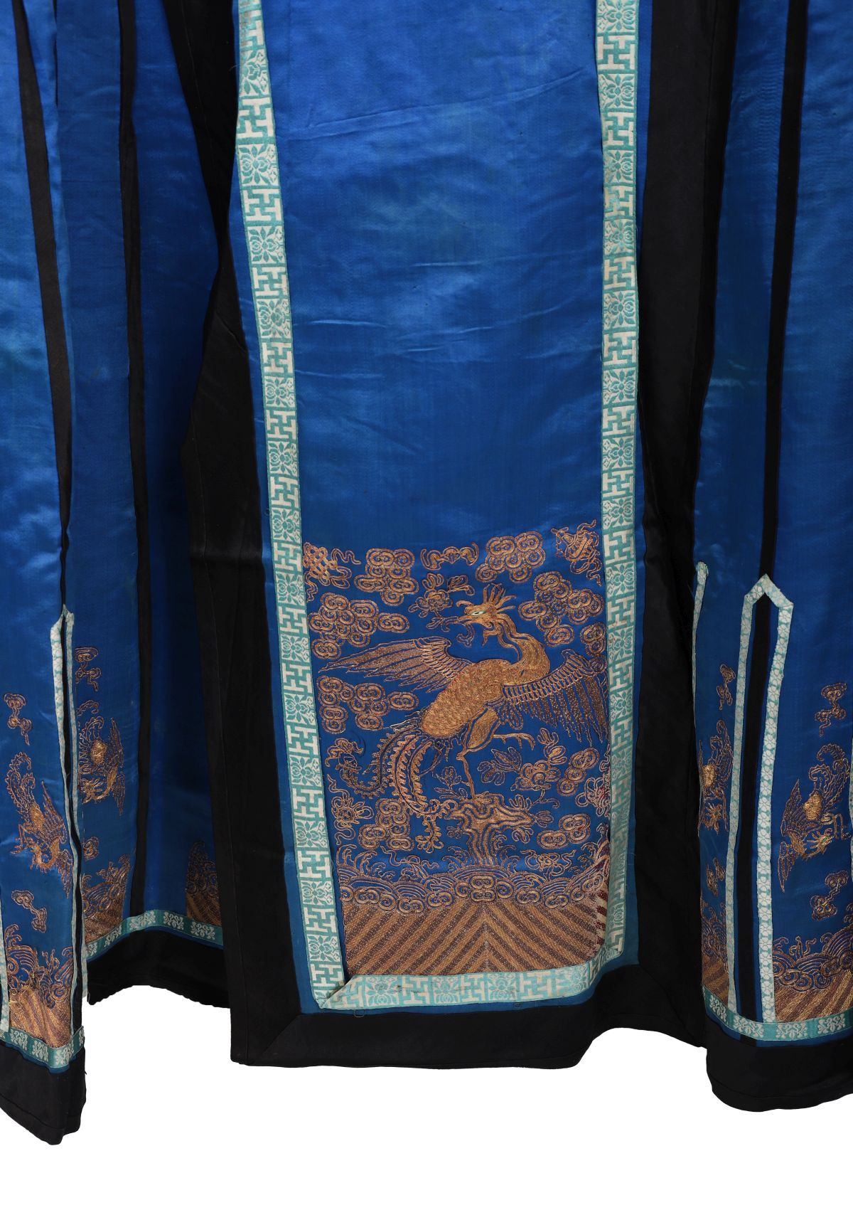 A Chinese court silk skirt panel of bright blue ground, finely embroidered in gold and coloured silks with dragons, phoenixes, and auspicious cloud motifs, within black and turquoise borders.
