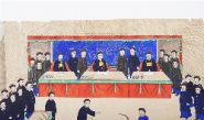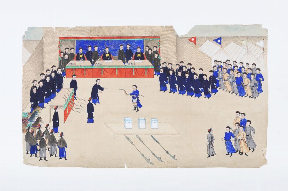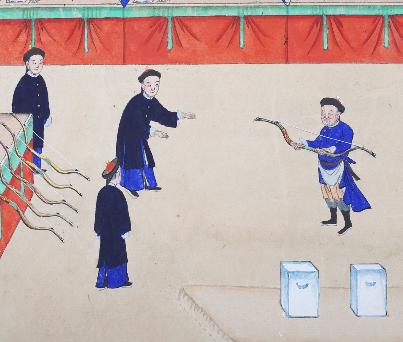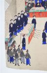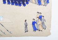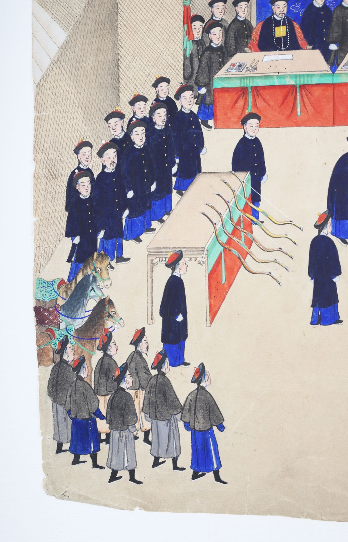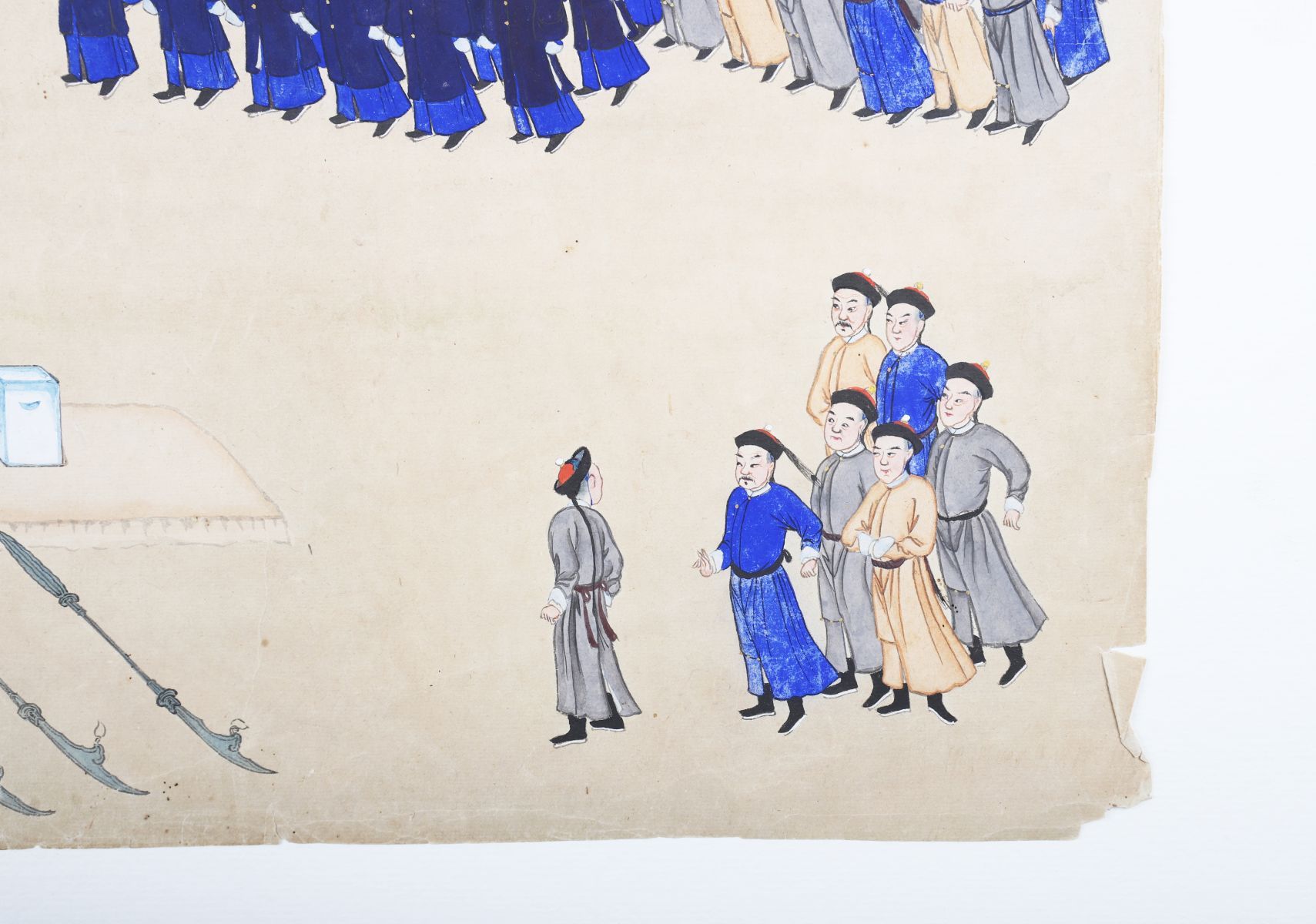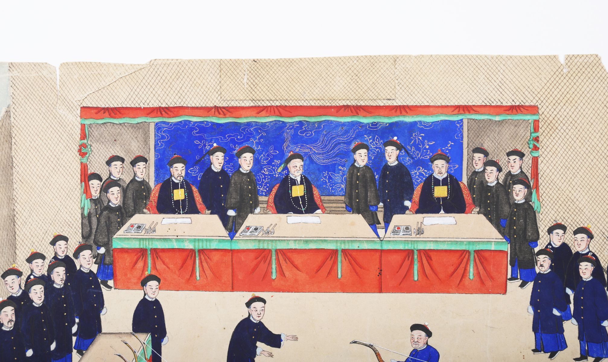 A finely executed Chinese gouache painting on paper depicting an elaborate court or ceremonial scene, with officials and attendants gathered before a tribunal or stage under a canopy. The composition features figures in formal attire, rendered in vivid blue and ochre pigments, with attention to costume and rank details. Mounted on backing paper, with areas of age-related wear and losses to edges.