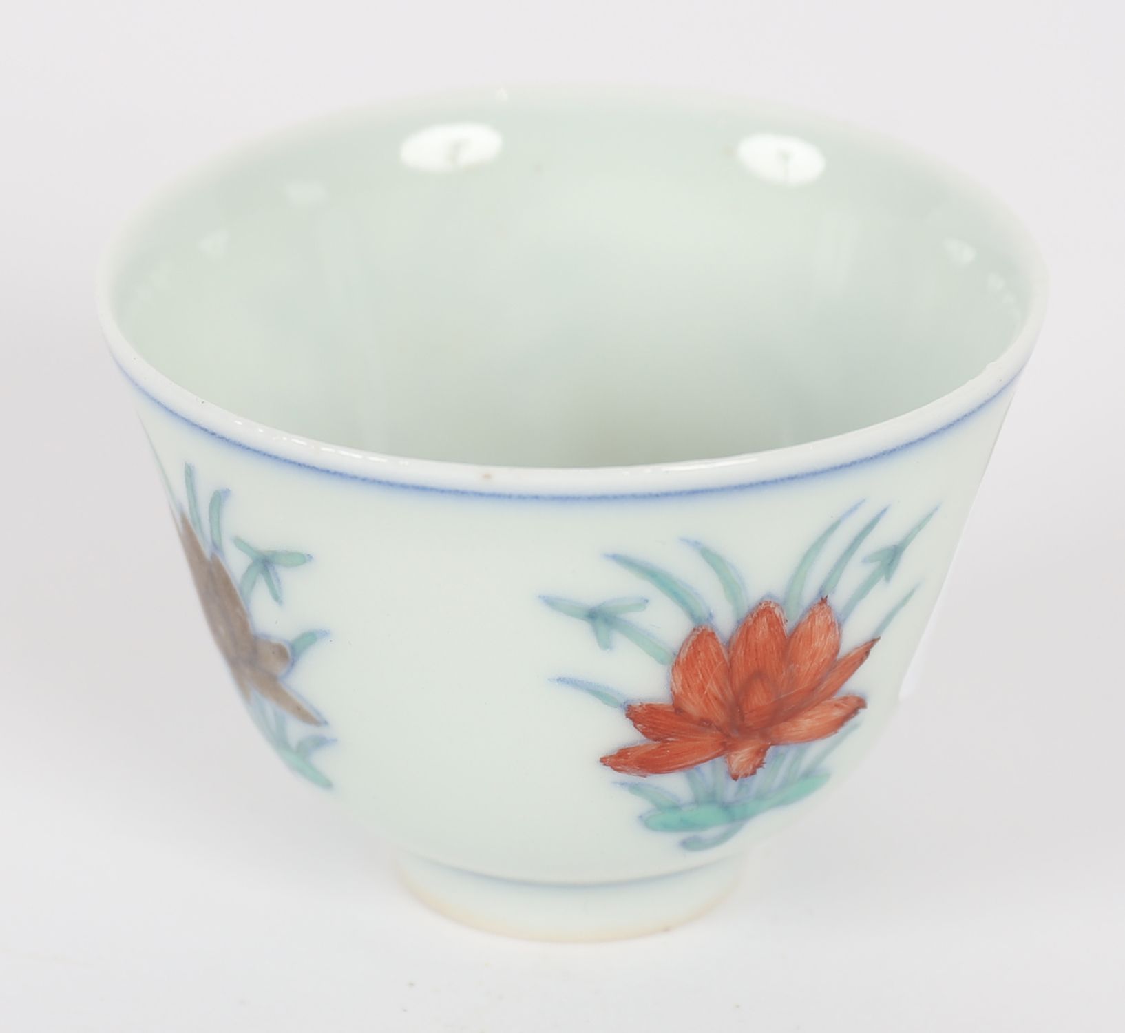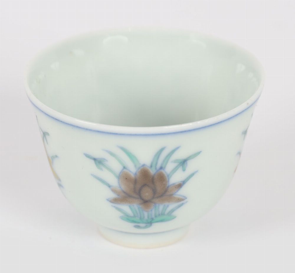 A finely potted Chinese porcelain wine cup, decorated in doucai palette with lotus blooms and scrolling foliage in underglaze blue and overglaze enamels. The base bears a six-character Chenghua mark in underglaze blue.