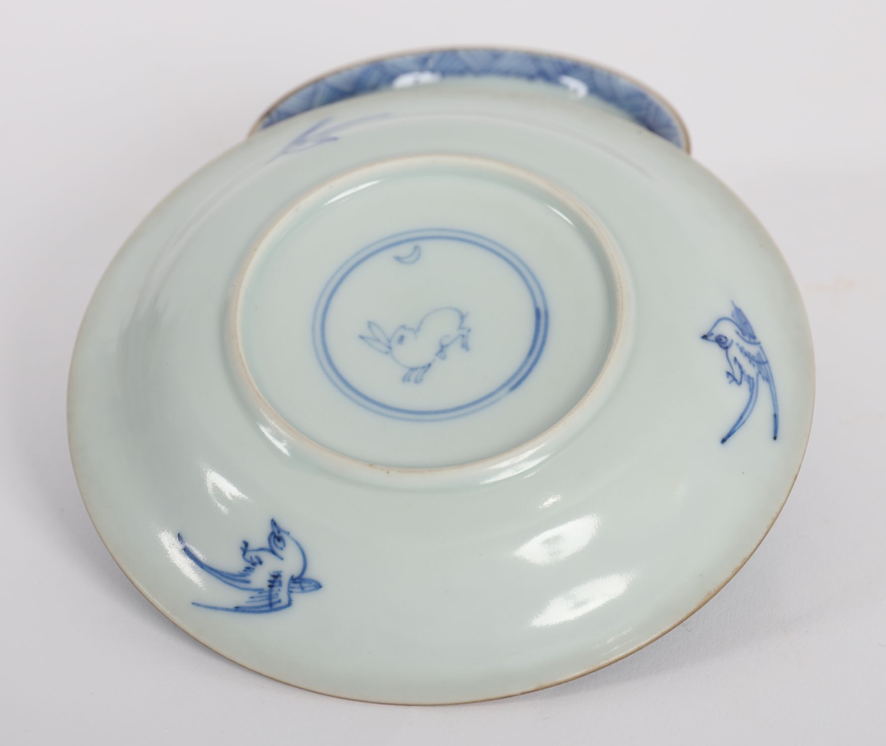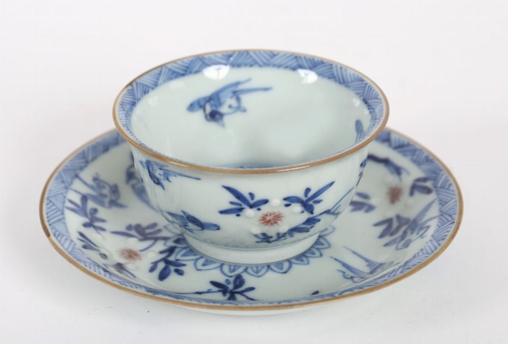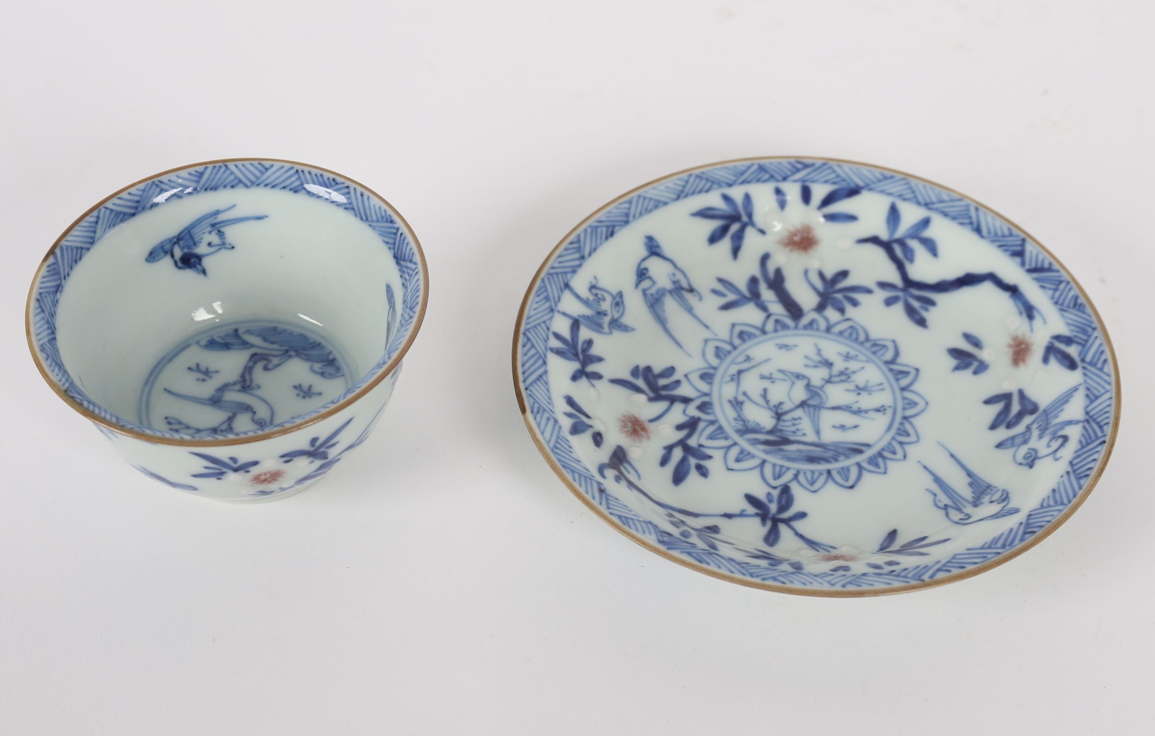A Chinese porcelain cup and matching saucer, decorated in underglaze blue with birds among blossoming branches, framed within foliate borders. The reverse of each piece features playful animal medallions, including rabbit and pig motifs, within double circle bases.