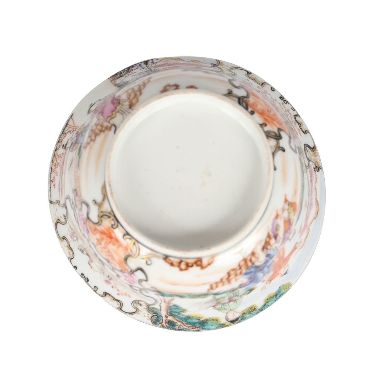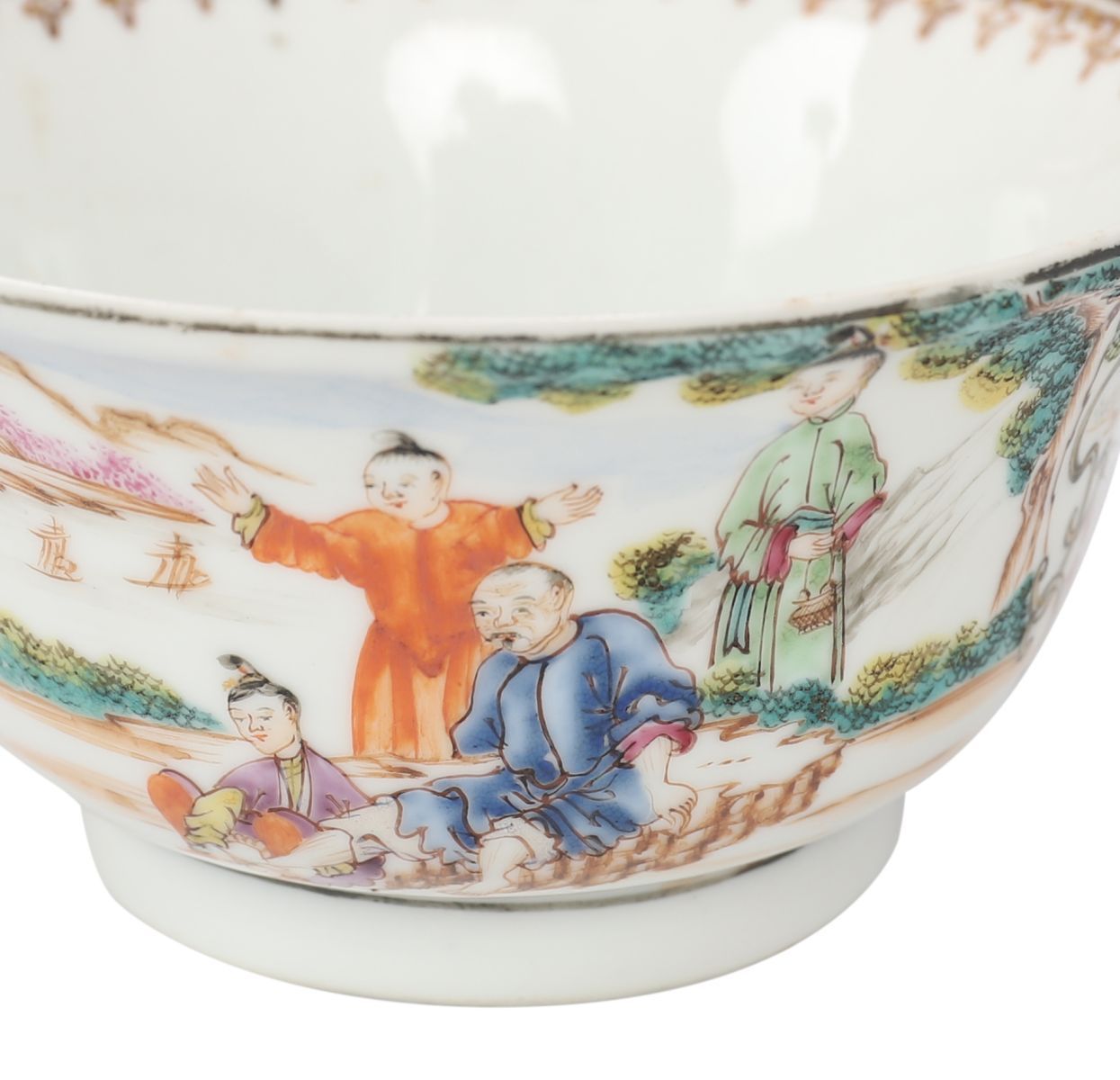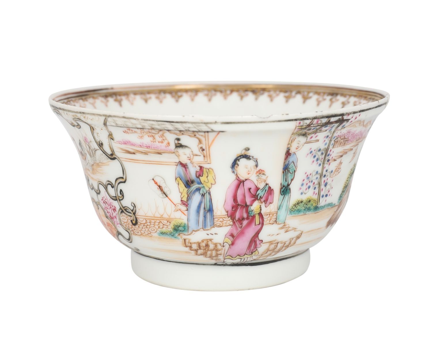 Finely enamelled Chinese porcelain bowl of flared form, the exterior painted in famille rose enamels with continuous figural scenes depicting courtly figures in garden landscapes, alternating with gilt-scroll cartouches enclosing birds and flowers. The interior rim with gilt foliate border, centred by a floral medallion in puce enamel.