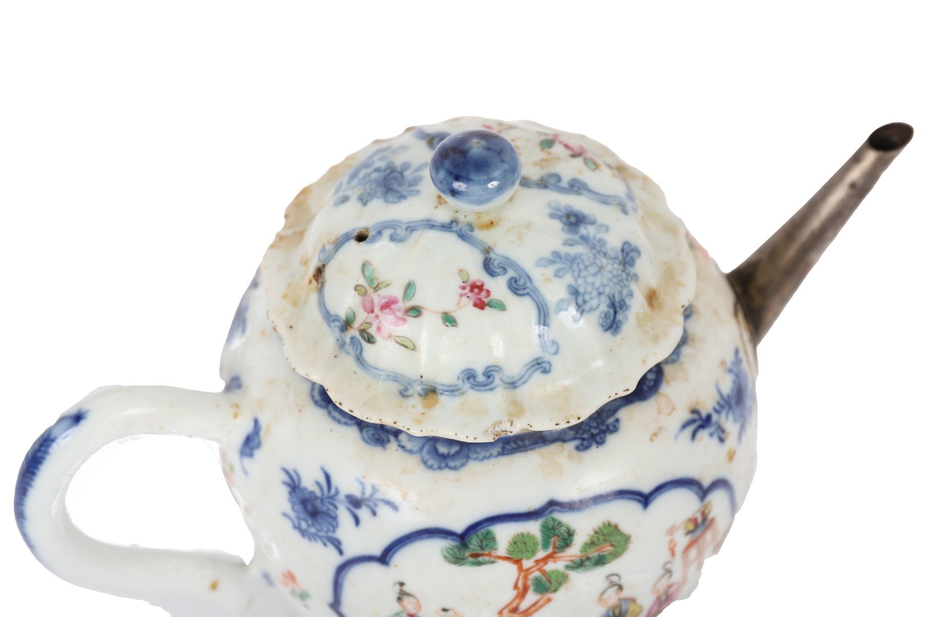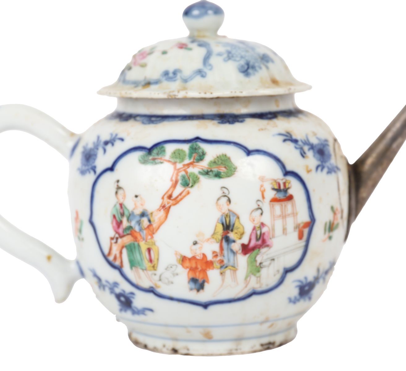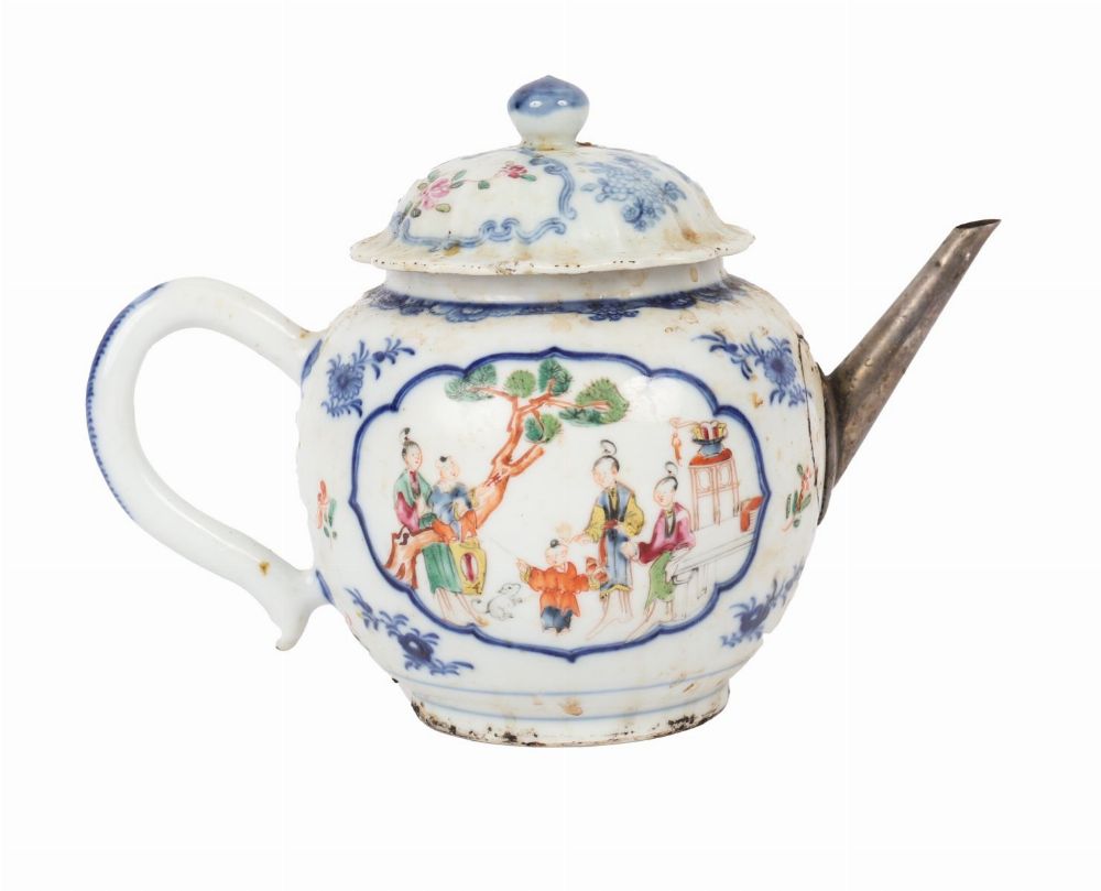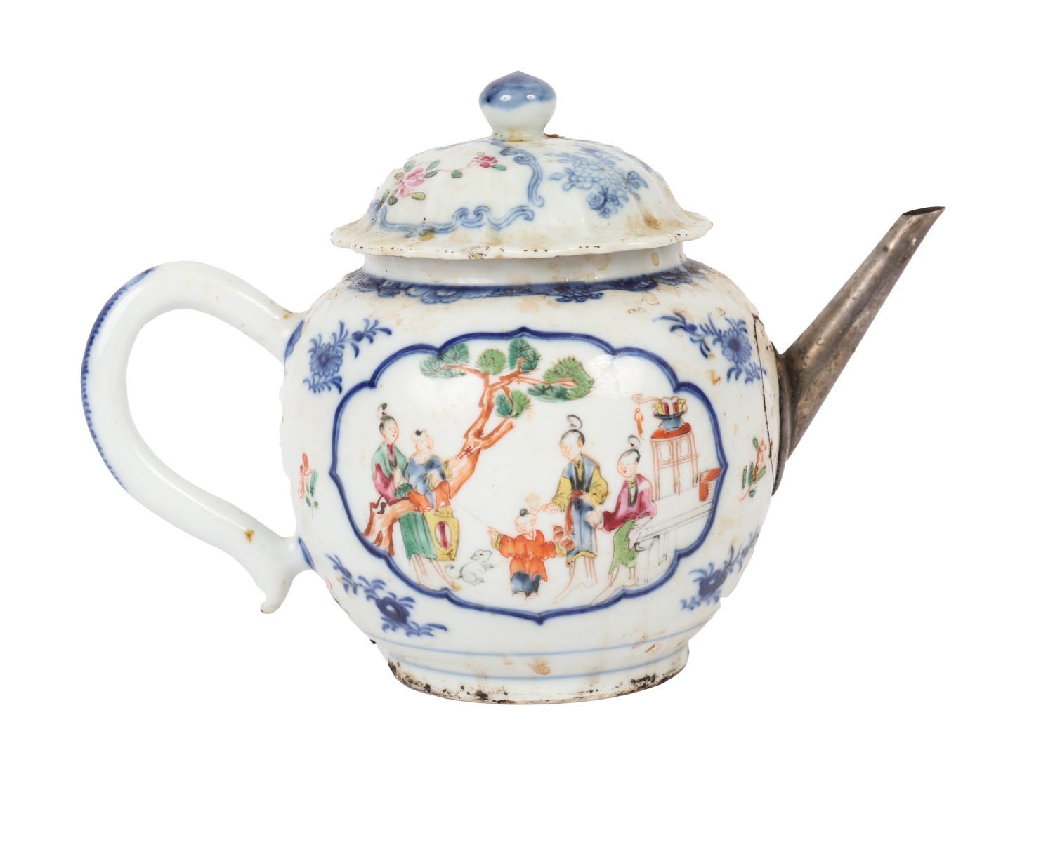 A Chinese export porcelain teapot, hand-painted with figural panels depicting courtyard scenes, interspersed with underglaze blue floral decoration. Retains original domed cover with knop finial.