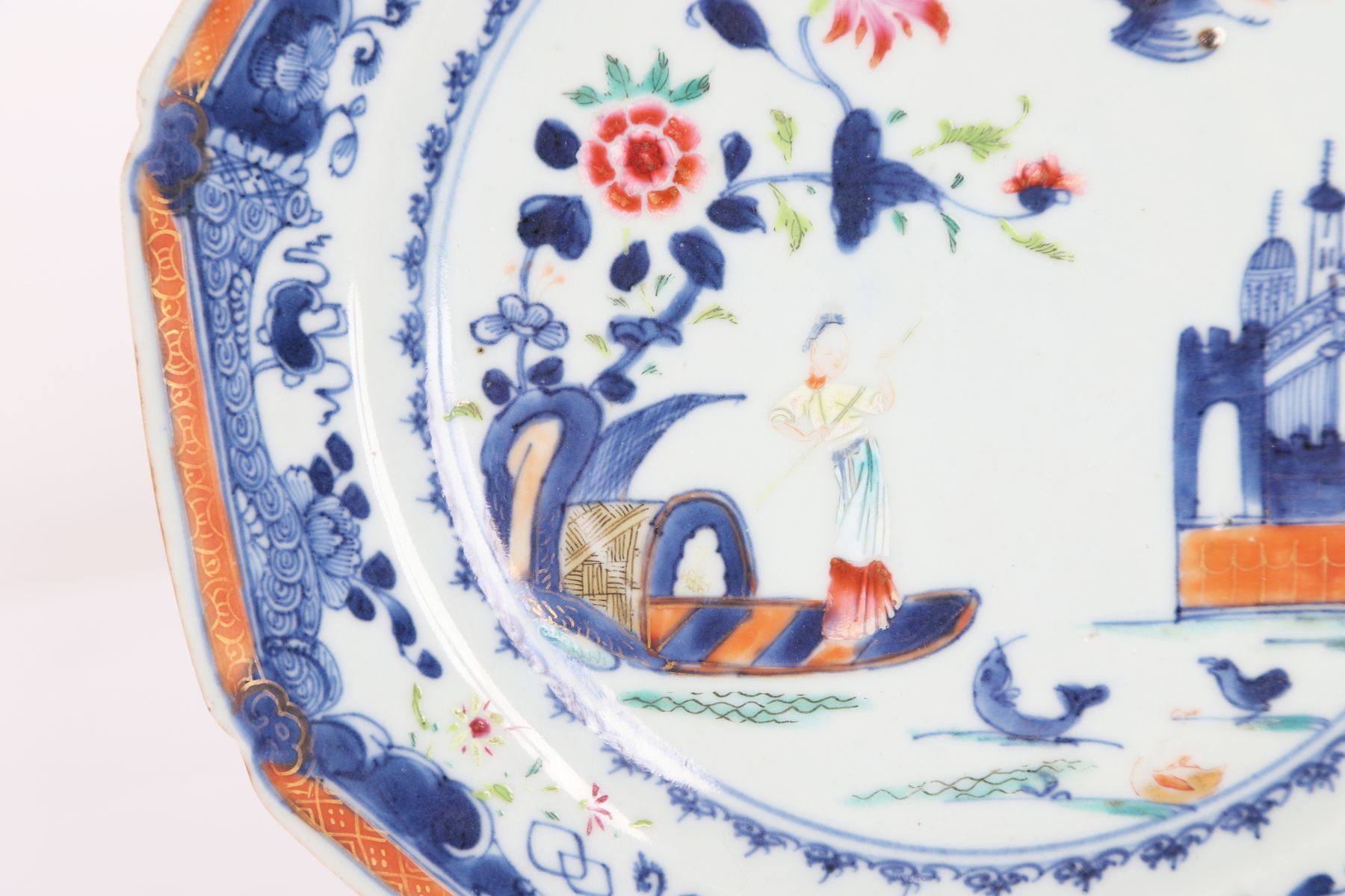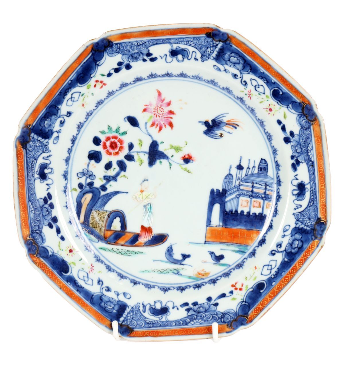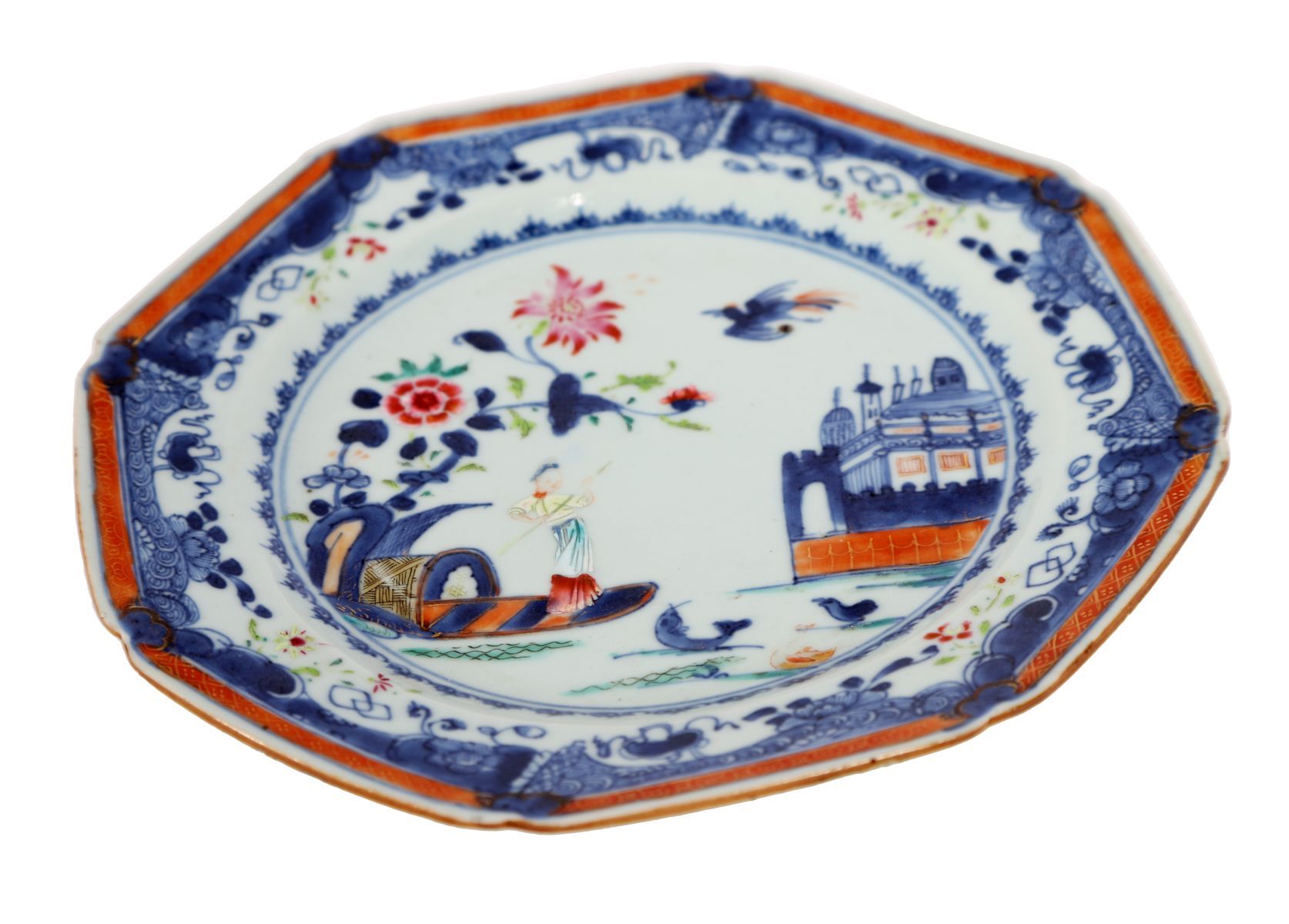 A finely hand-painted Chinese export porcelain plate of octagonal form, Qianlong period, measuring approximately 20 cm in diameter. The central well is delicately enamelled in the famille rose palette with a tranquil riverscape, depicting figures in a sampan on calm water, pavilions and tiered buildings along the shoreline, flowering plants at the water’s edge, and birds in flight above.