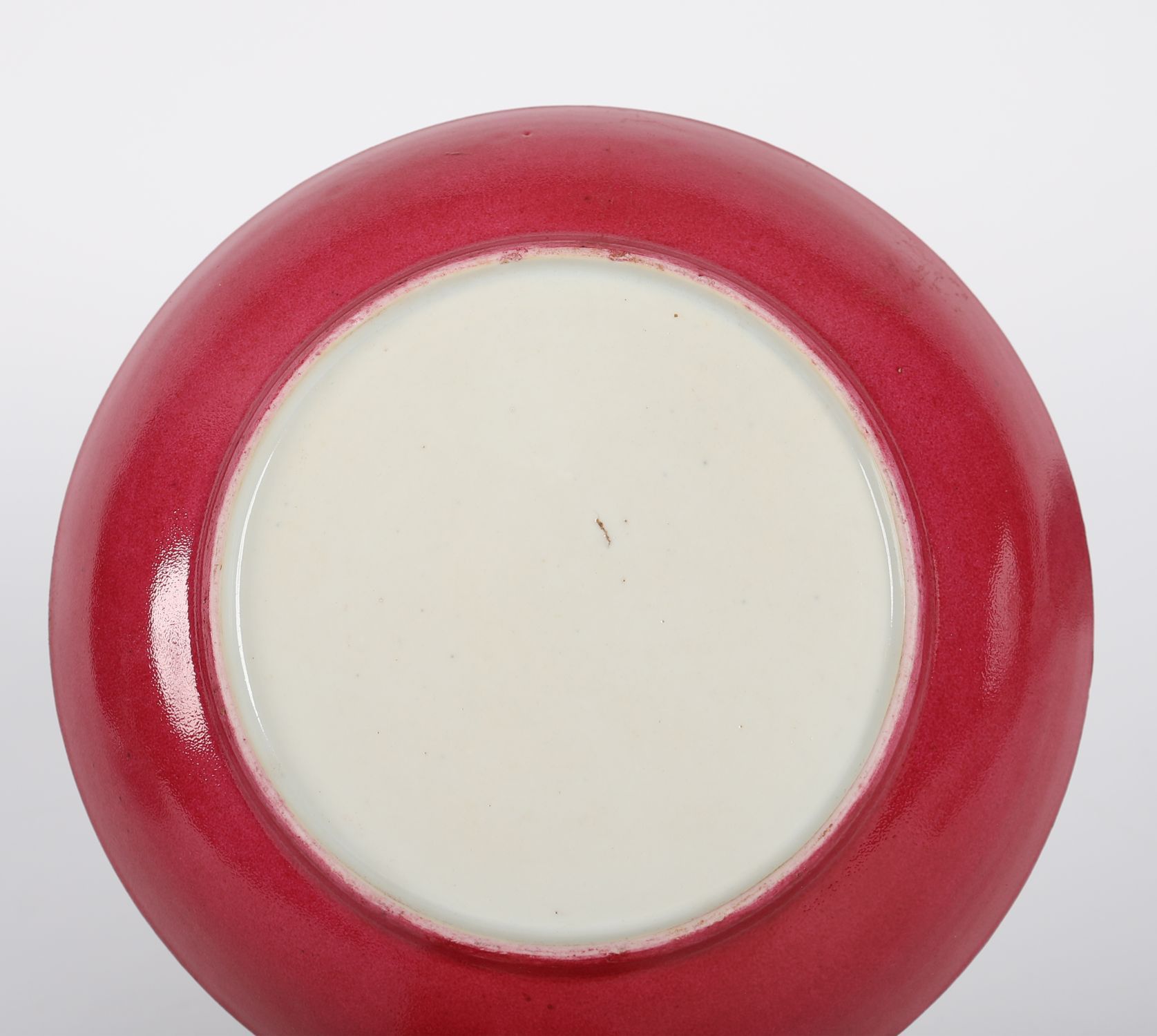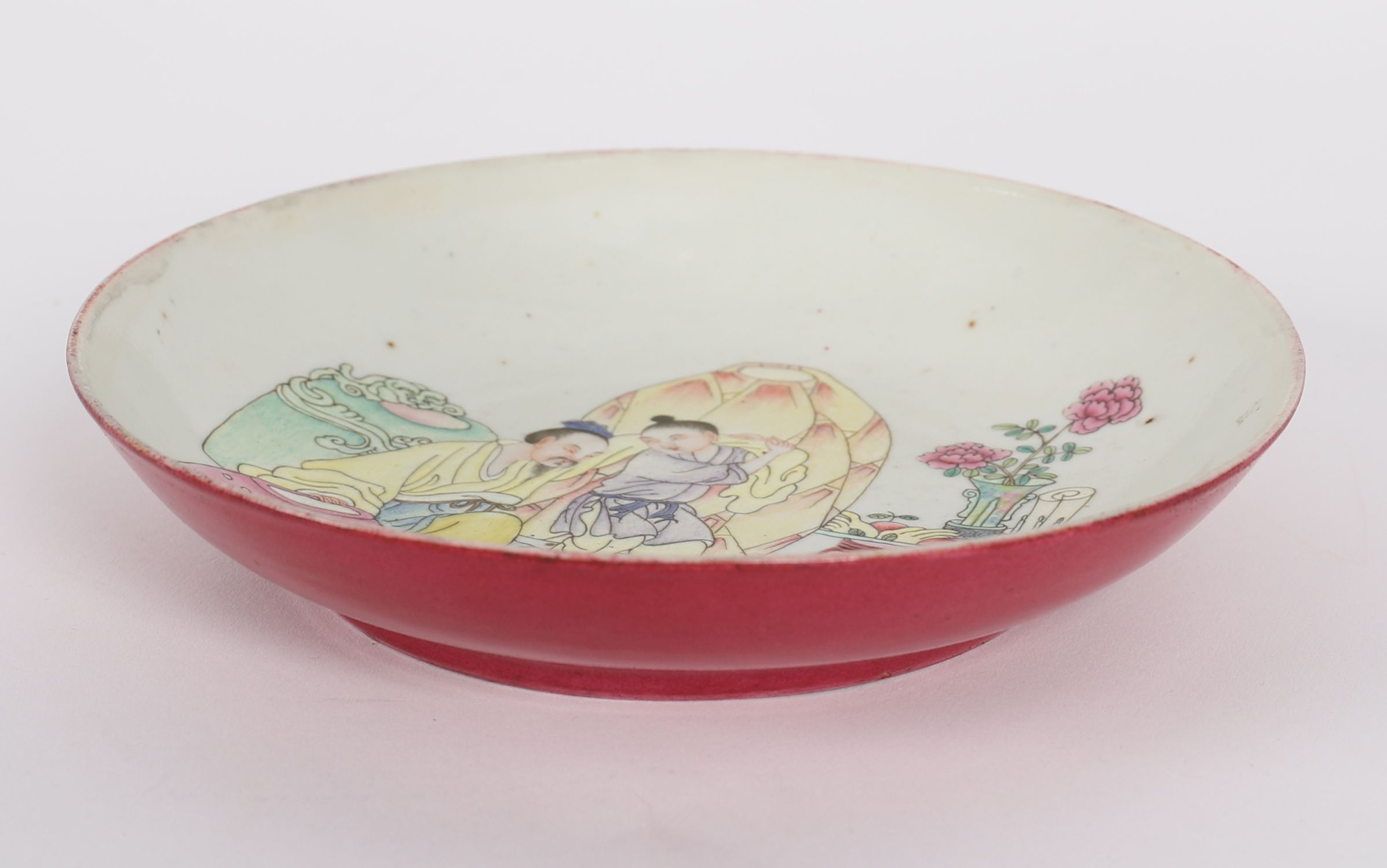 A Chinese porcelain plate decorated in famille rose enamels with a domestic scene featuring a seated elder and child amidst scholar's objects and furniture. The reverse with a deep, pink-glazed rim.