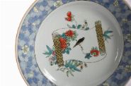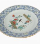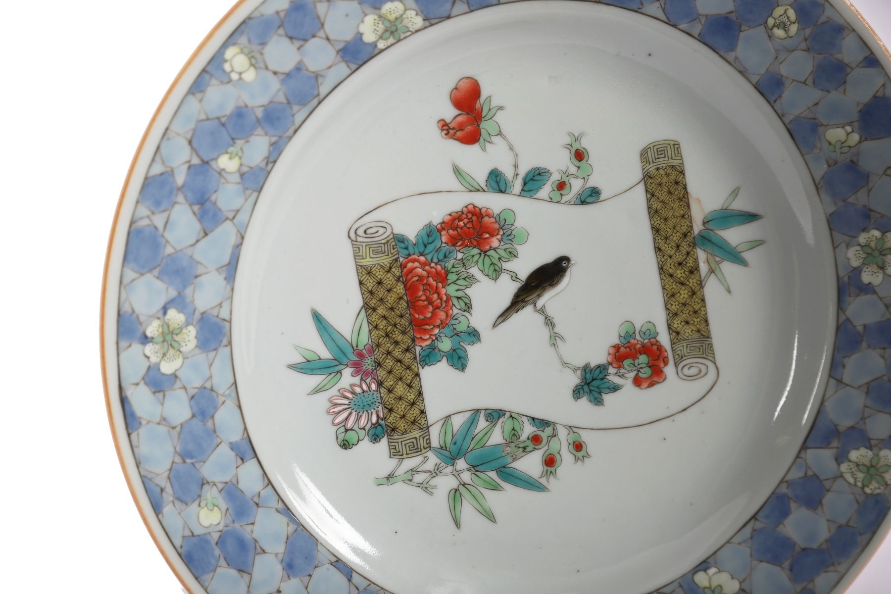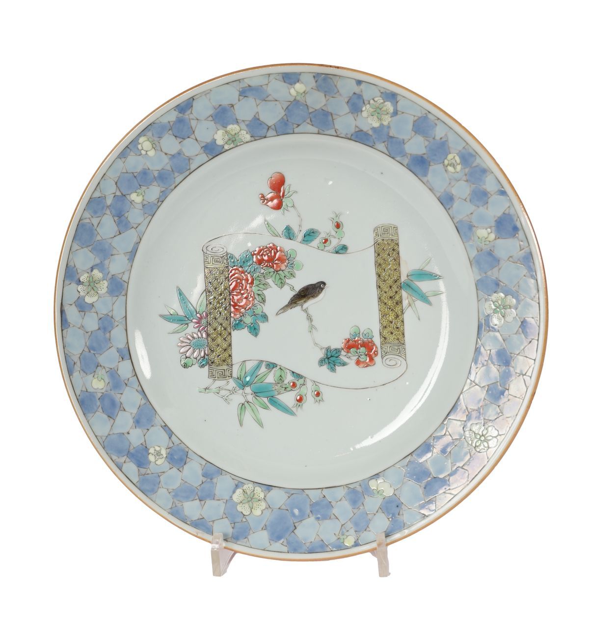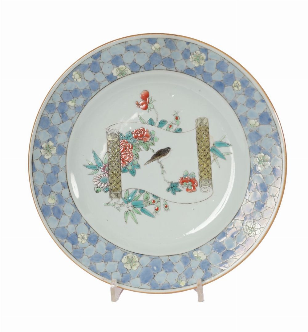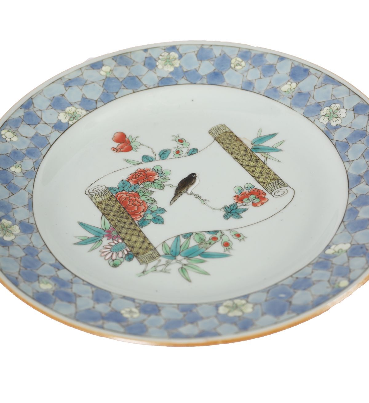 Finely enamelled porcelain plate decorated with floral sprays, scroll motifs, and a central medallion depicting a bird perched on flowering branches, within a border of blue lattice panels interspersed with floral reserves.