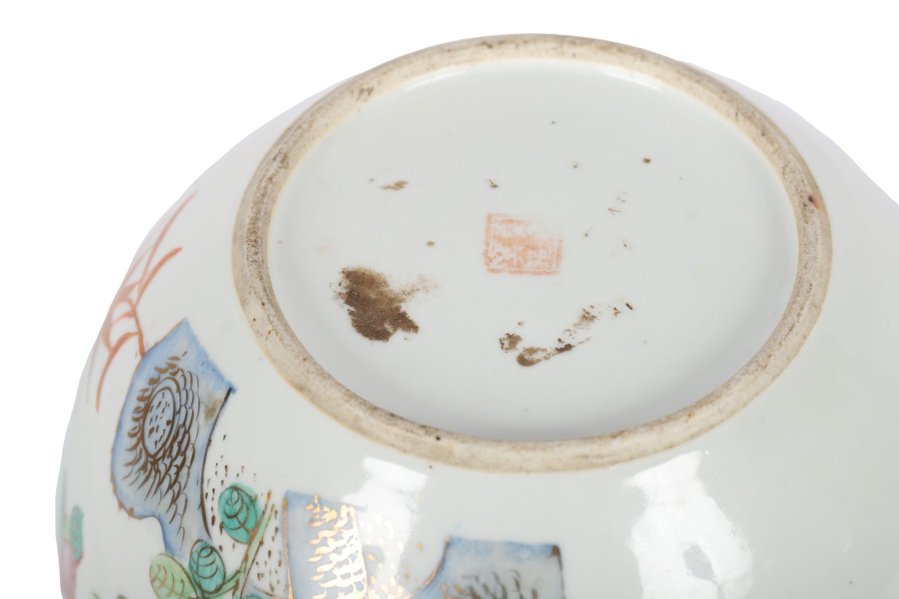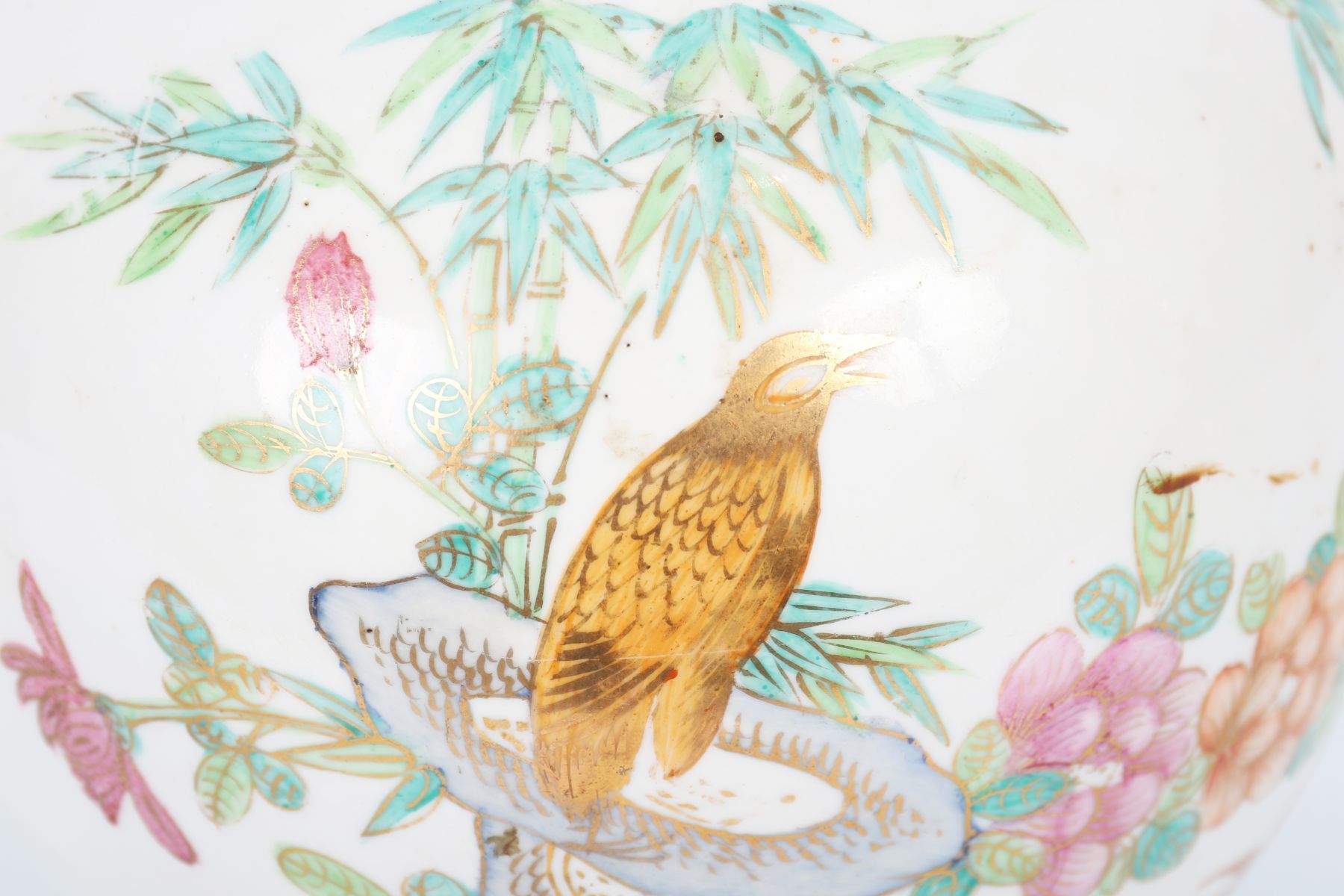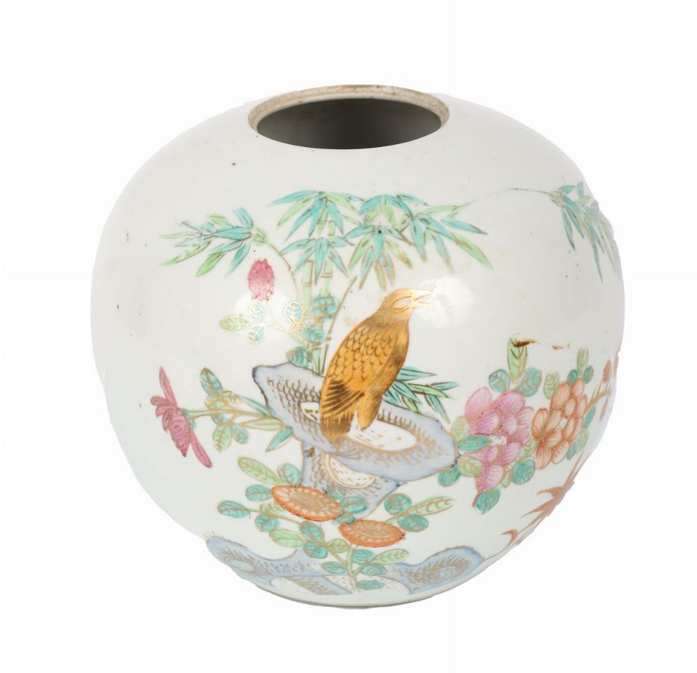 A spherical porcelain jar finely hand-painted in the famille verte palette with a songbird perched among bamboo, peony, and chrysanthemum blooms, accented with gilt detailing.