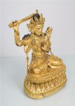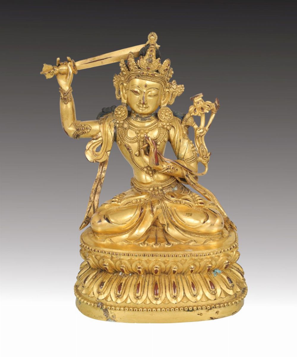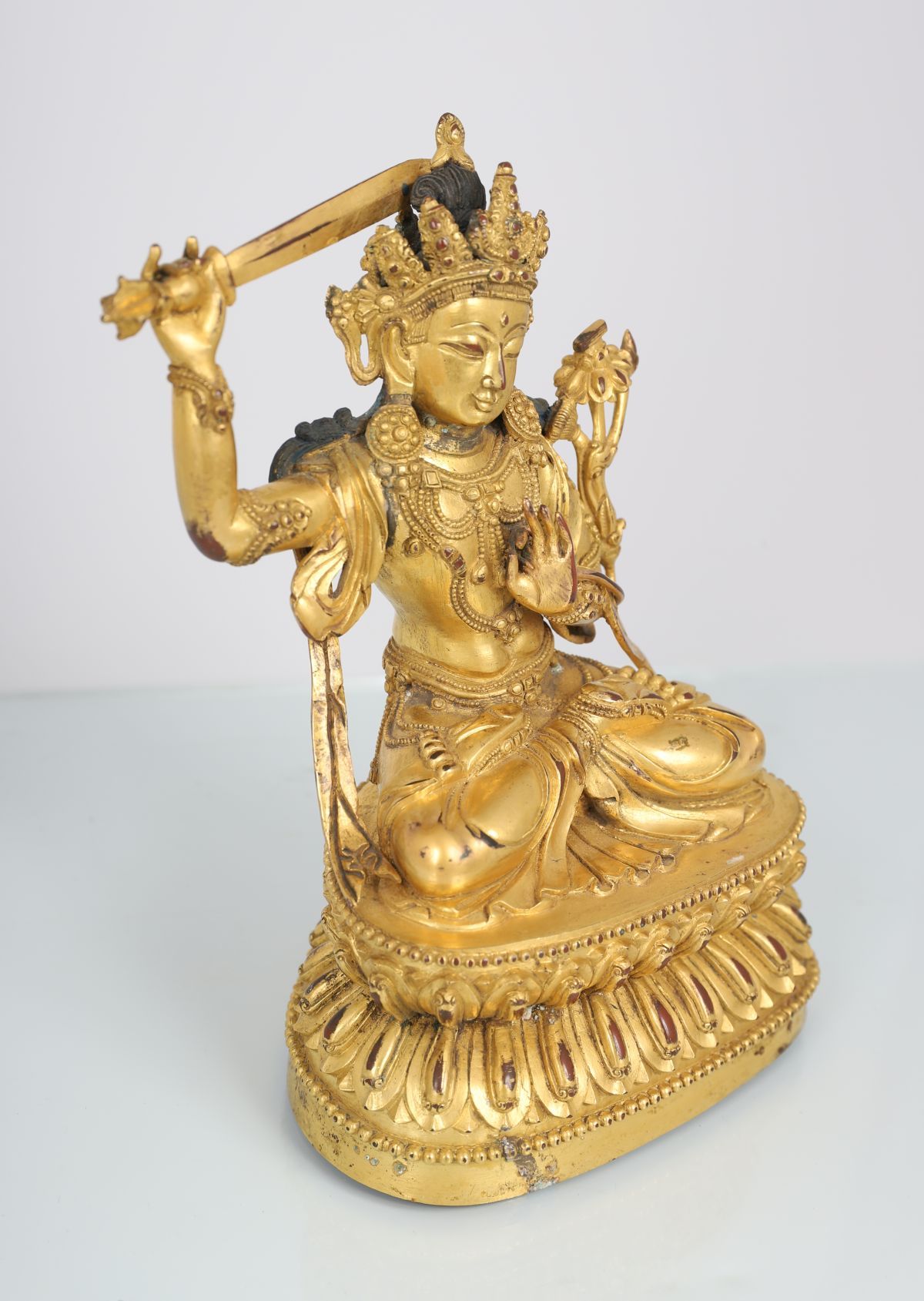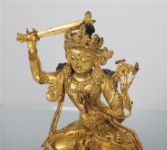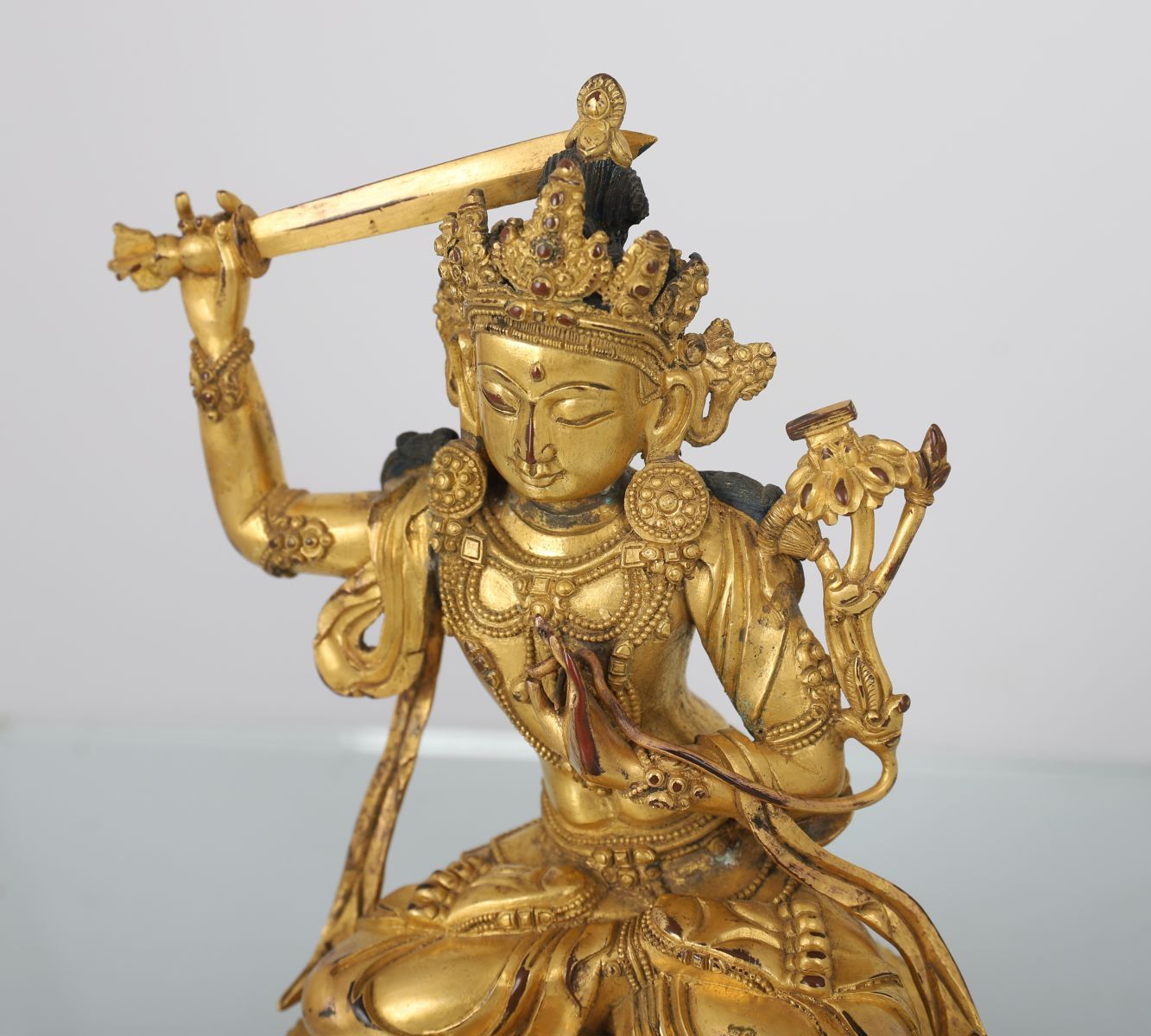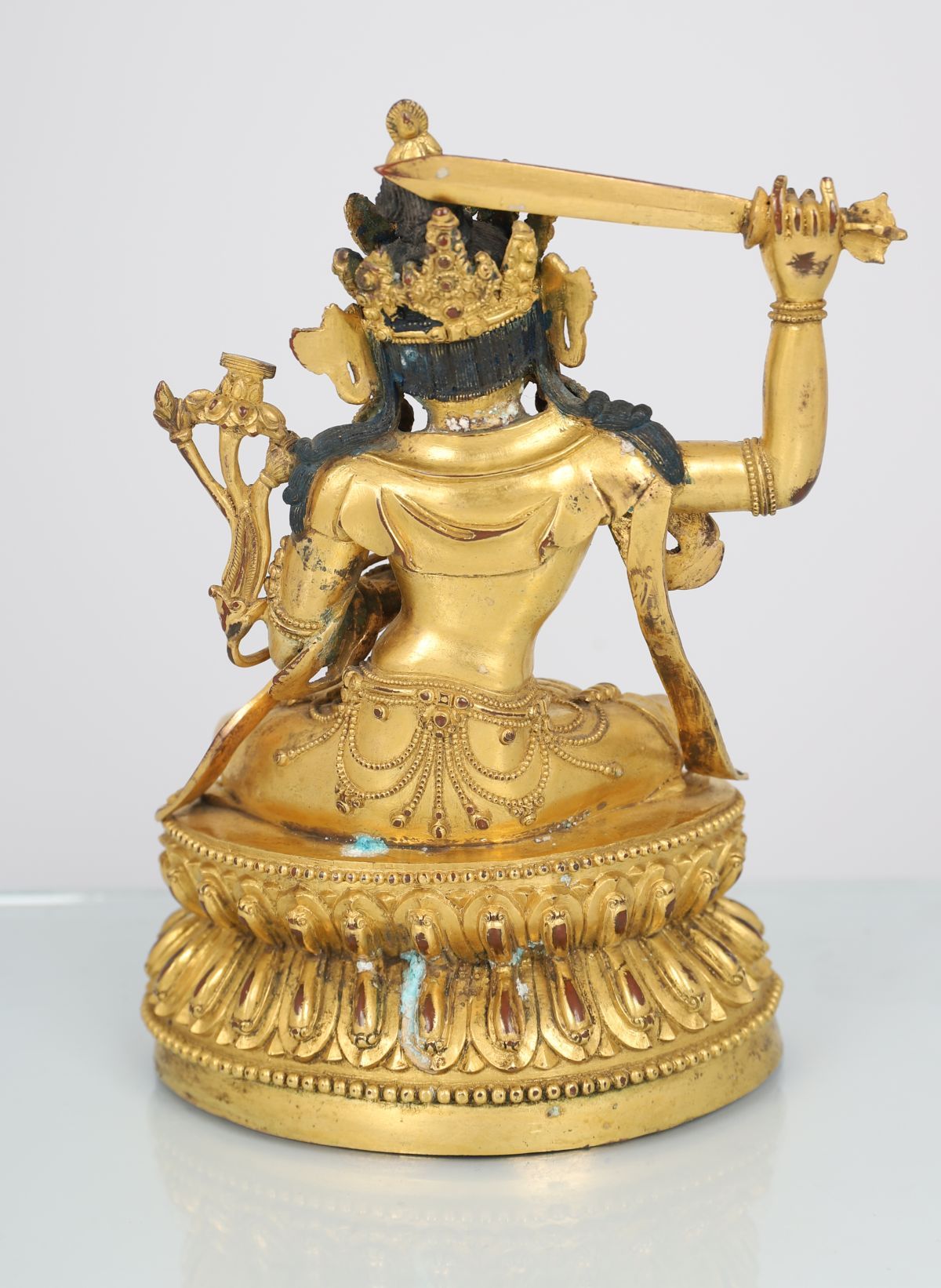 holding a sword aloft, seated on a double lotus cushion, possibly Ming.