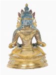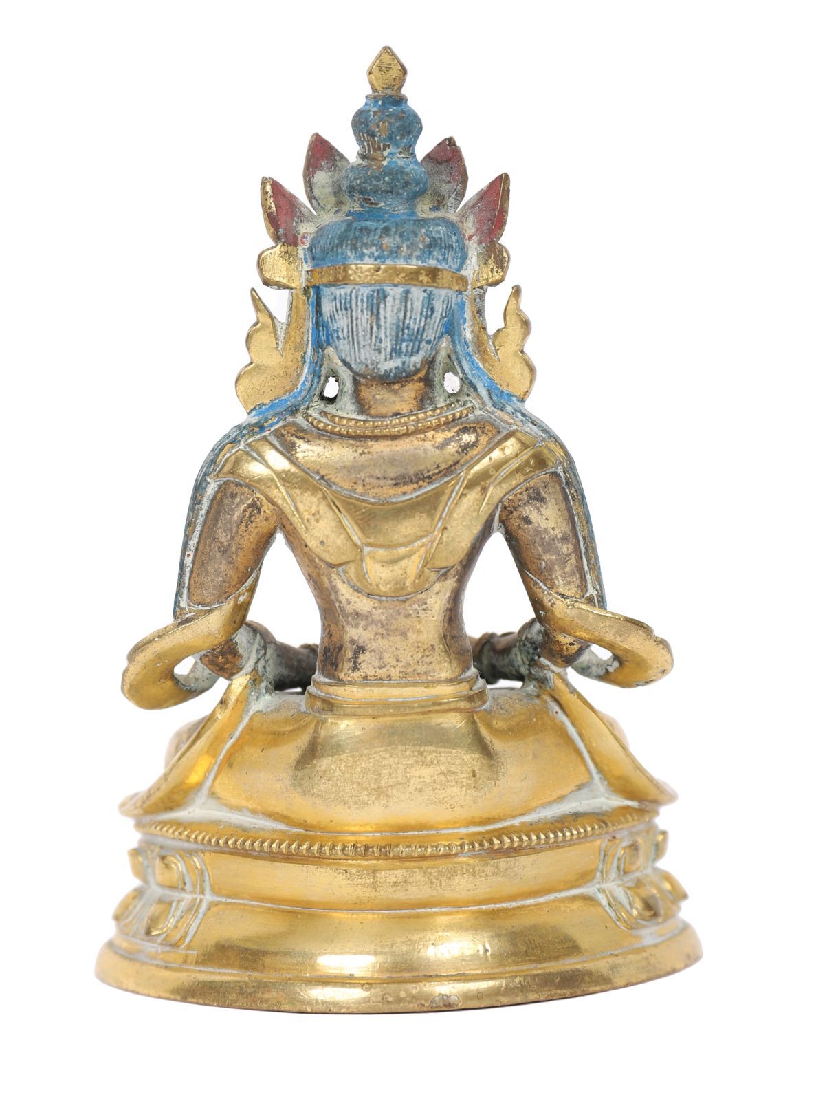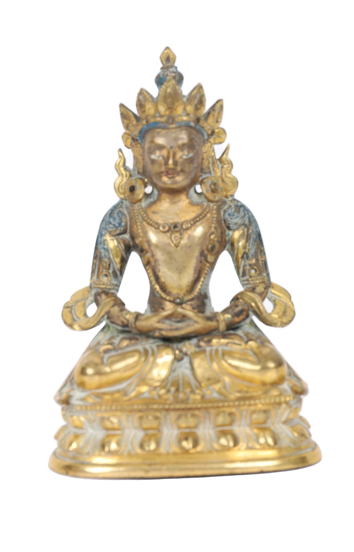 China, possibly late Ming / early Qing dynasty. The Buddha seated in dhyÄna (meditation) posture, the serene expression with elongated ears, the hair arranged in tight curls, wearing flowing robes falling in rhythmic folds across the body. The surface gilt or gilt-bronze, with traces of blue-painted or enamelled detail, seated on a lotus base.