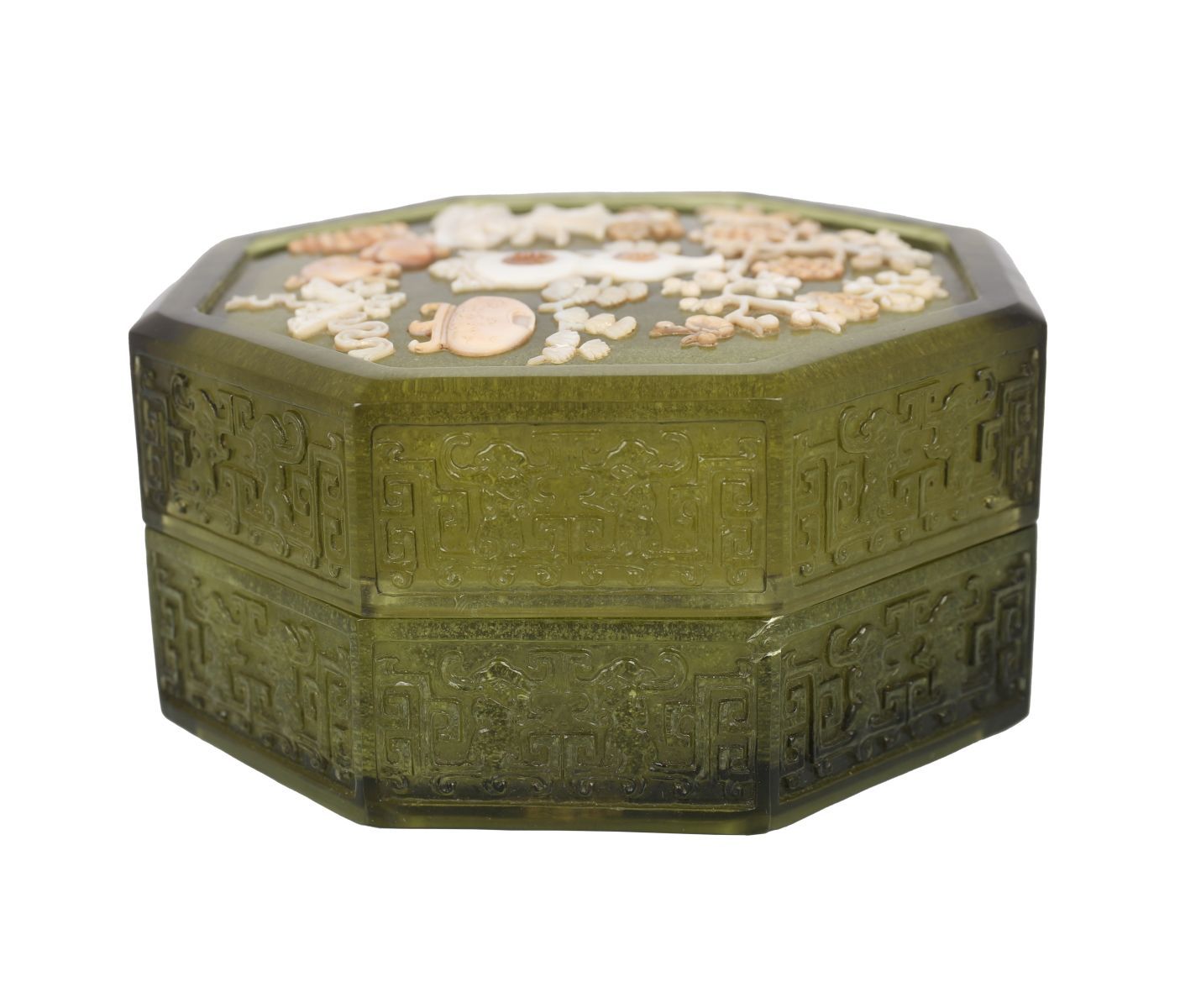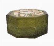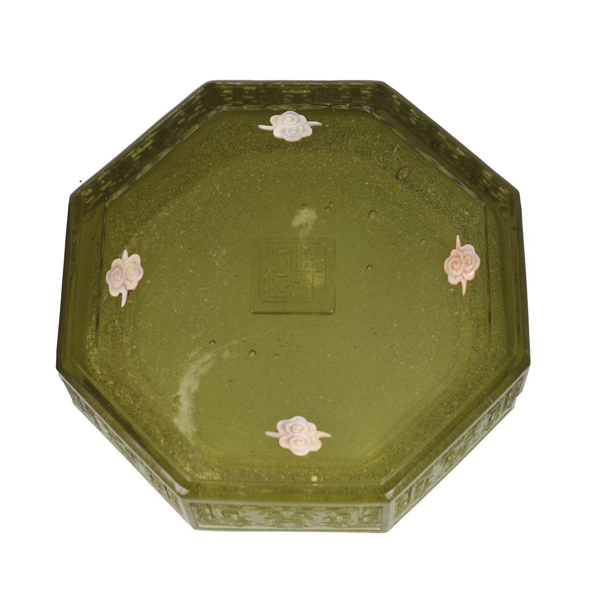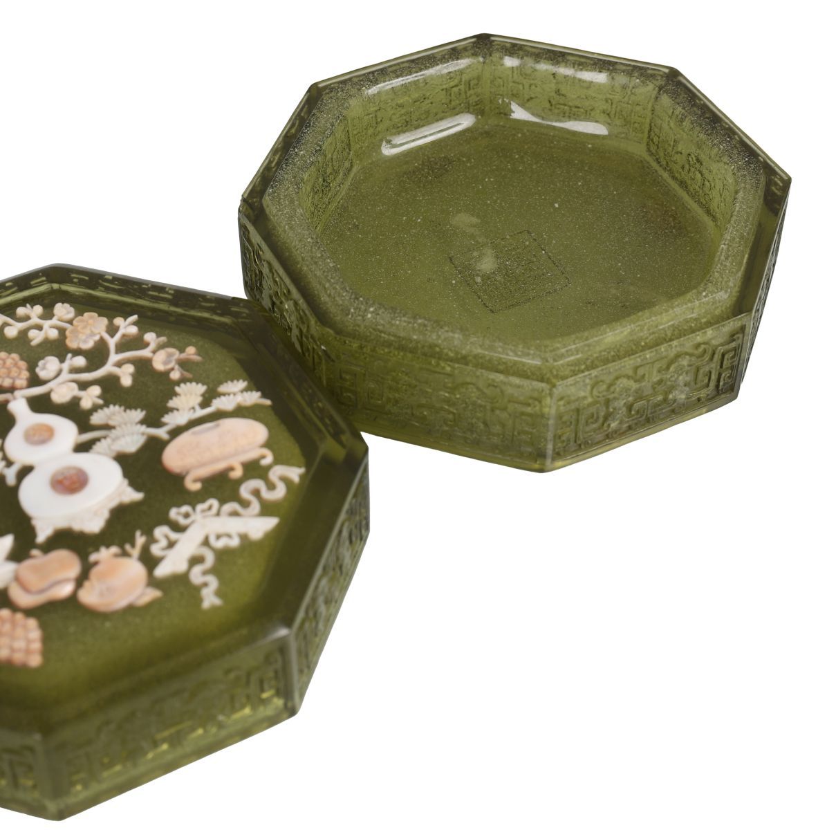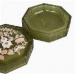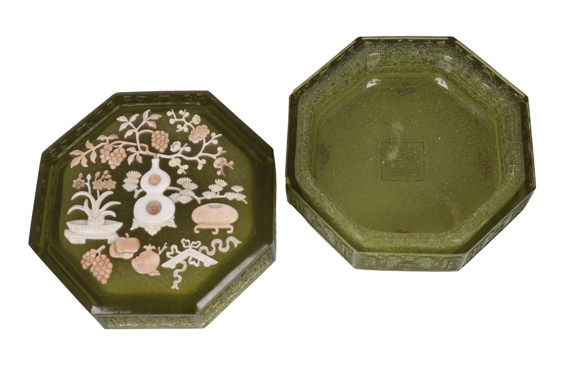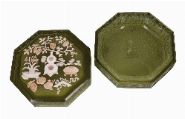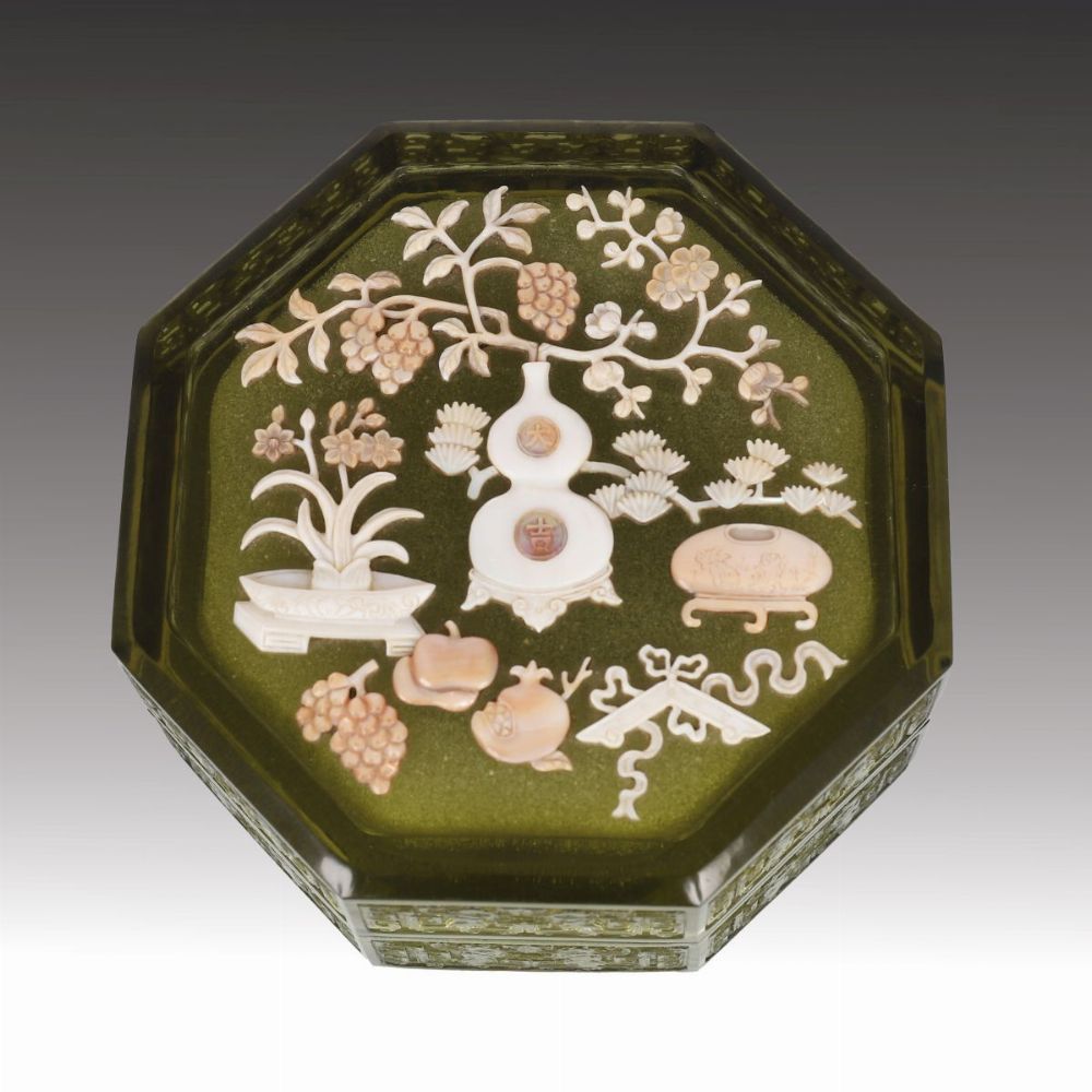 of hexagonal form with mother o'pearl overlay. Qianlong seal mark to the base; possibly Republican