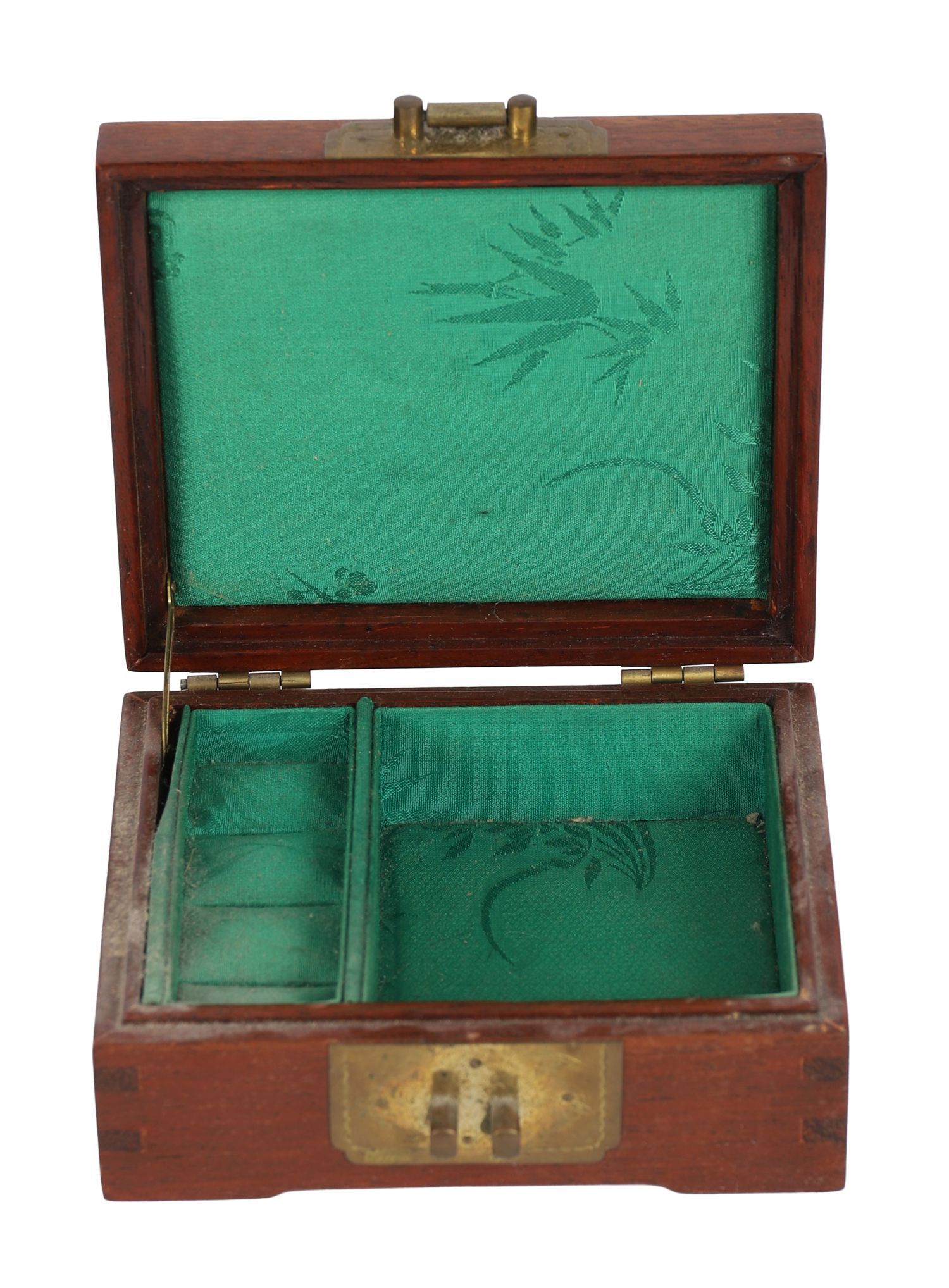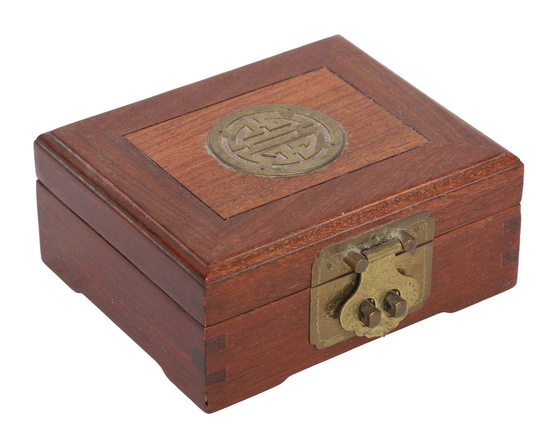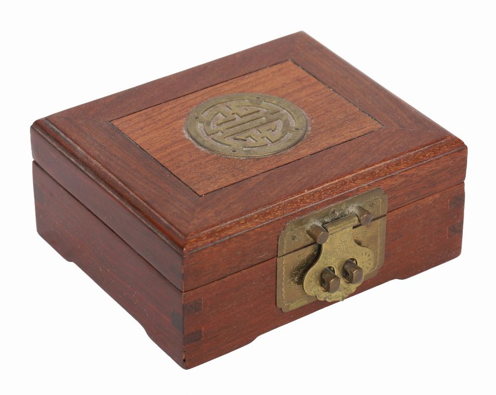 A small hardwood box with brass mounts, including a central medallion of endless knot design, fitted with an ornate clasp, Chinese.