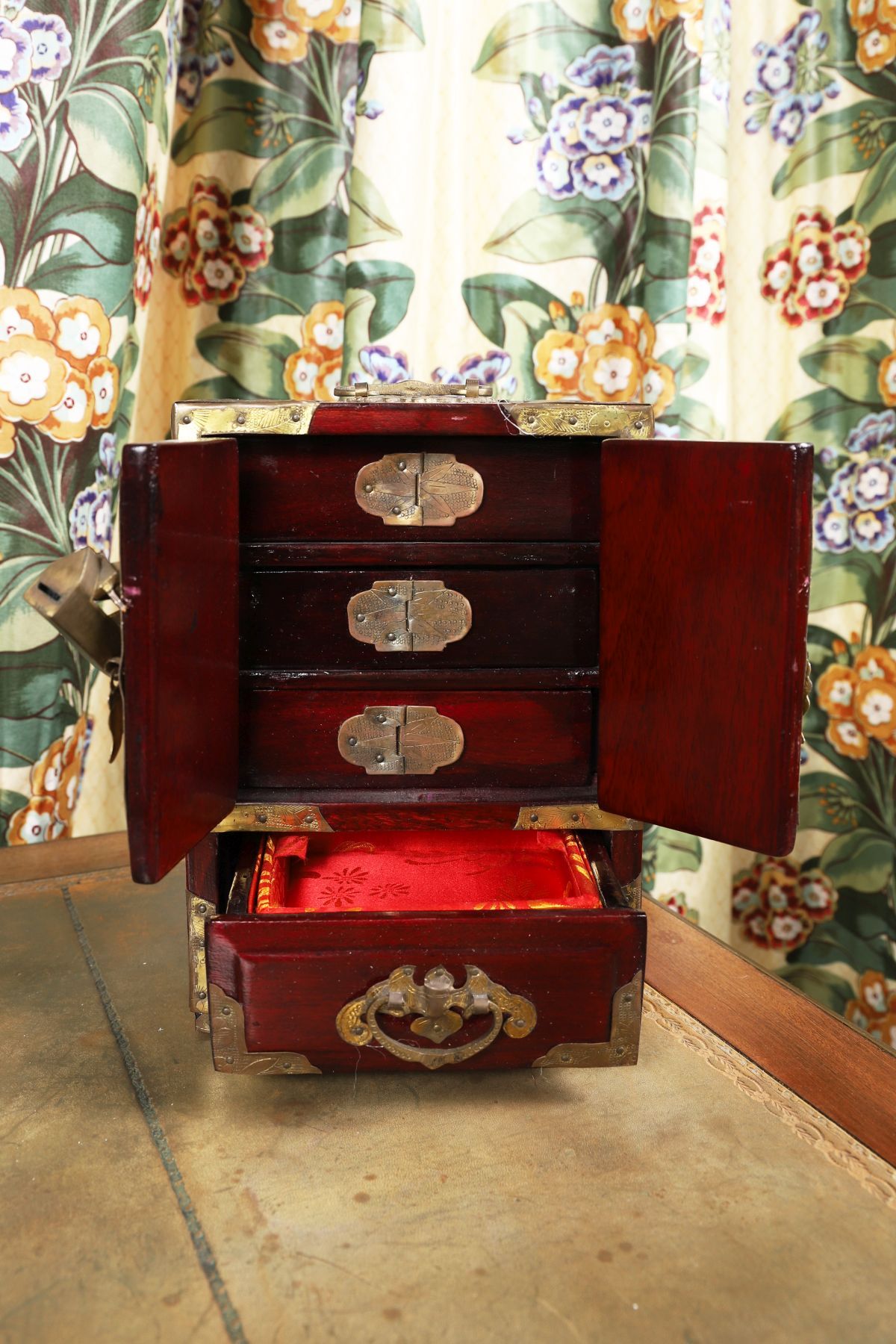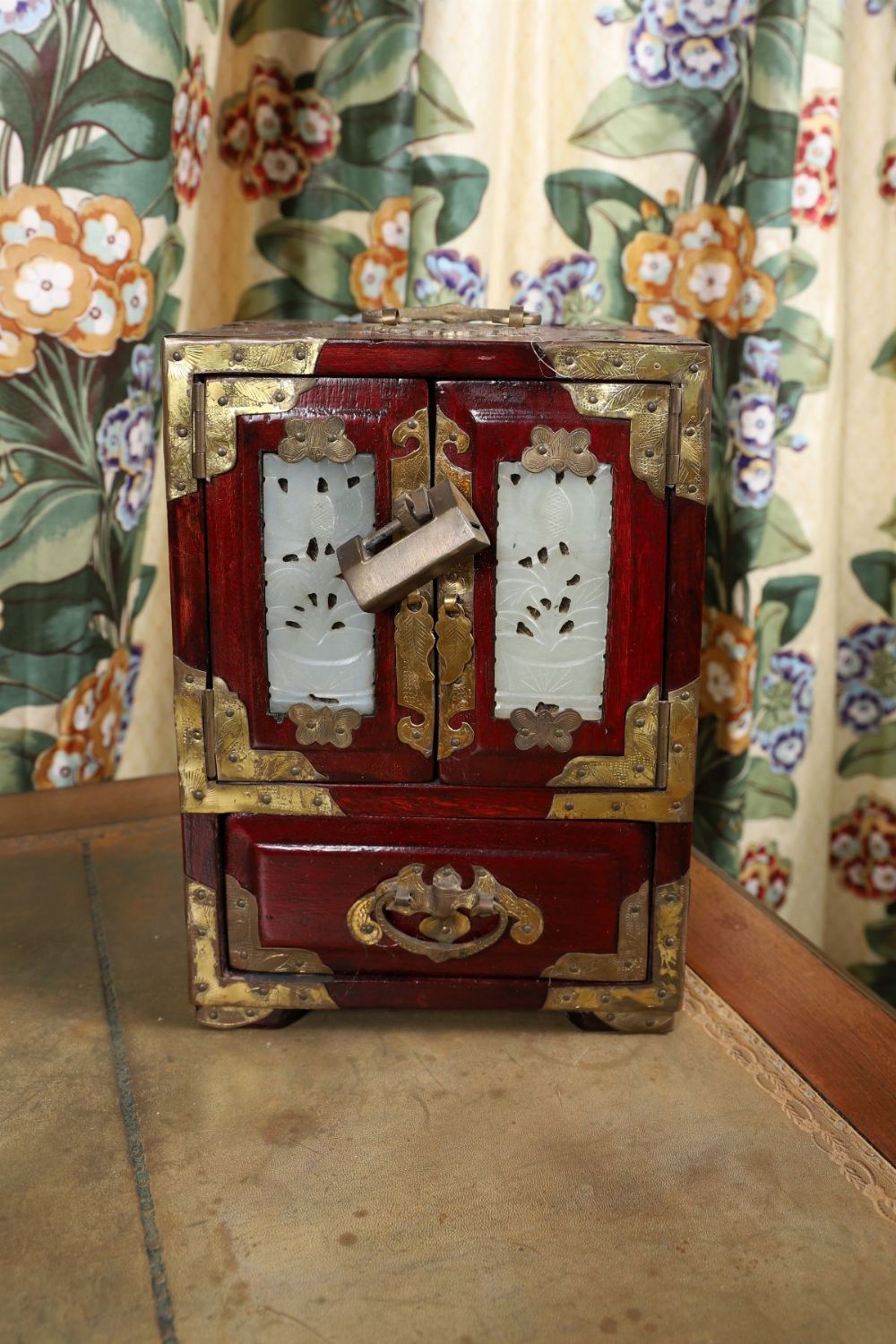 A Chinese hardwood jewellery cabinet of rectangular form, mounted with pierced and carved jade panels to the doors, fitted with brass mounts and handle. The interior arranged with drawers and compartments.