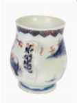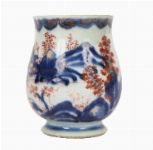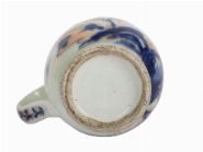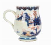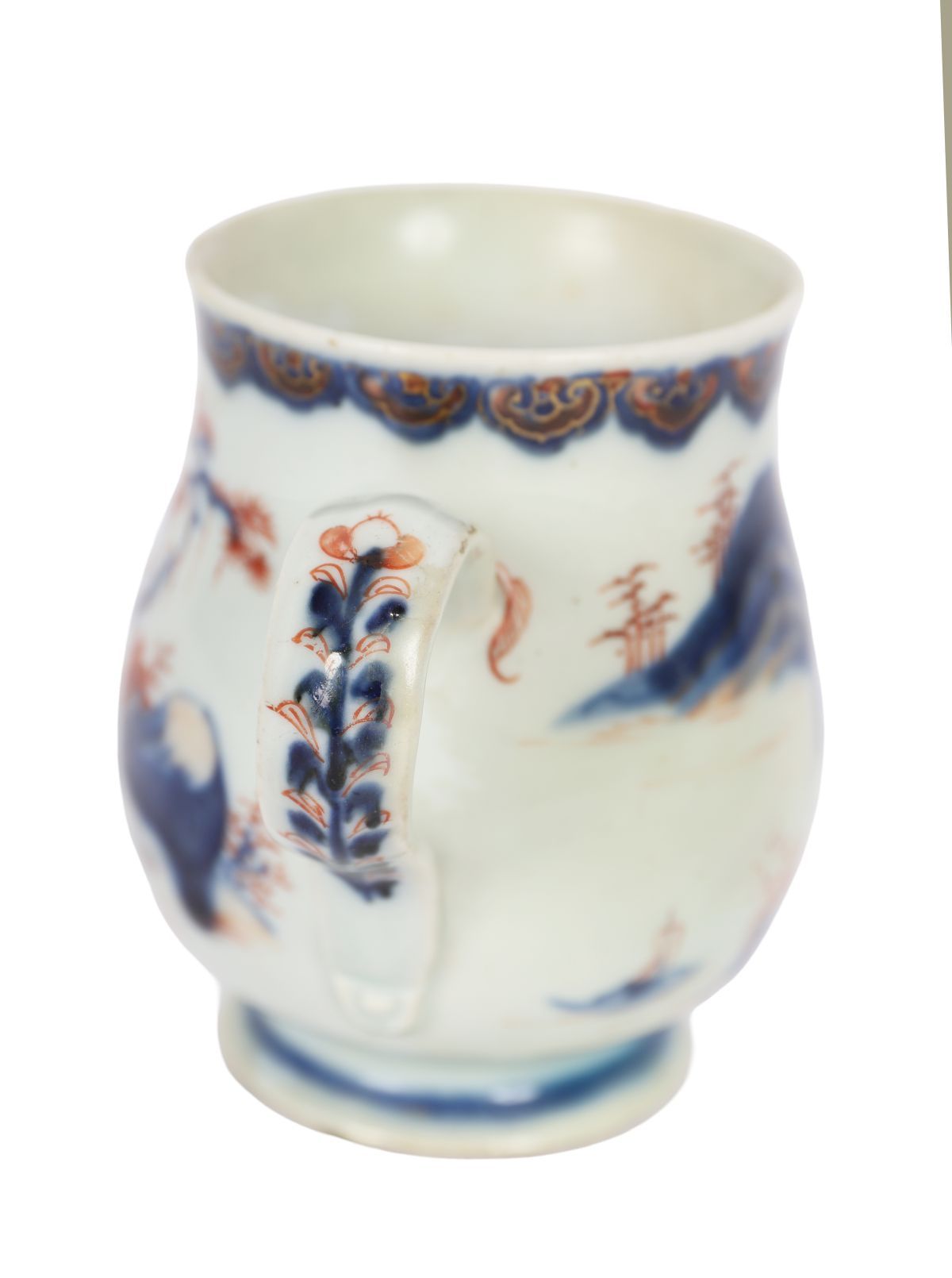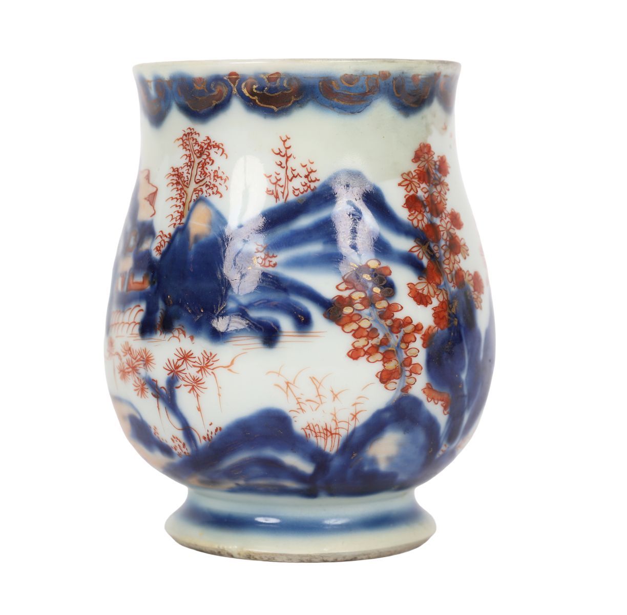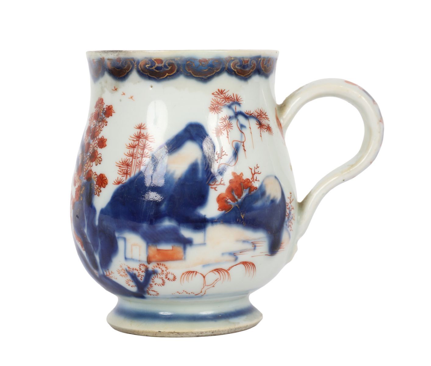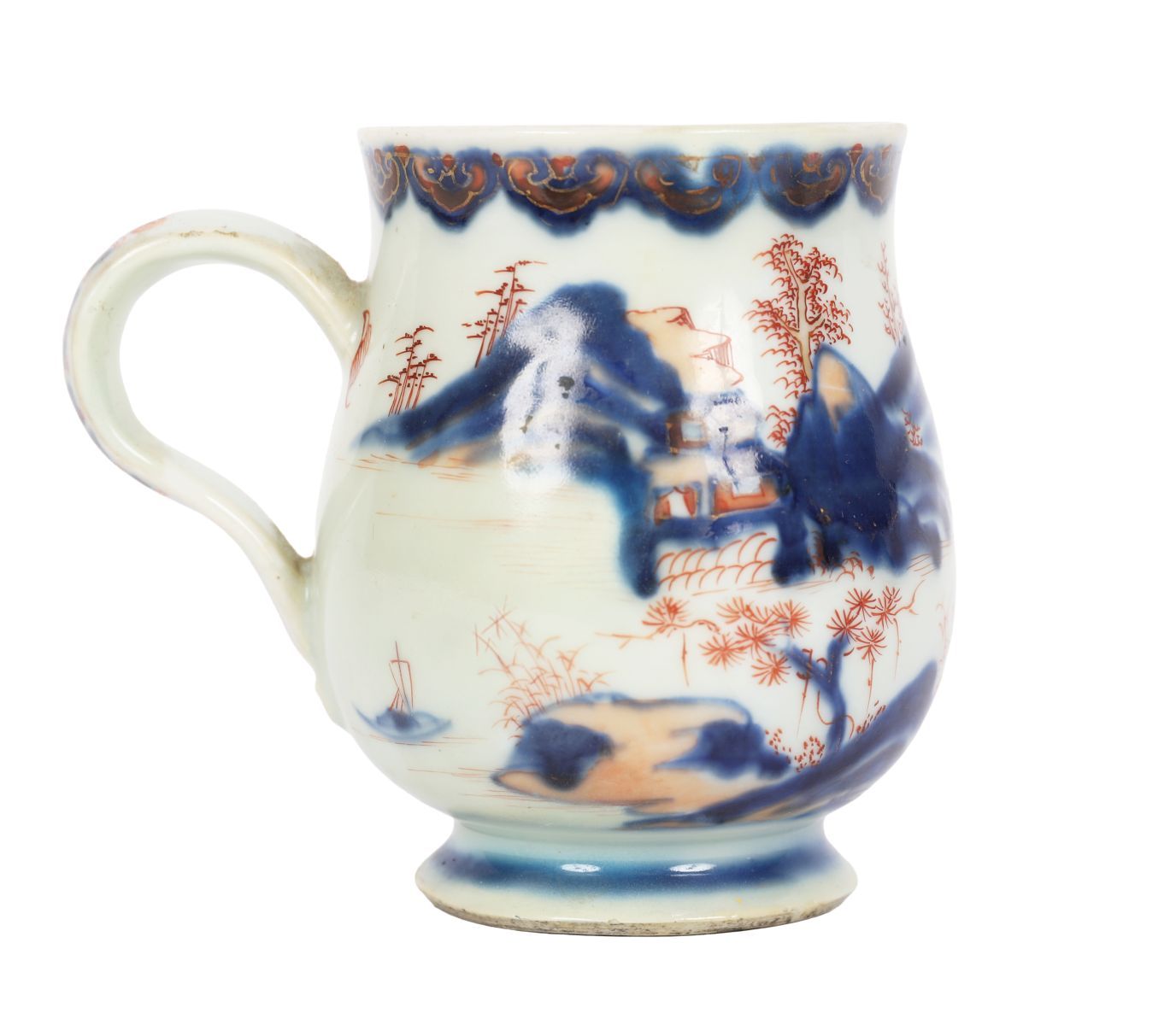 Qing dynasty, 18th century. Bulbous mug with loop handle, painted in underglaze blue and iron-red with gilt embellishment depicting garden pavilions and foliage.