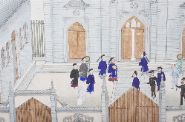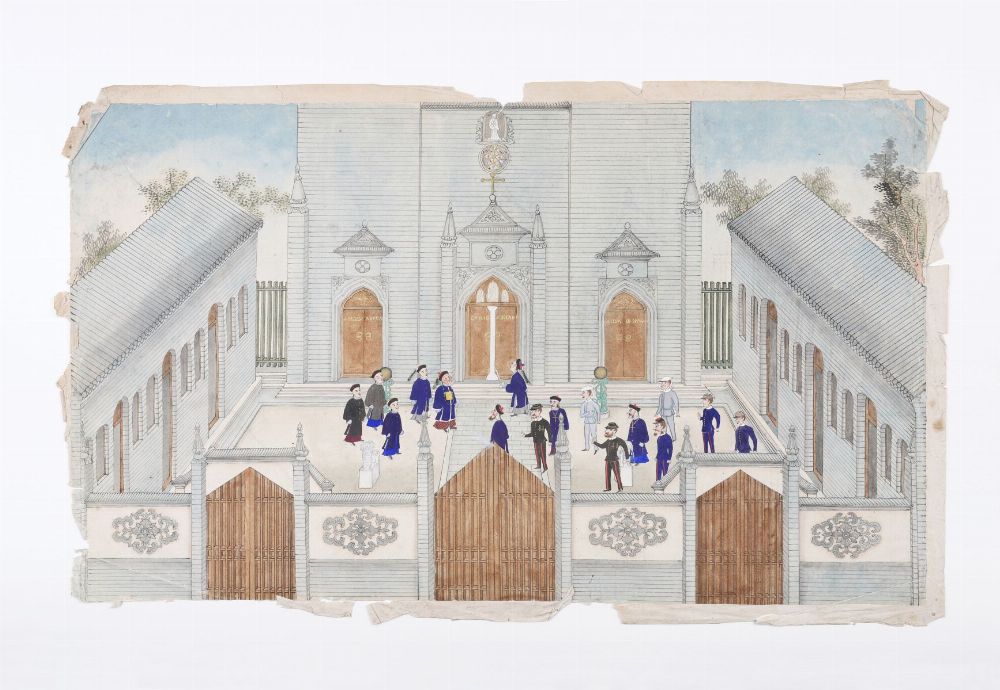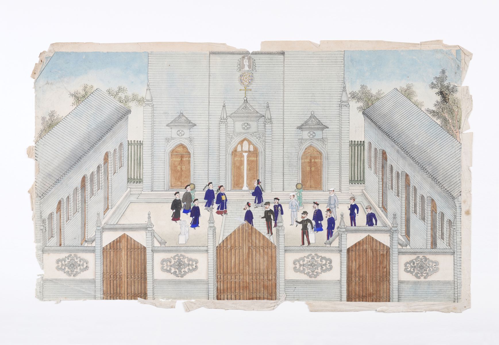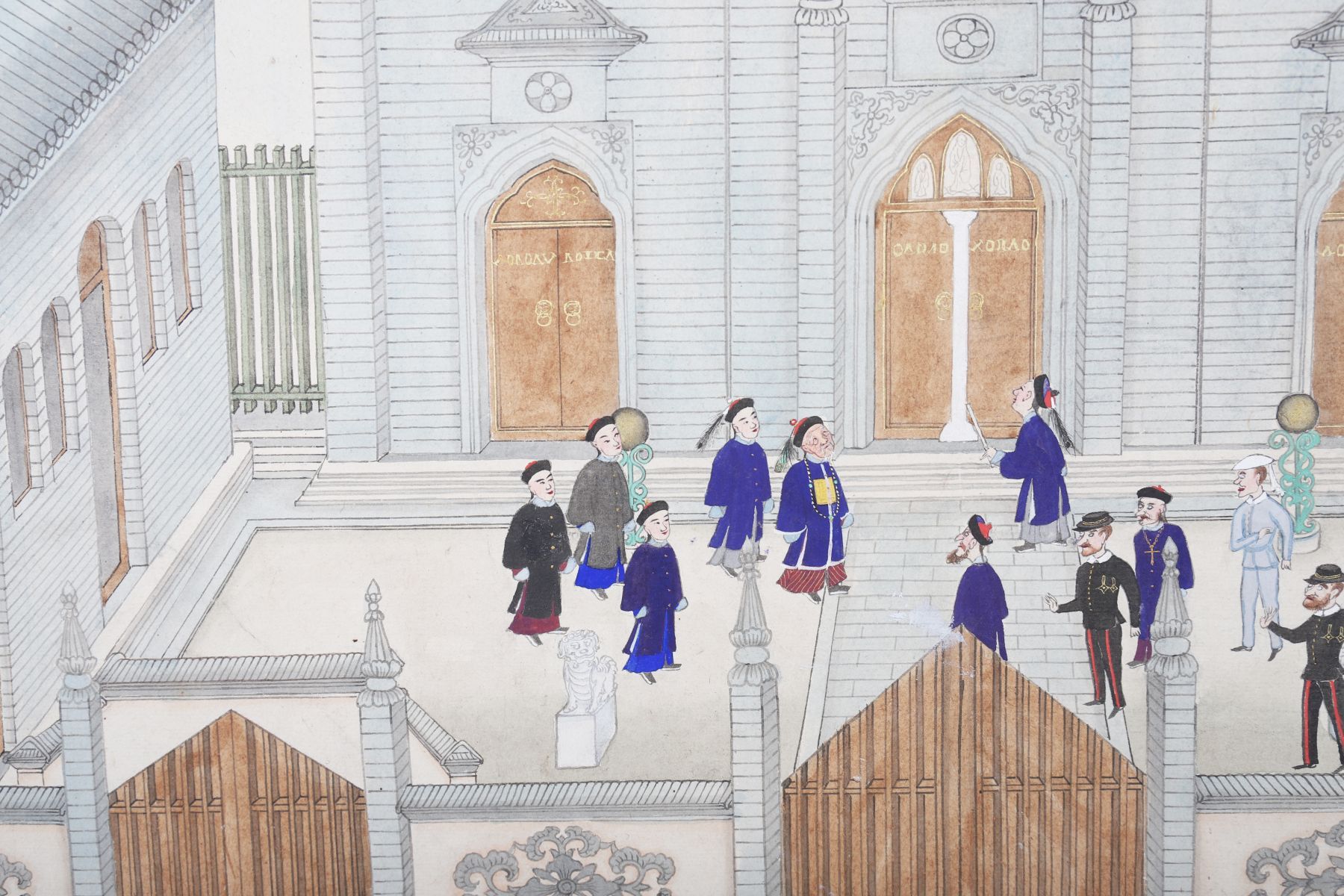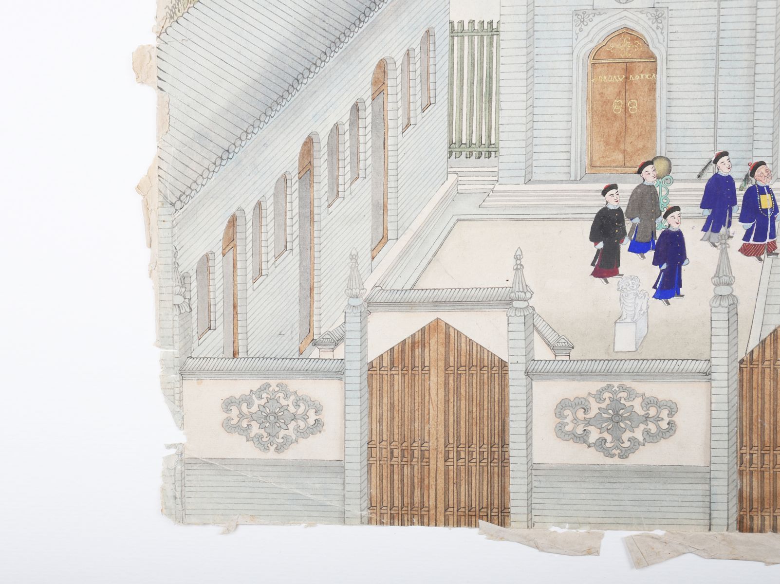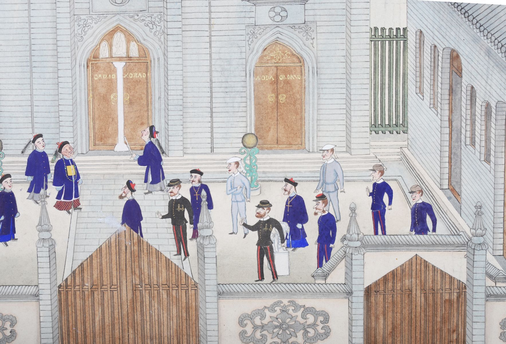 A finely detailed Chinese gouache painting on paper depicting an imperial or official audience within an elaborately furnished architectural interior. The composition shows figures in formal attire arranged symmetrically before a central dais, surrounded by ornate screens and banners. Executed in muted tones of blue, grey, and ochre, the work demonstrates the precise perspective and decorative finesse associated with late Qing export painting. Mounted on backing paper, with wear and edge losses consistent with age.