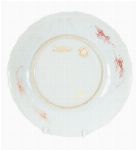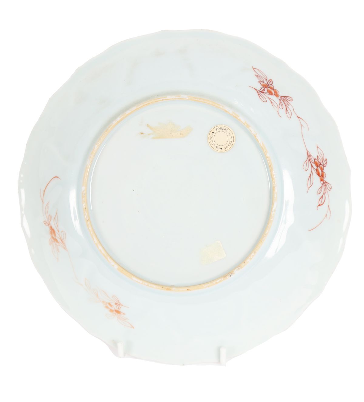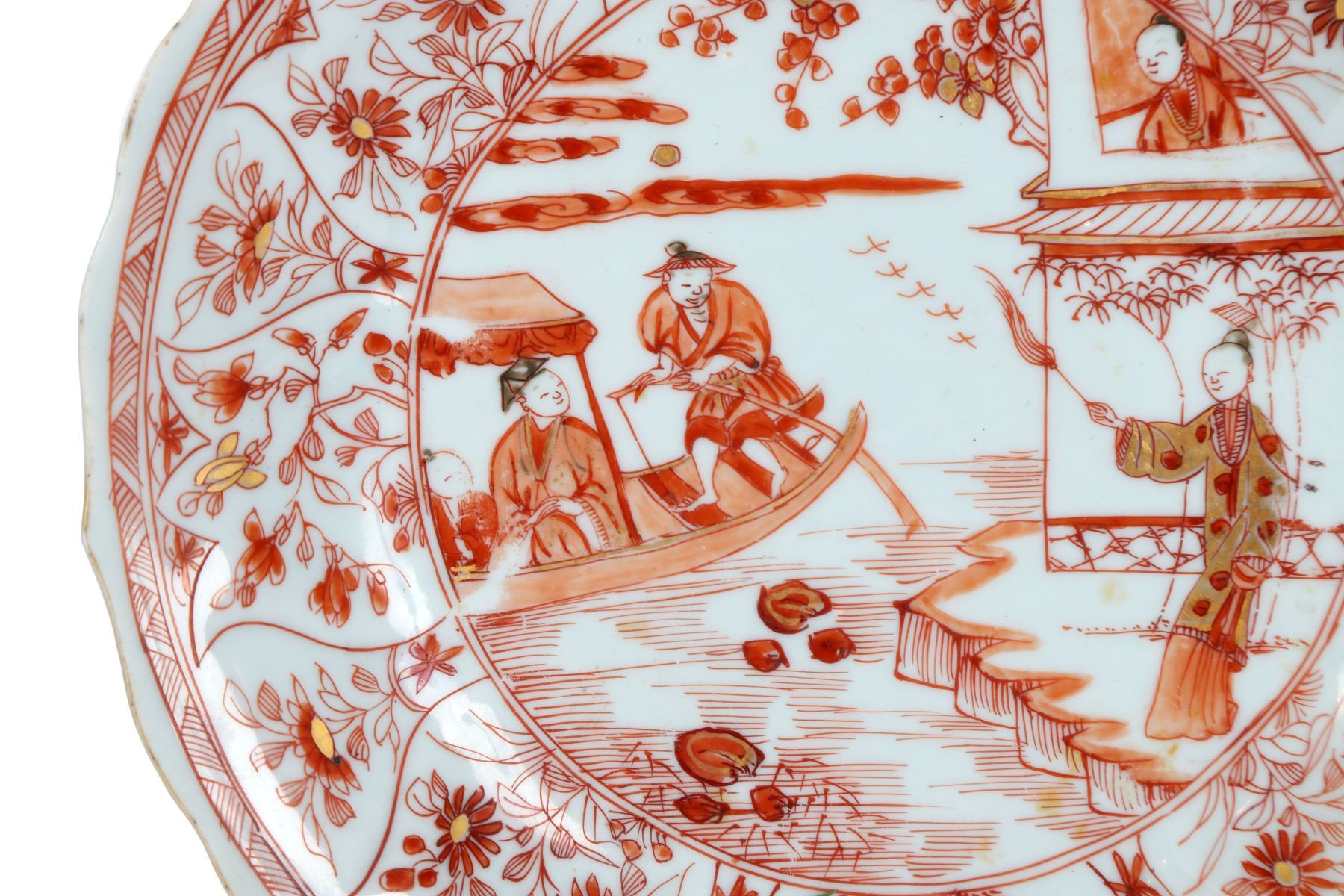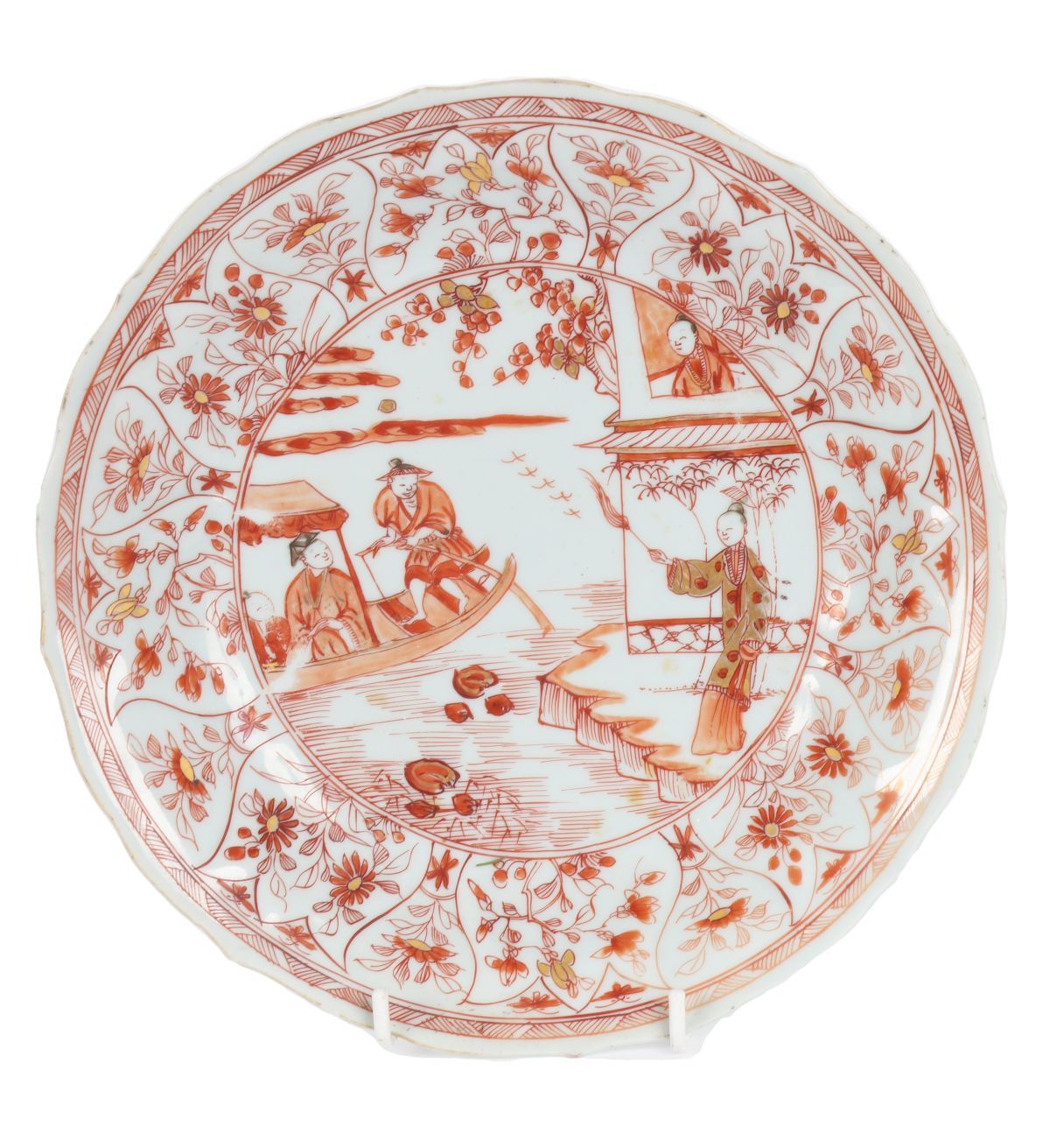 Of circular form with gently scalloped rim, finely decorated in iron-red and parcel-gilt enamels. The central roundel depicts a riverside scene with figures in a boat and on a terrace beneath a flowering tree, birds in flight above, all rendered with delicate line work and restrained use of gilding. The cavetto is moulded and divided into radiating panels, each painted with scrolling floral and foliate motifs in iron-red with gilt highlights, bordered by geometric bands. The reverse decorated with sparse floral sprays.