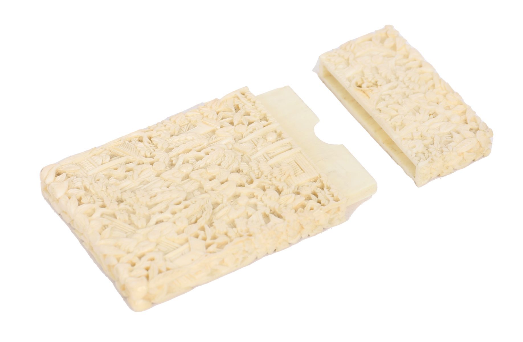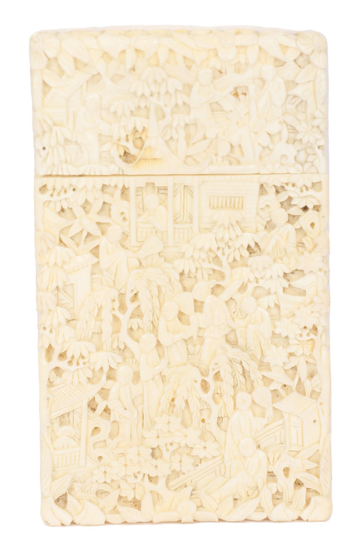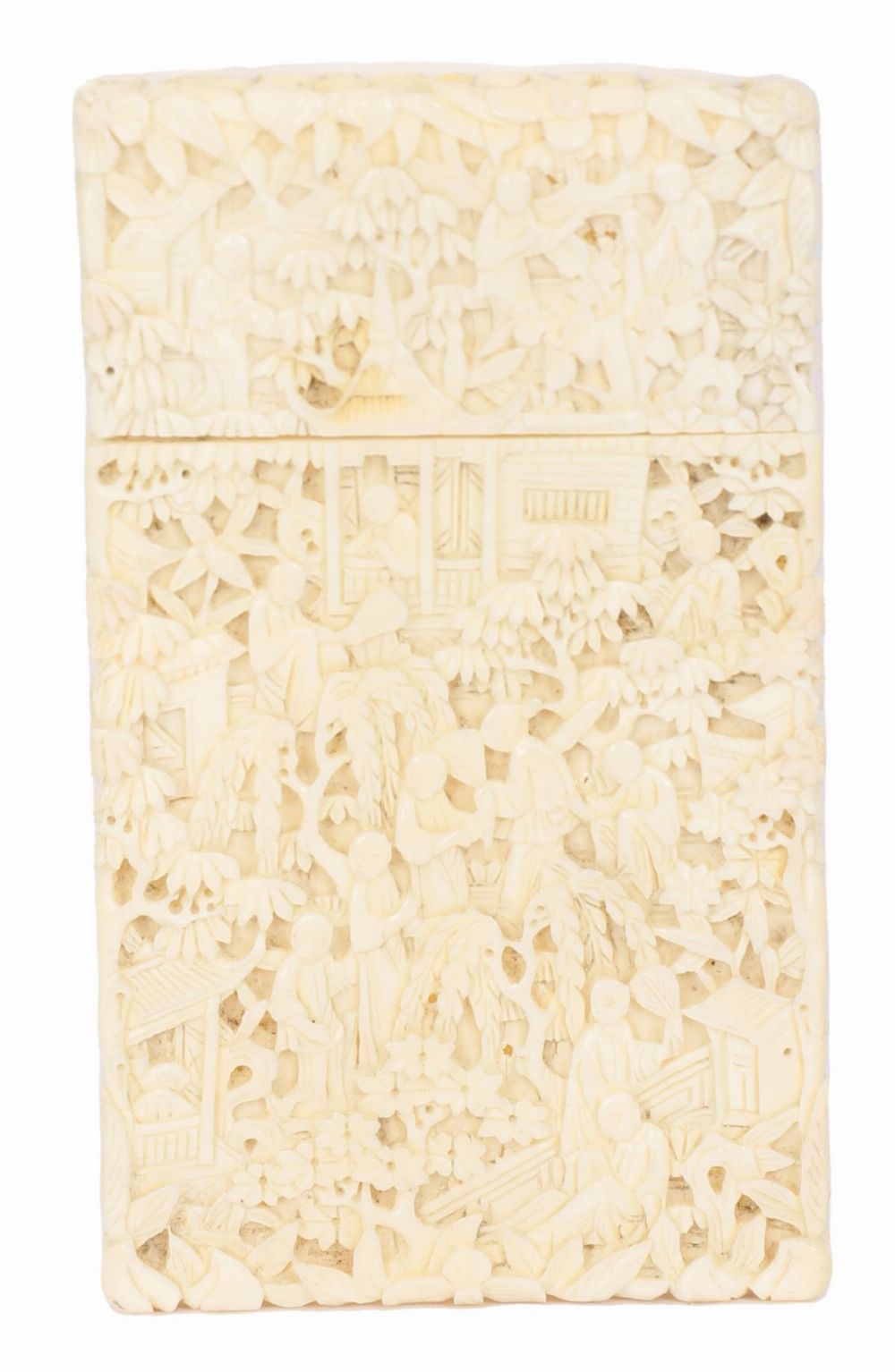Rectangular ivory card case, finely and densely carved in relief with continuous figural scenes within a garden landscape, including pavilions, trees and attendants, the decoration extending to both faces.