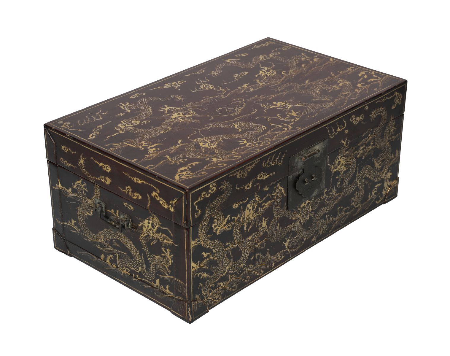 A Chinese lacquered rectangular chest, decorated throughout in gilt with sinuous five-clawed dragons amidst cloud scrolls and stylised waves. Fitted with a large brass clasp and corner mounts, and retaining a rich dark brown lacquer ground.