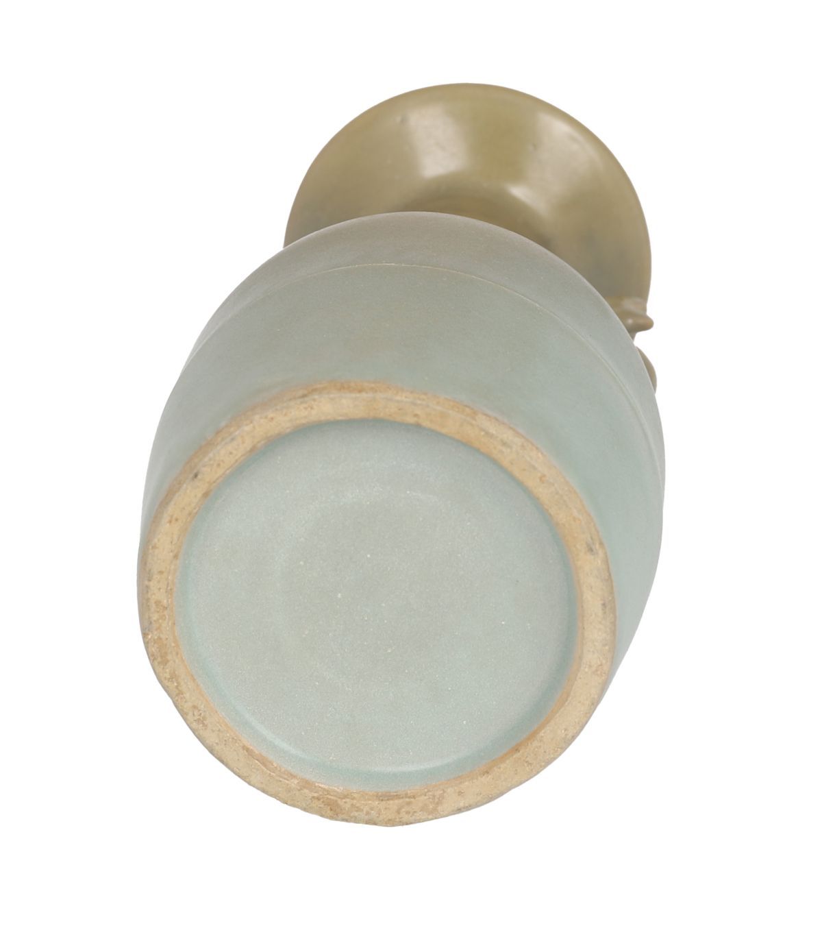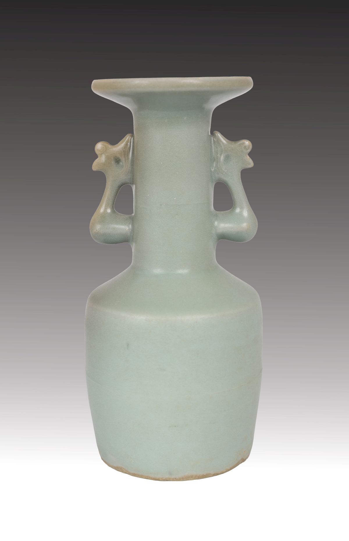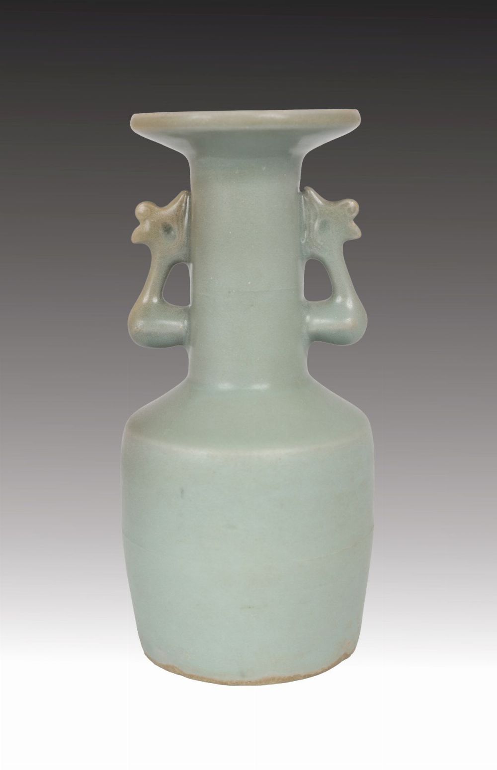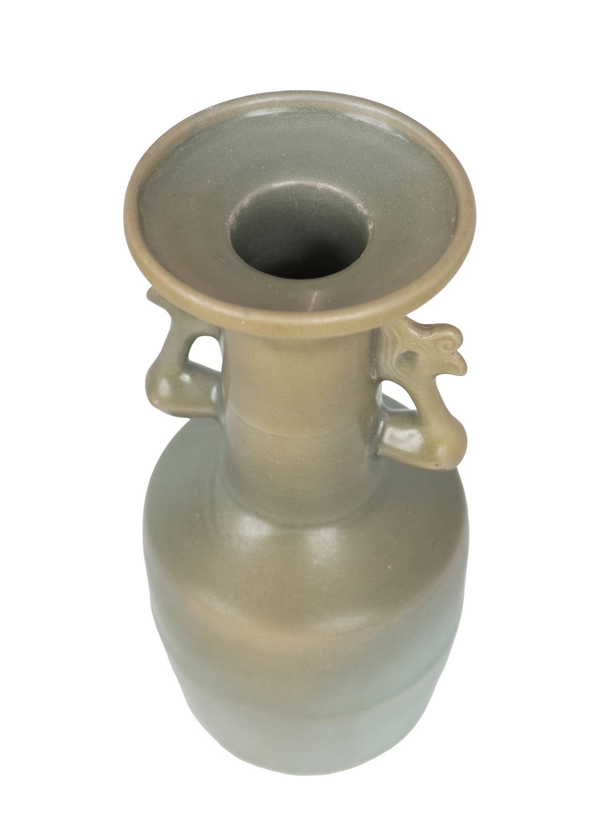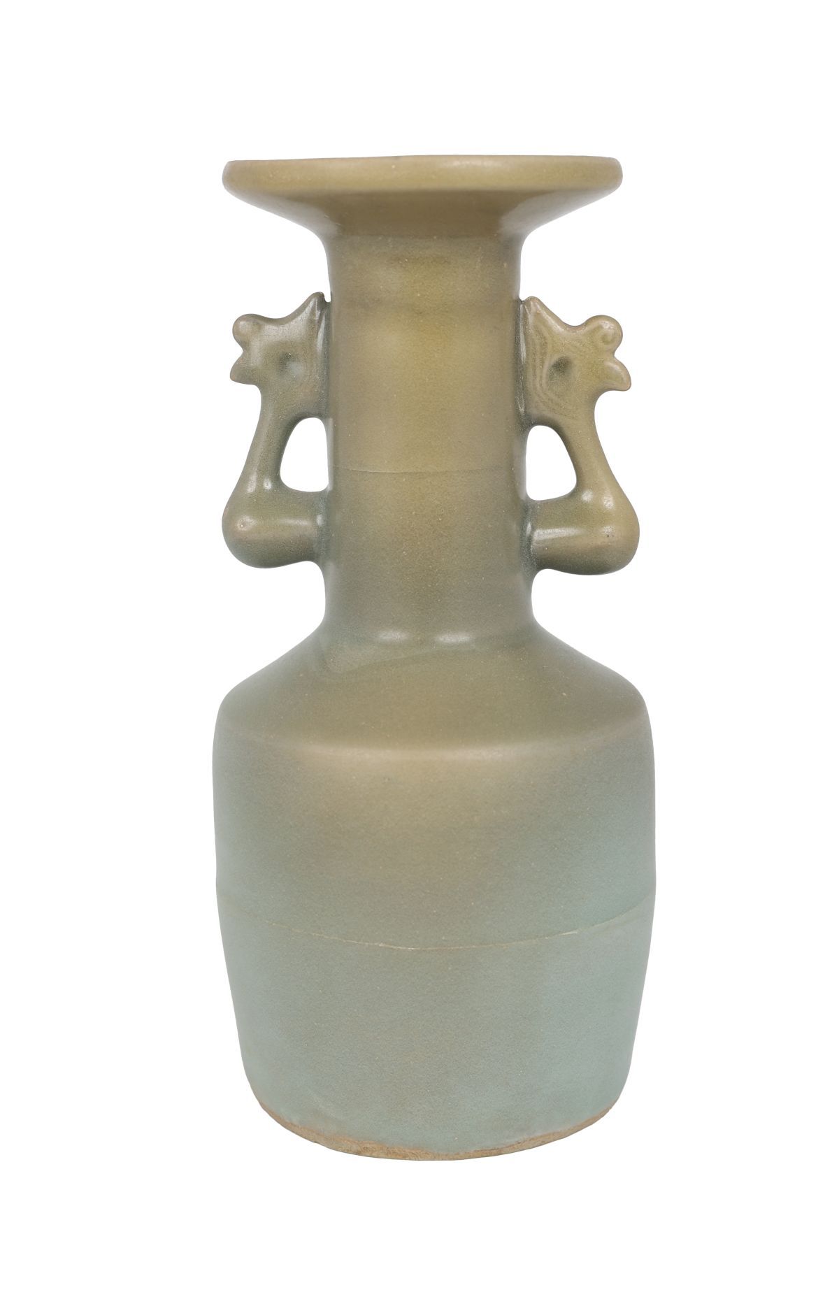 the mallet-shaped body, with sides tapering slightly towards the foot from the canted shoulder. The tall neck is flanked by a pair of phoenix handles below the widely flared mouth with upturned rim. The vase is covered overall with an even glaze of soft sea-green tone.