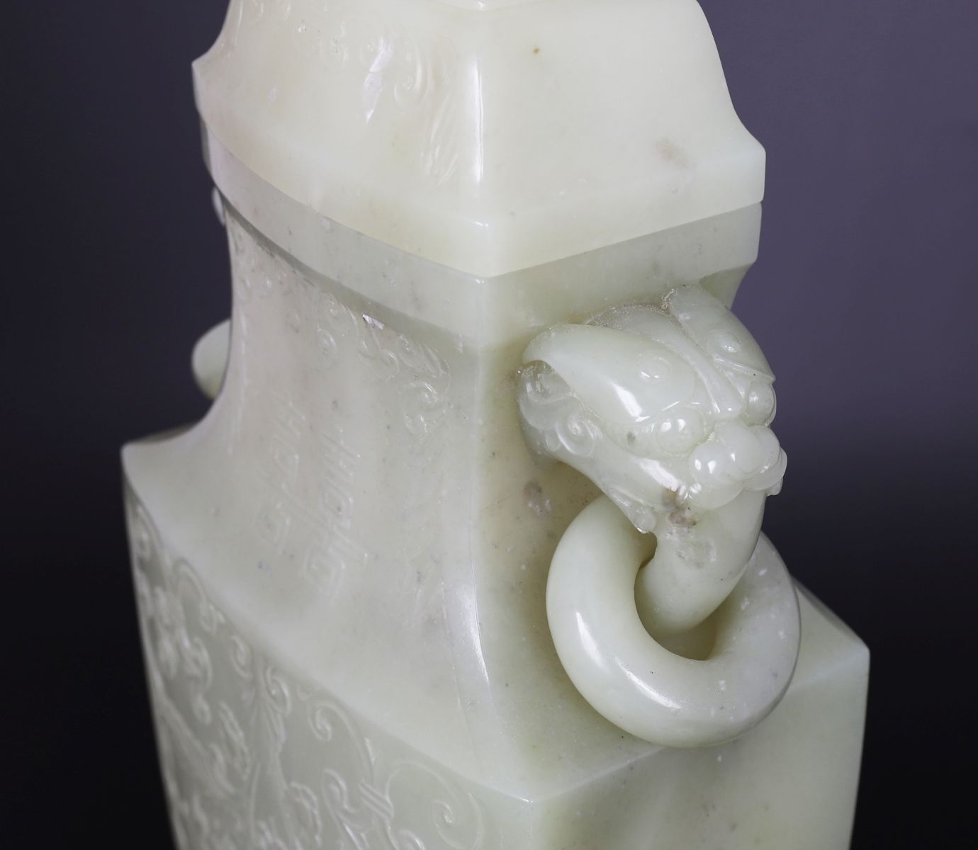 celadon, of square baluster form, with low relief blossom and leaf decoration, complete with elephant head ring handles.