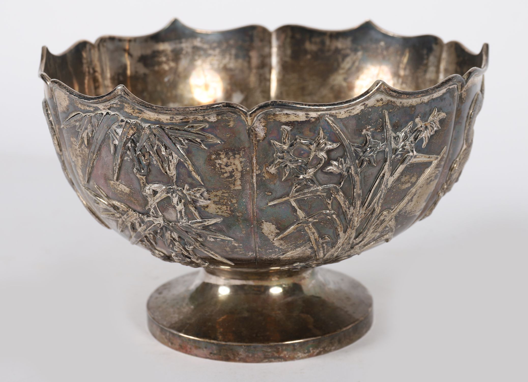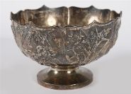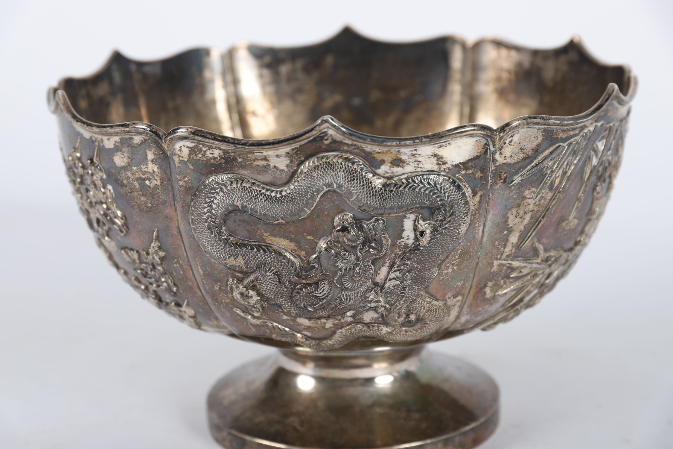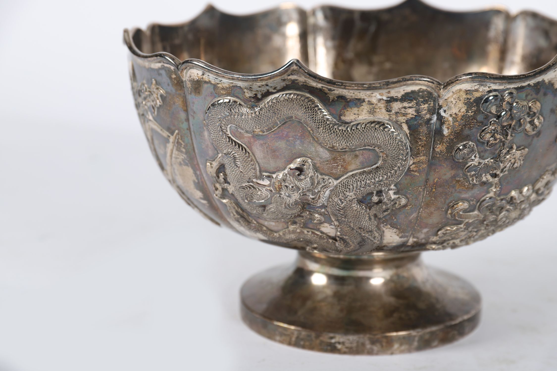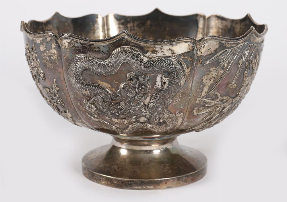 A finely worked Asian silver bowl, possibly Chinese or Japanese, of lobed form with repoussé decoration depicting a coiled dragon amidst clouds and cherry blossom trees. Raised on a plain foot rim. Unmarked, but of good quality.