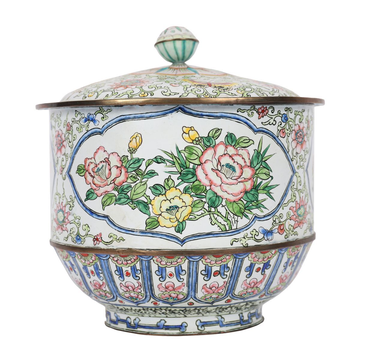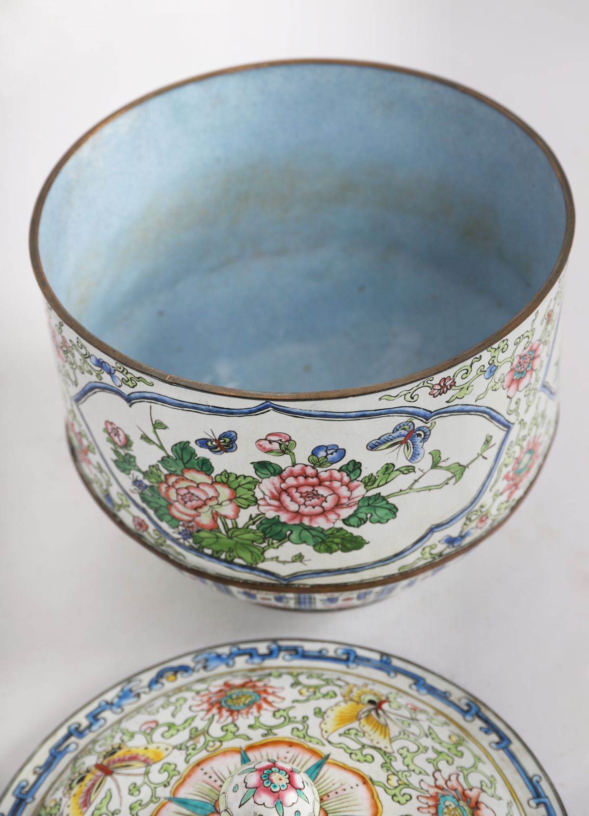 A fine Chinese painted enamel bowl and cover, decorated in polychrome enamels with panels of peony and prunus blossoms amidst scrolling foliage on a white ground, framed within blue borders, the cover with matching floral design and a ribbed knop finial. The base with decorative petal borders in alternating blue, pink, and white tones.