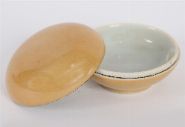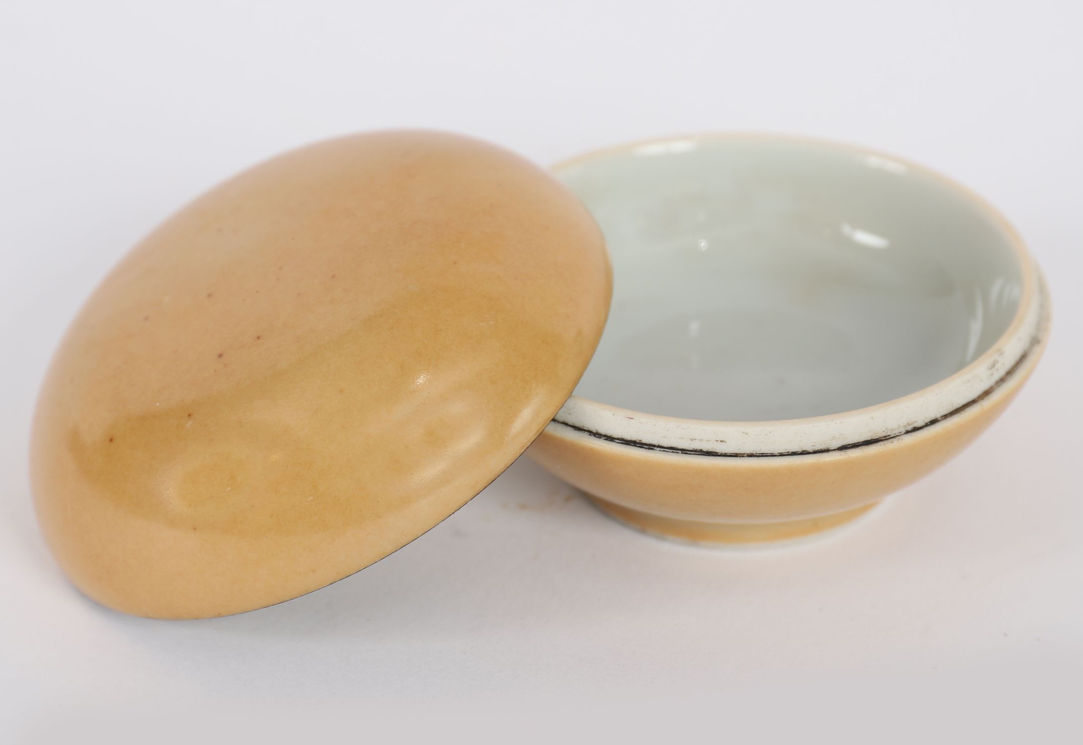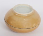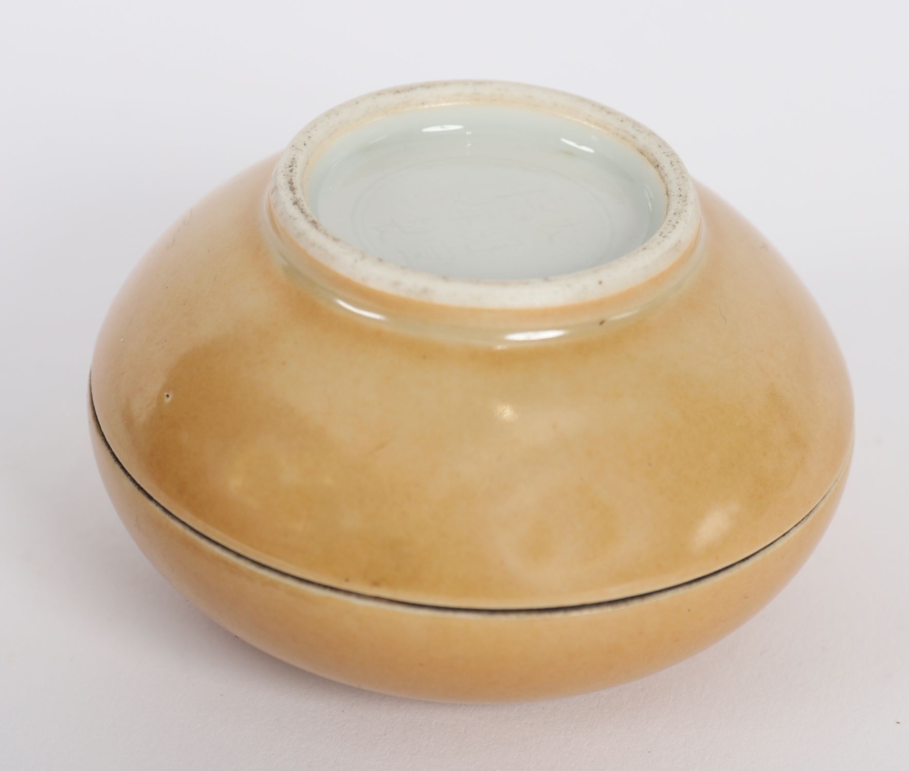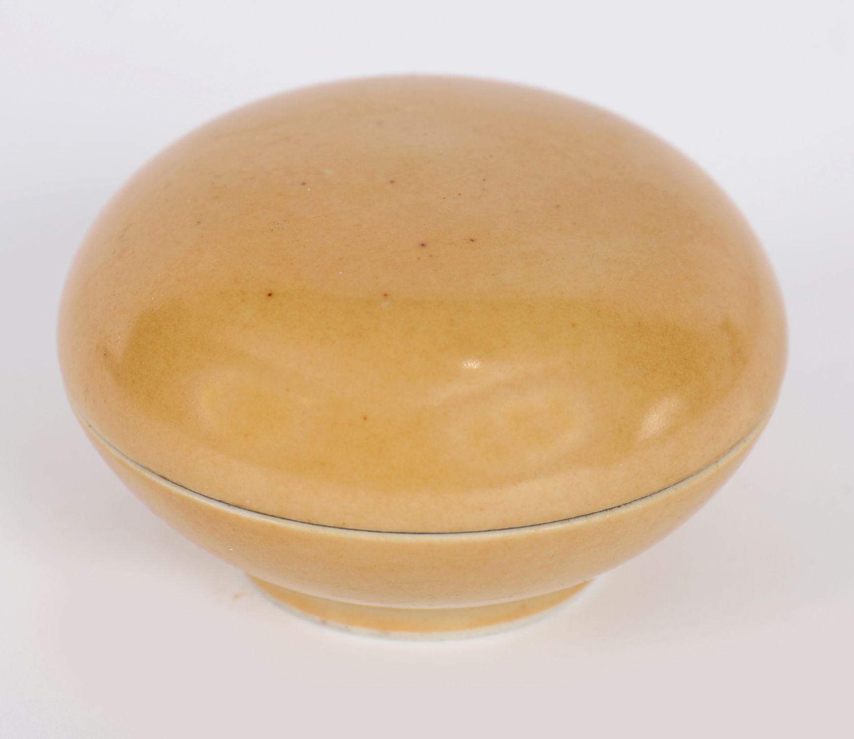 A Chinese porcelain paste jar and cover, the exterior finished in a mustard-yellow glaze, the interior plain white. Domed cover and compact form.