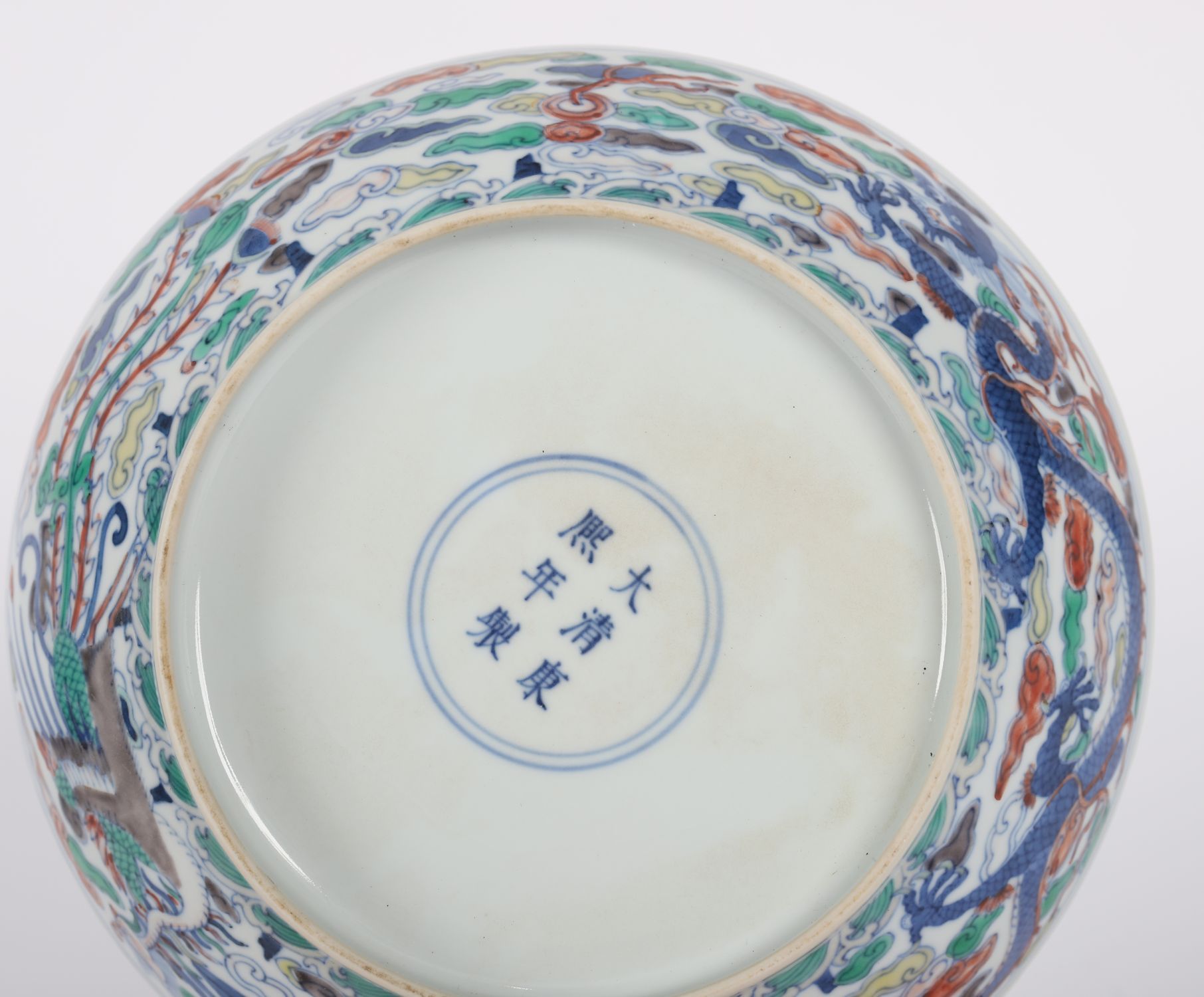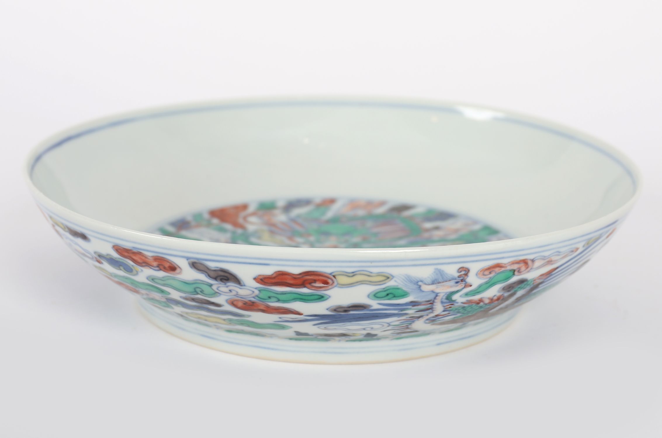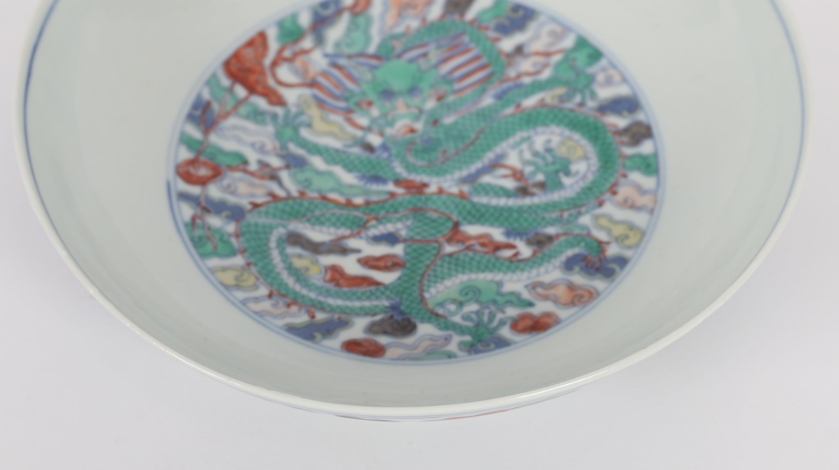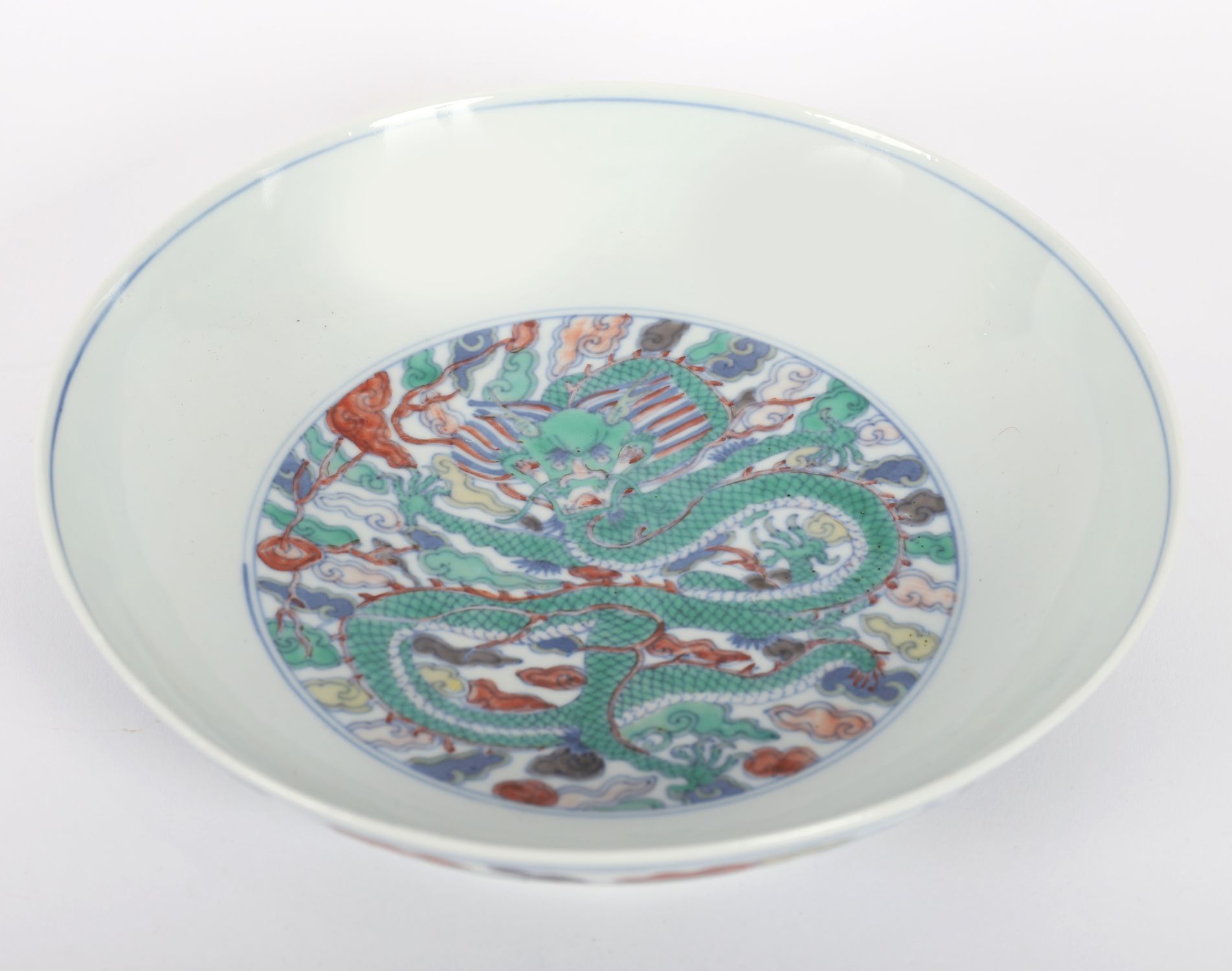A Chinese porcelain dish decorated to the centre with a five-clawed green dragon chasing a flaming pearl among multicoloured clouds. The reverse with further cloud motifs and a six-character mark within a double circle.