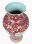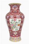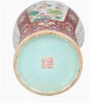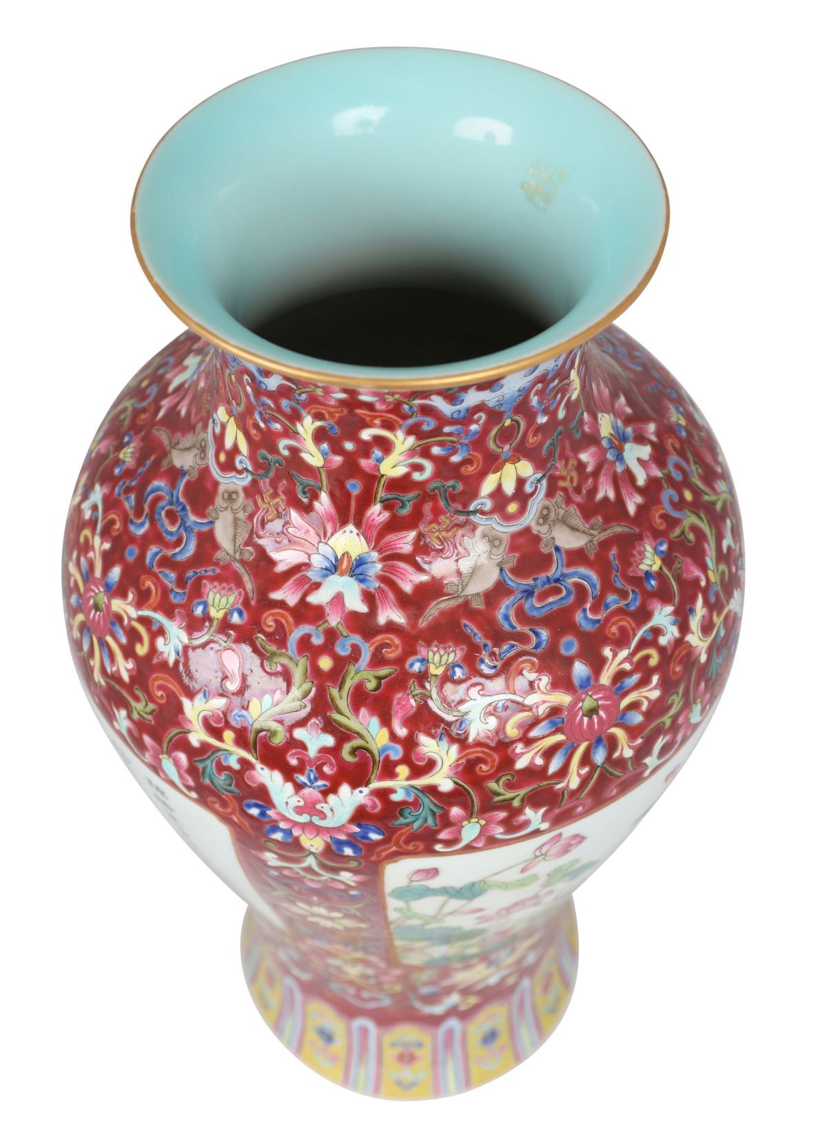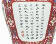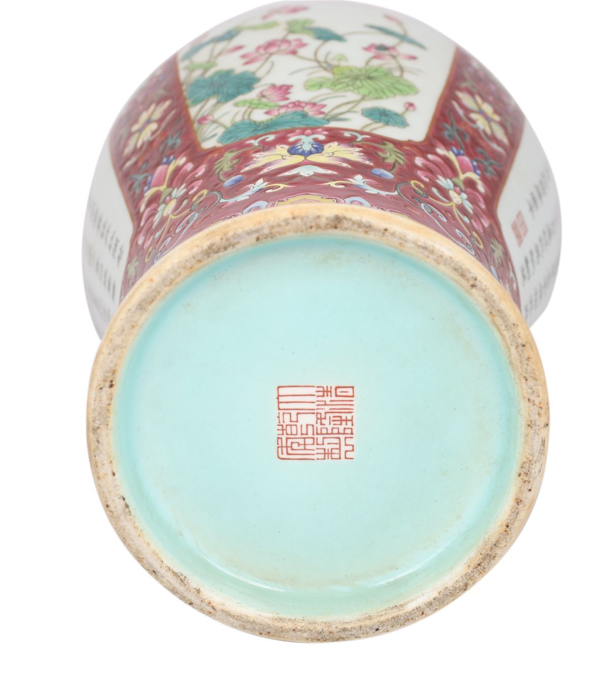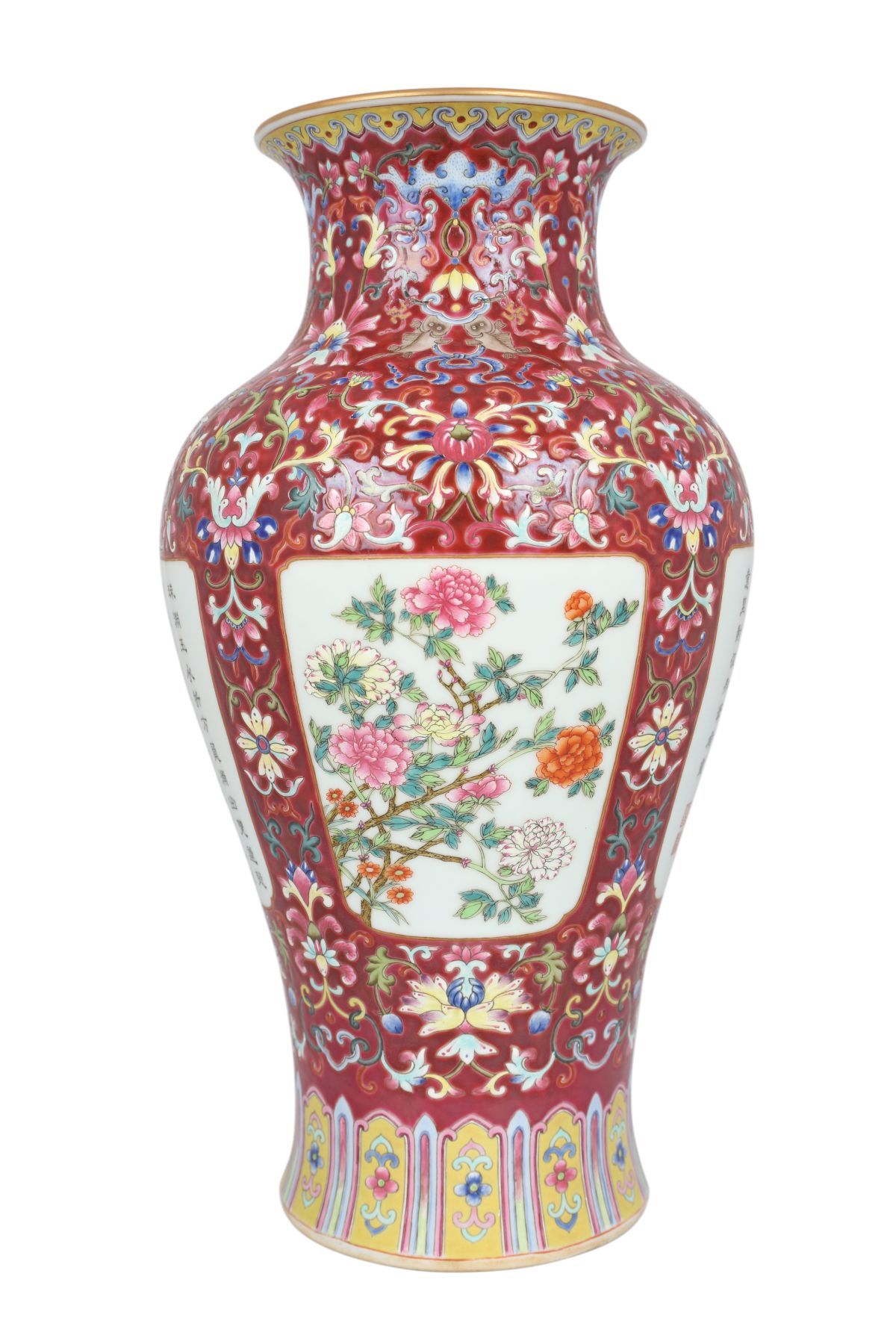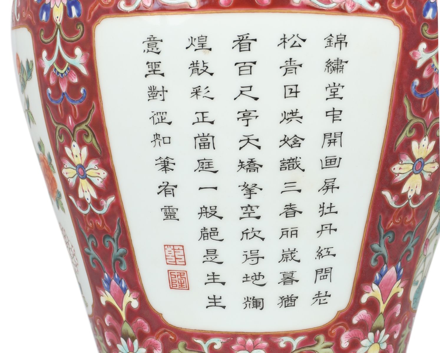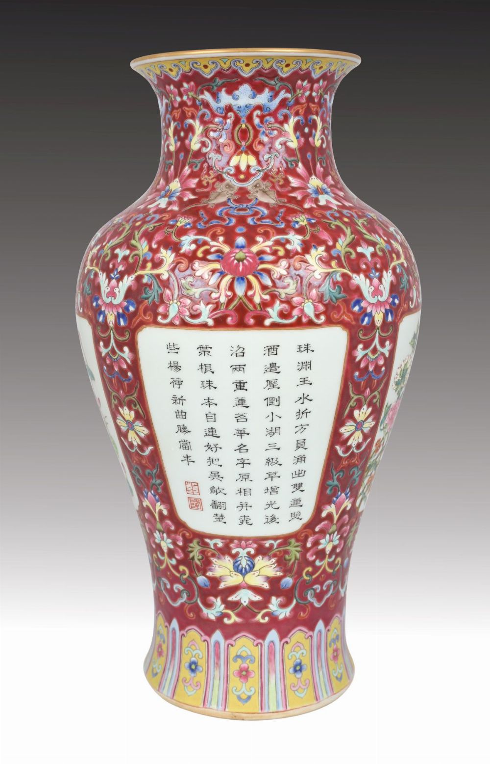 of baluster form with all-over floral decoration on a ruby ground with famille rose reserves and poetry inscriptions. Seal mark of Qianlong.