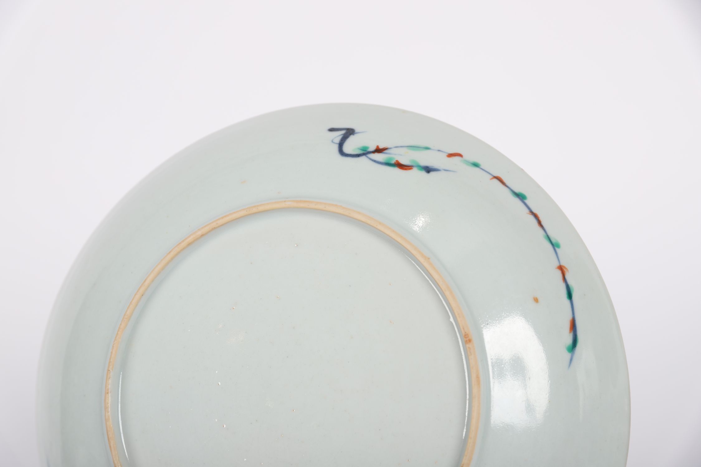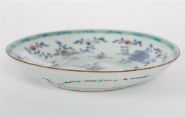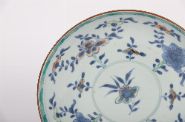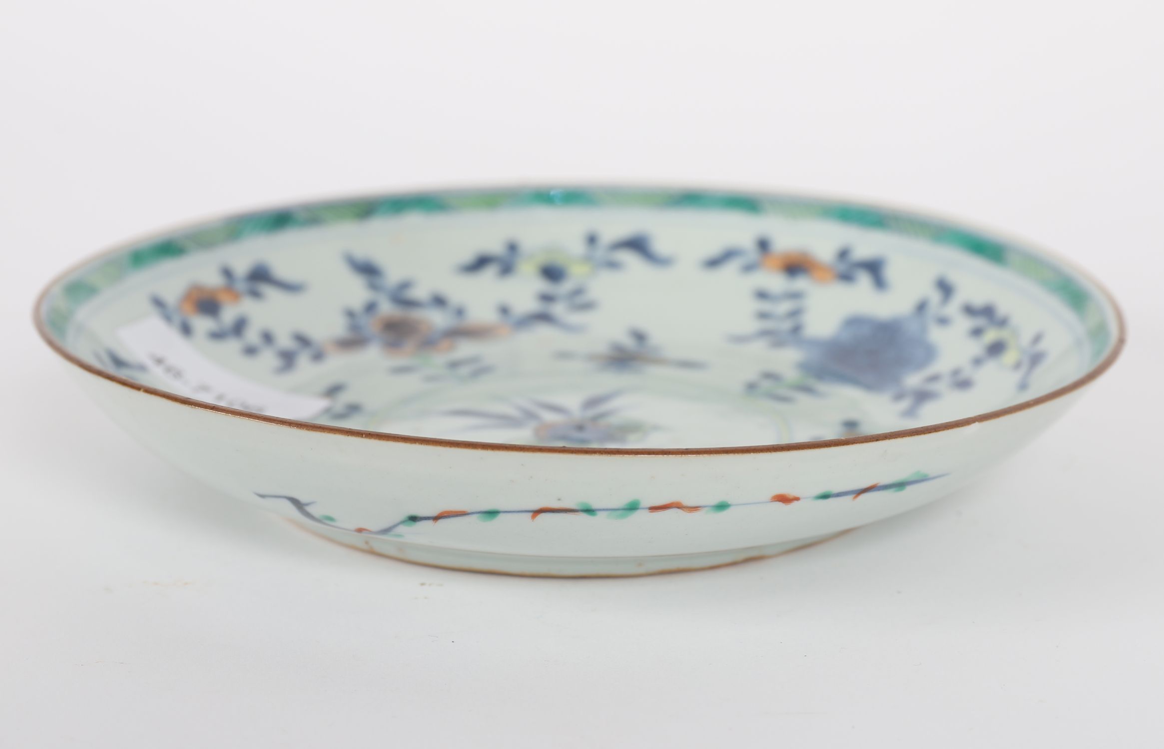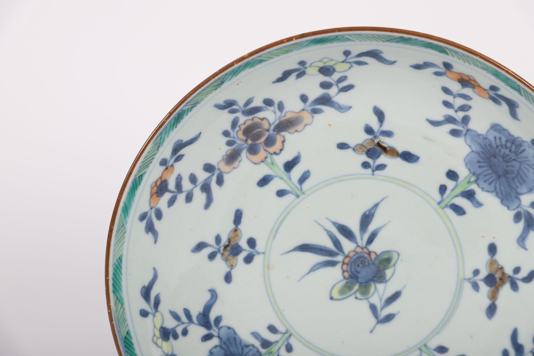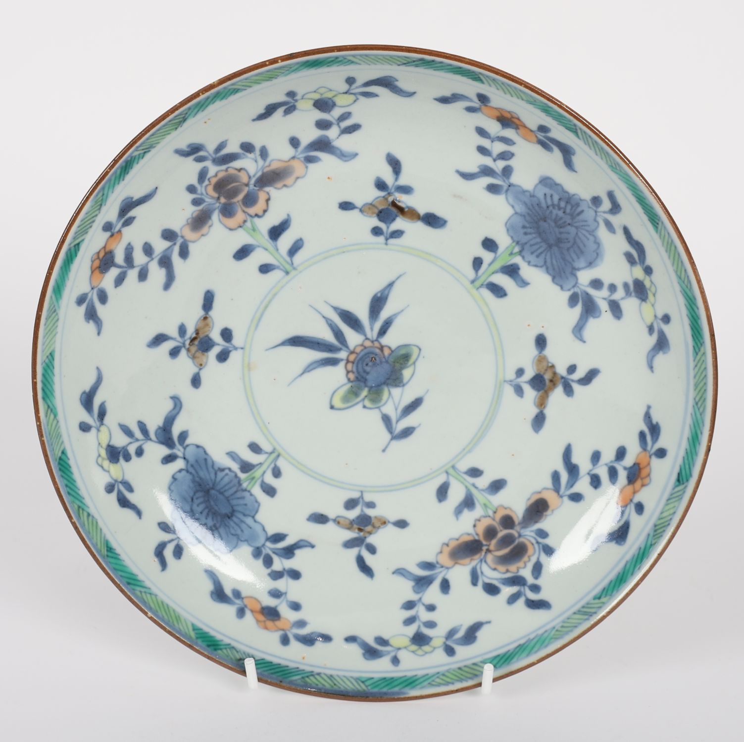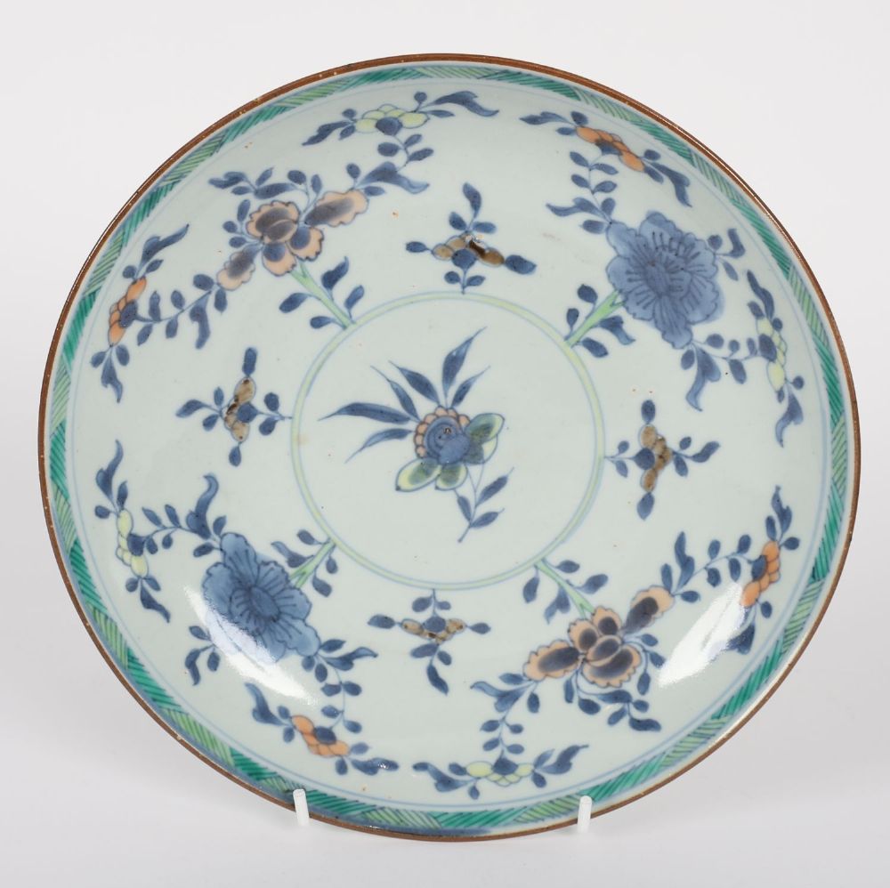 A single Chinese porcelain dish, decorated with symmetrical sprays of lotus and chrysanthemum blossoms in underglaze blue, green, and iron-red enamels, with a green trellis-patterned rim.