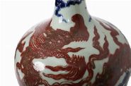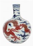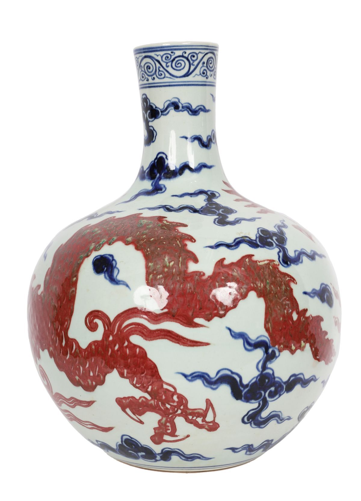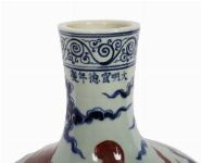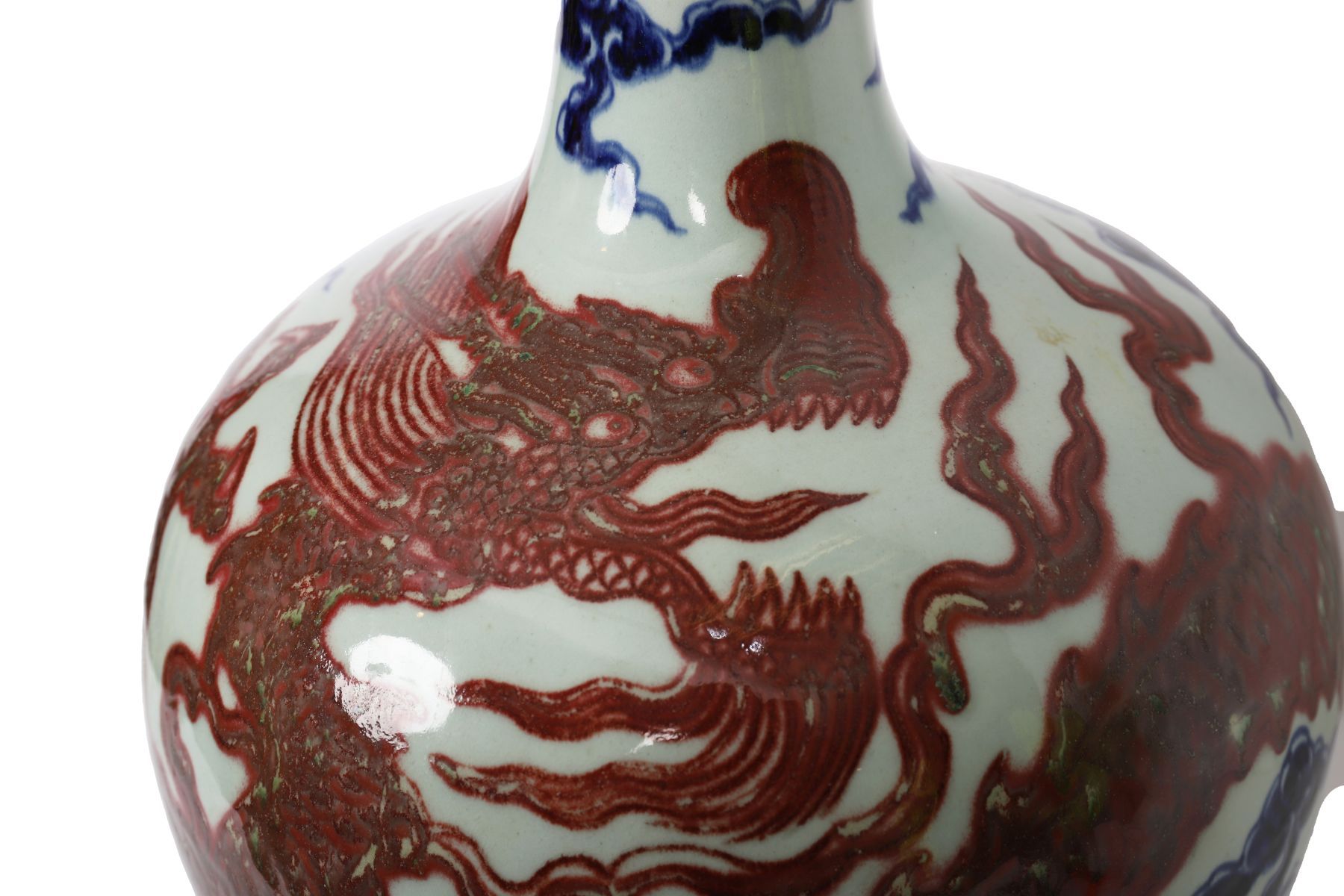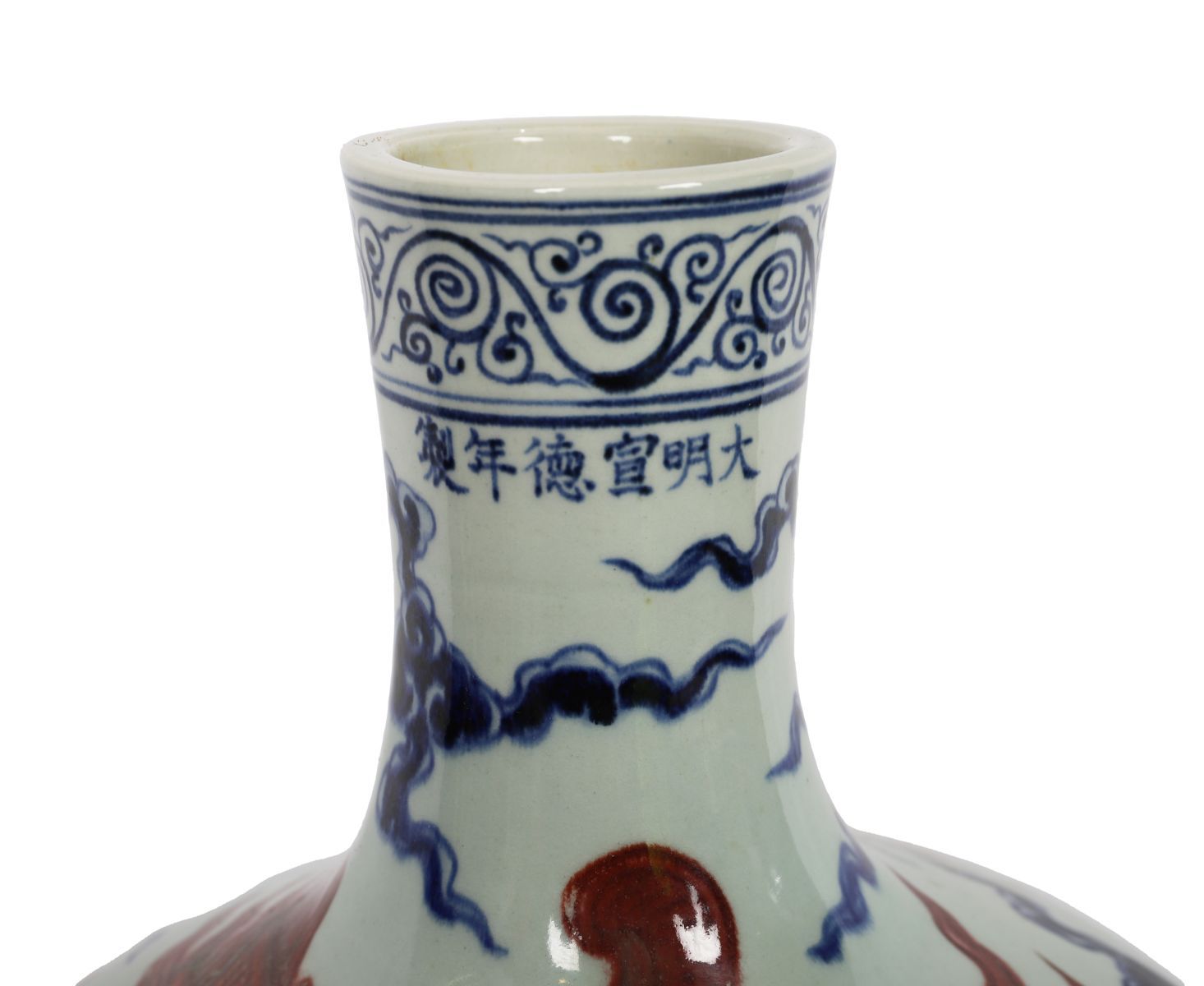 A Chinese porcelain baluster vase decorated with underglaze blue and iron-red dragons, the neck bearing a Ming six-character reign mark