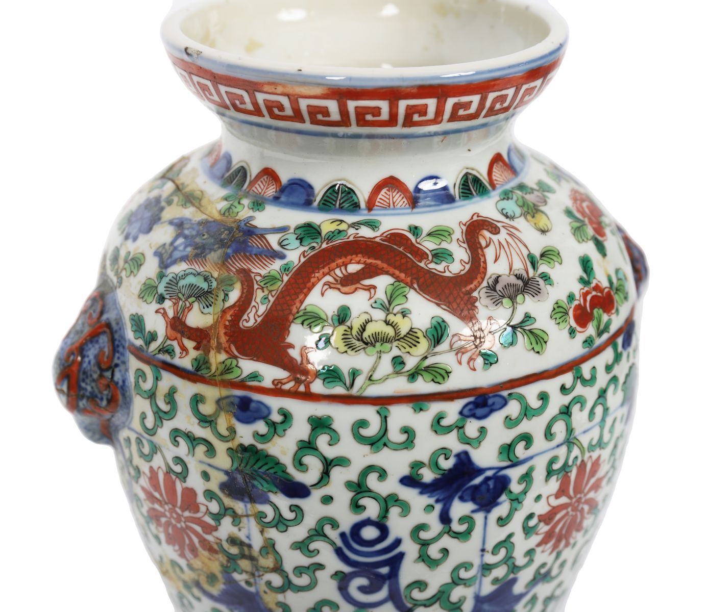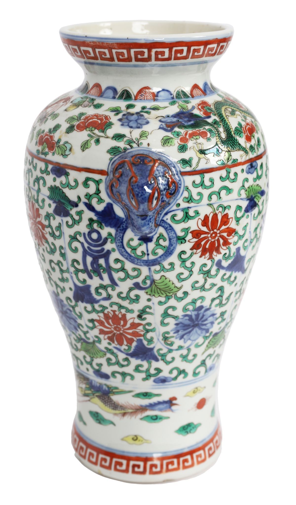 A Chinese polychrome porcelain vase of baluster form, decorated with scrolling foliage, stylised flowers and auspicious motifs in famille verte tones, the neck and foot with key-pattern borders, the lower section incorporating a dragon and cloud motifs.