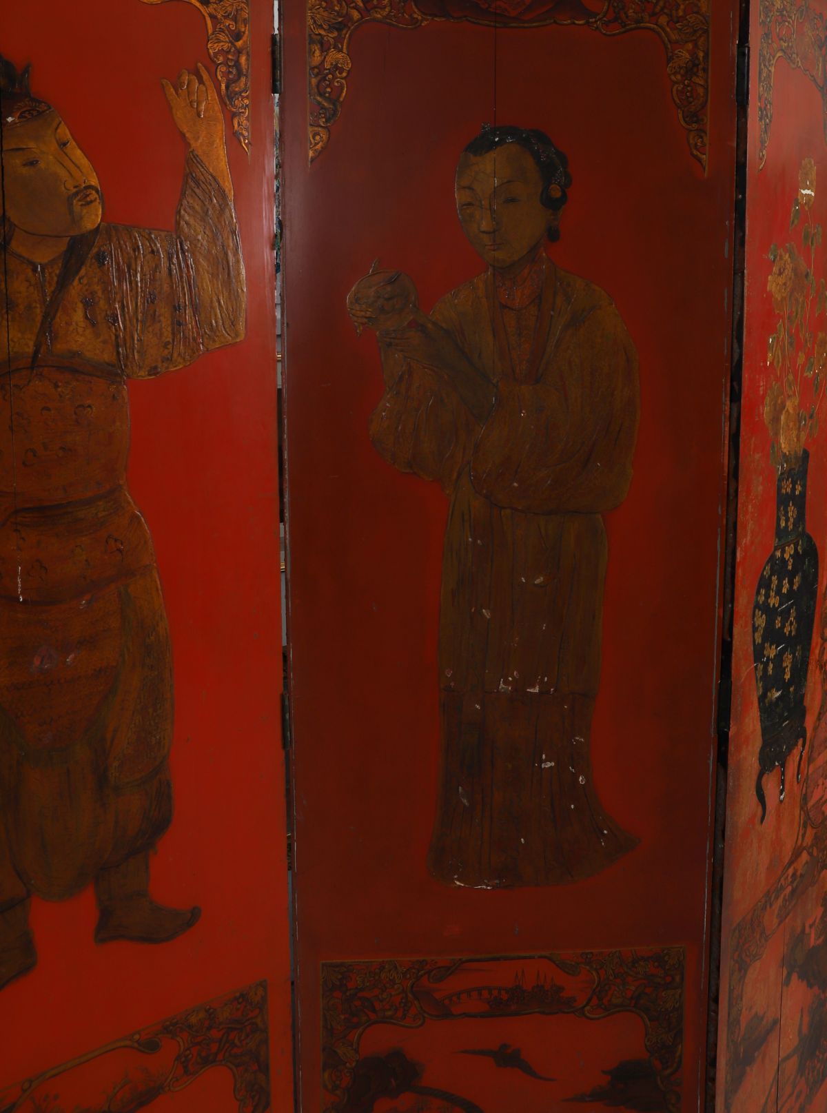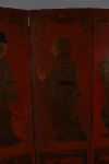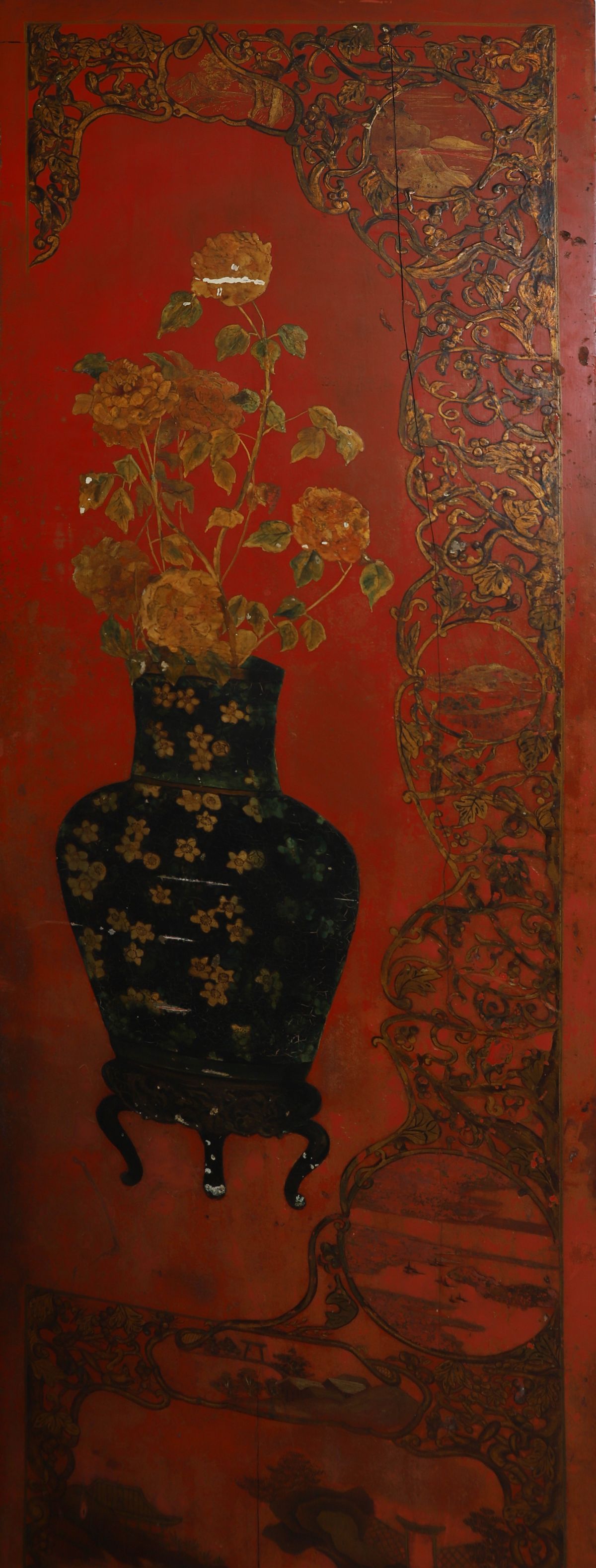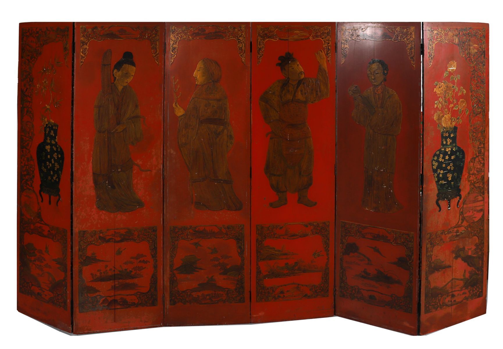 A late 18th-century Chinese lacquered folding screen, composed of multiple hinged panels, decorated in polychrome and gilt on a red ground. The panels painted with elegant standing figures in traditional dress, floral arrangements in vases, and landscape and scrollwork borders. The reverse decorated with complementary lacquered scenes. Qing Dynasty, late 18th century.
