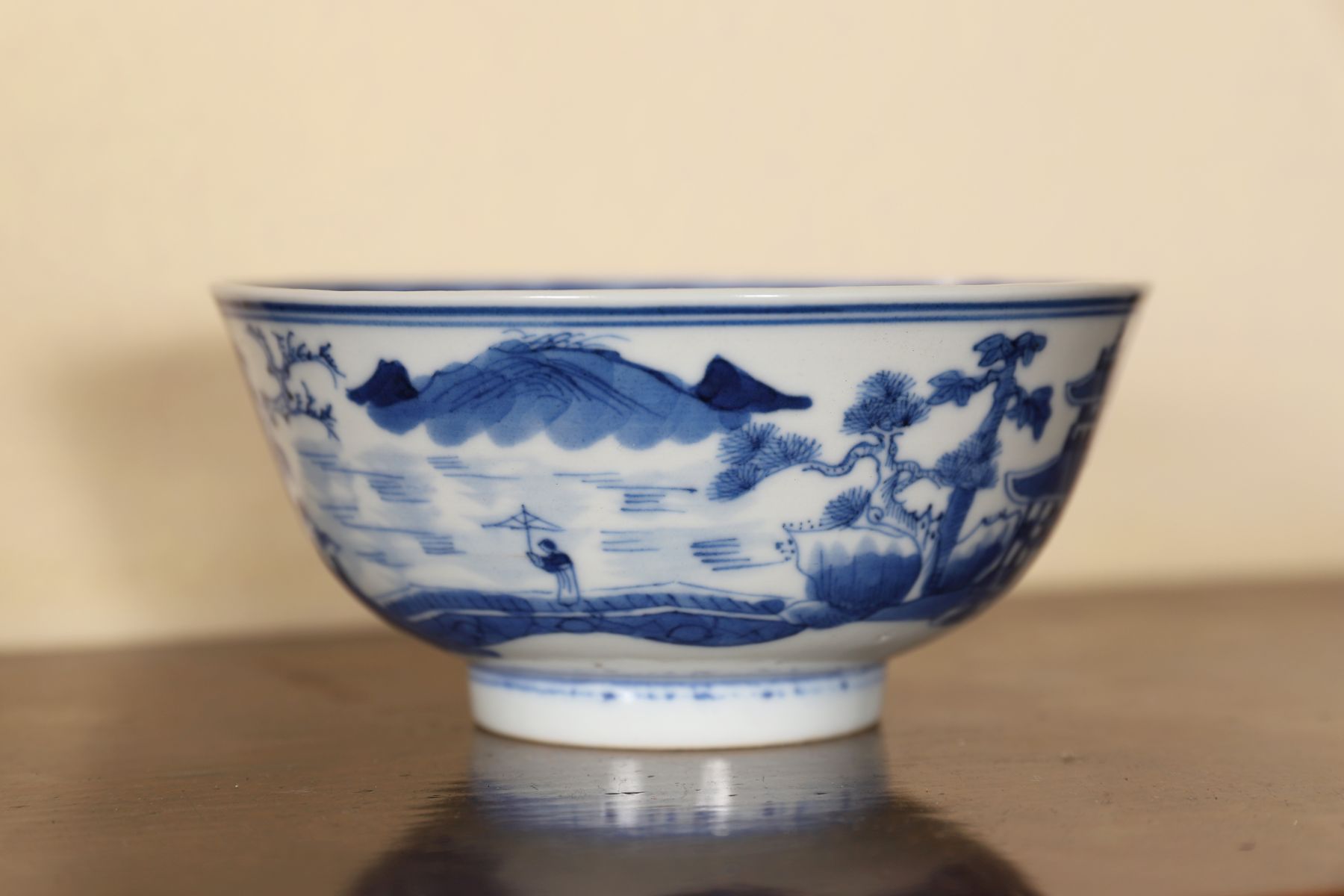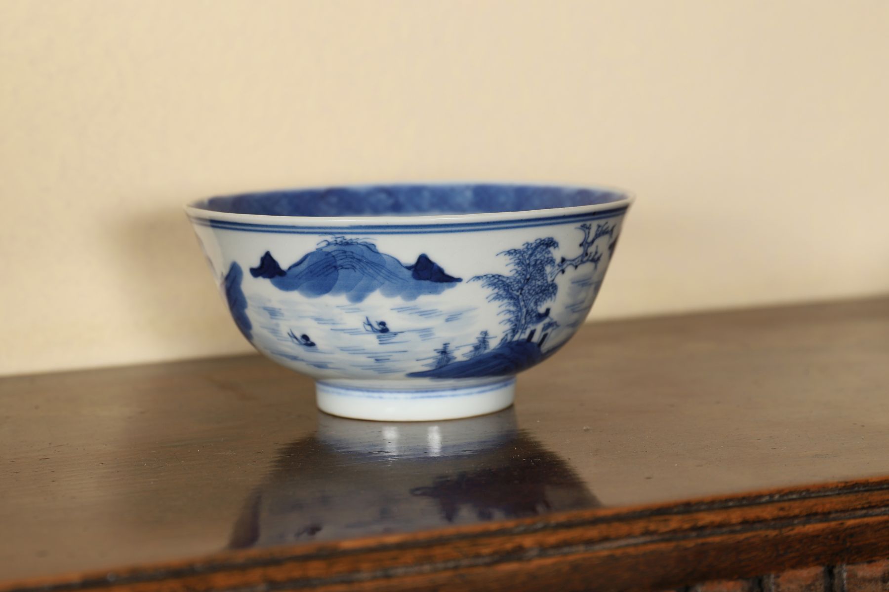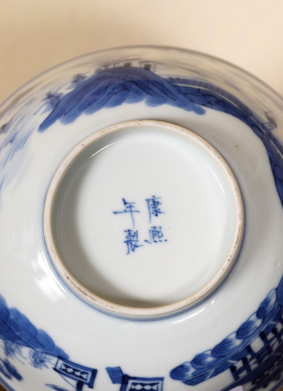 A Chinese Qing blue and white bowl of rounded form, decorated in cobalt blue with landscape and architectural motifs to the exterior. The interior with central painted medallion beneath a patterned border at the rim. The base bearing a painted character mark.