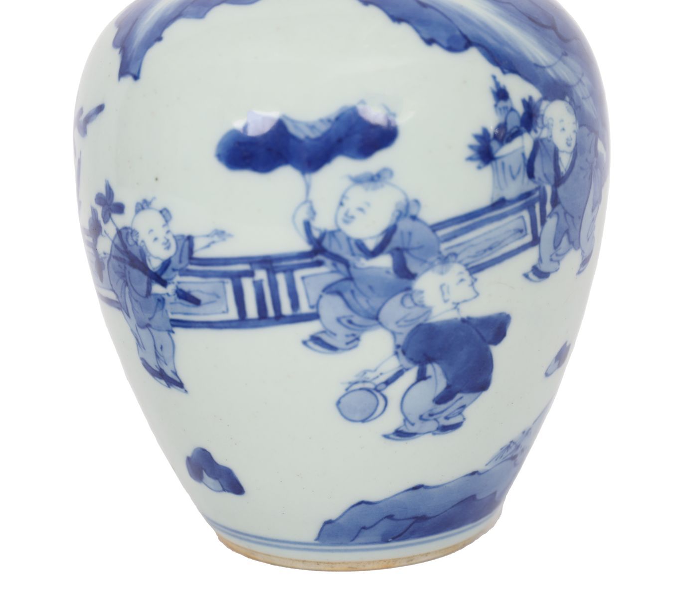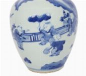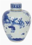 A Chinese Qing blue and white ginger jar and cover, decorated with figural and landscape scenes in underglaze blue, the domed cover similarly decorated.